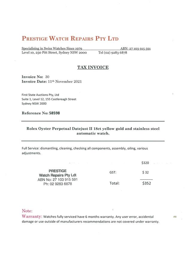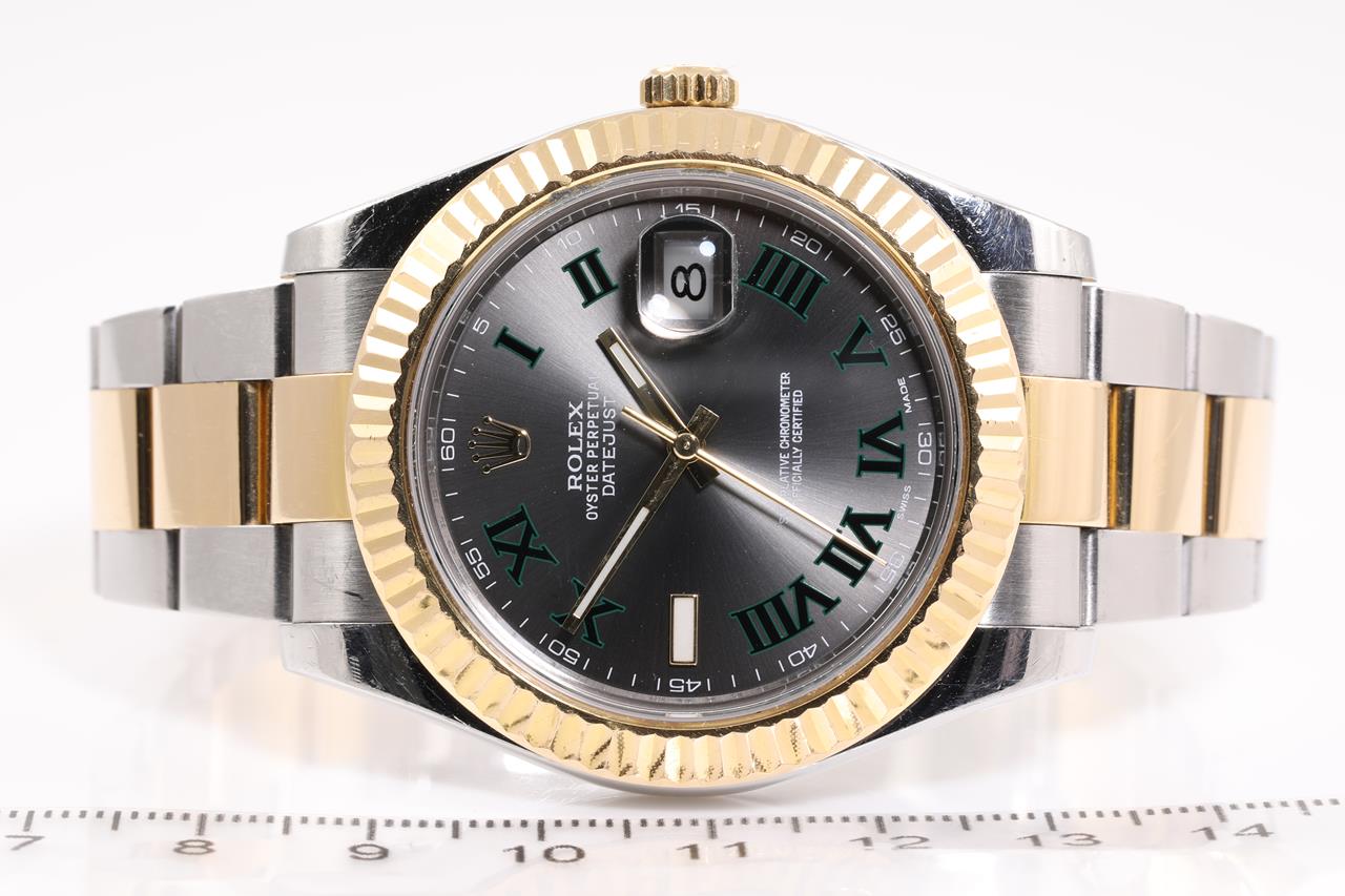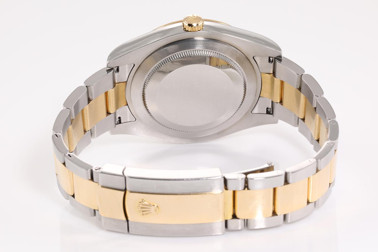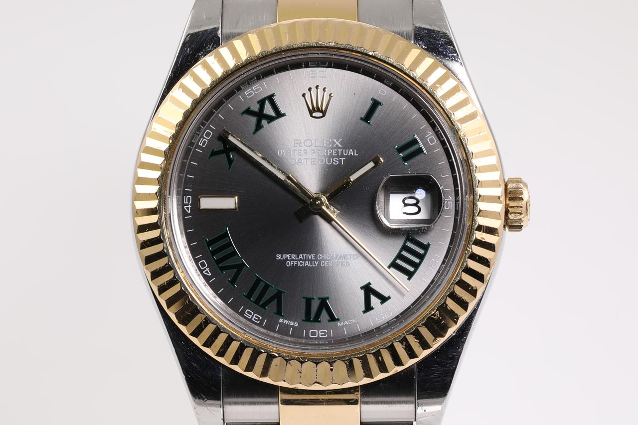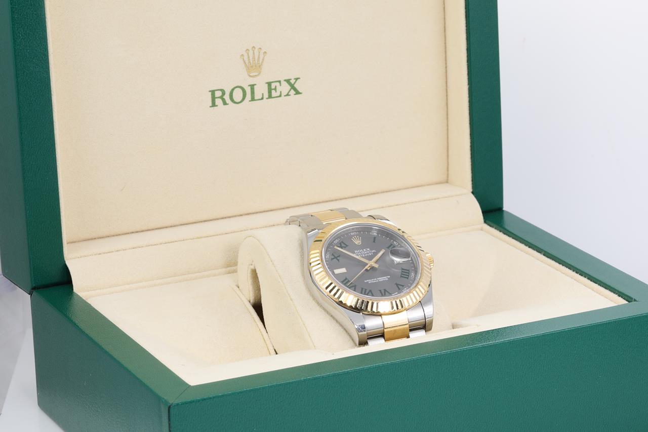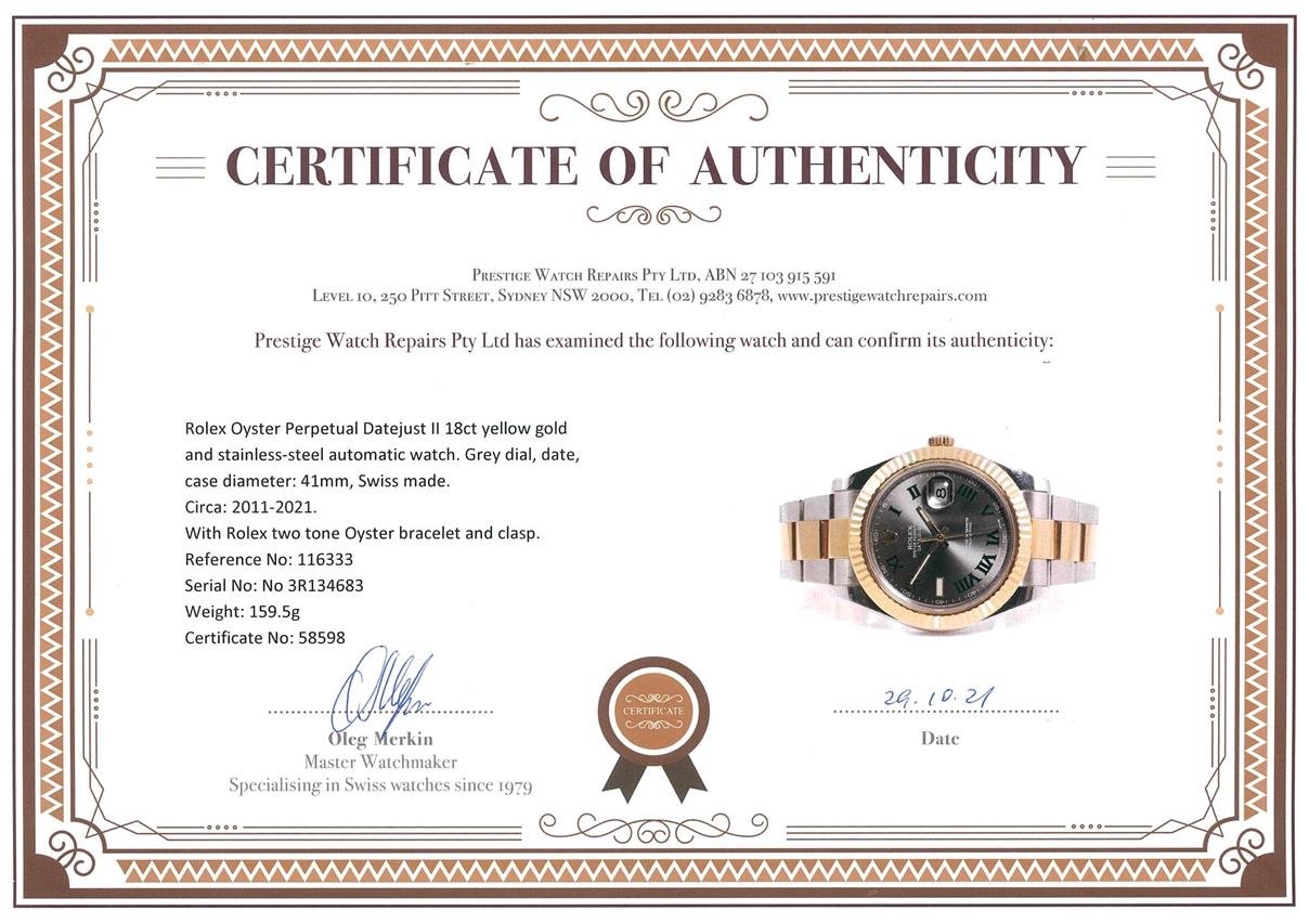Rolex Oyster Perpetual Datejust II 18ct yellow gold and stainless steel automatic watch. Grey dial, date, case diameter: 41mm, wrist size: 19cm, Swiss made. Ref# 116333, Circa: 2011-2021. With Rolex two tone Oyster bracelet and clasp. With certificate of authenticity, Rolex international guarantee card dated 12/9/14 and Rolex box. 6 month Prestige Watchmaker warranty from the date of full service. (Pre-owned)