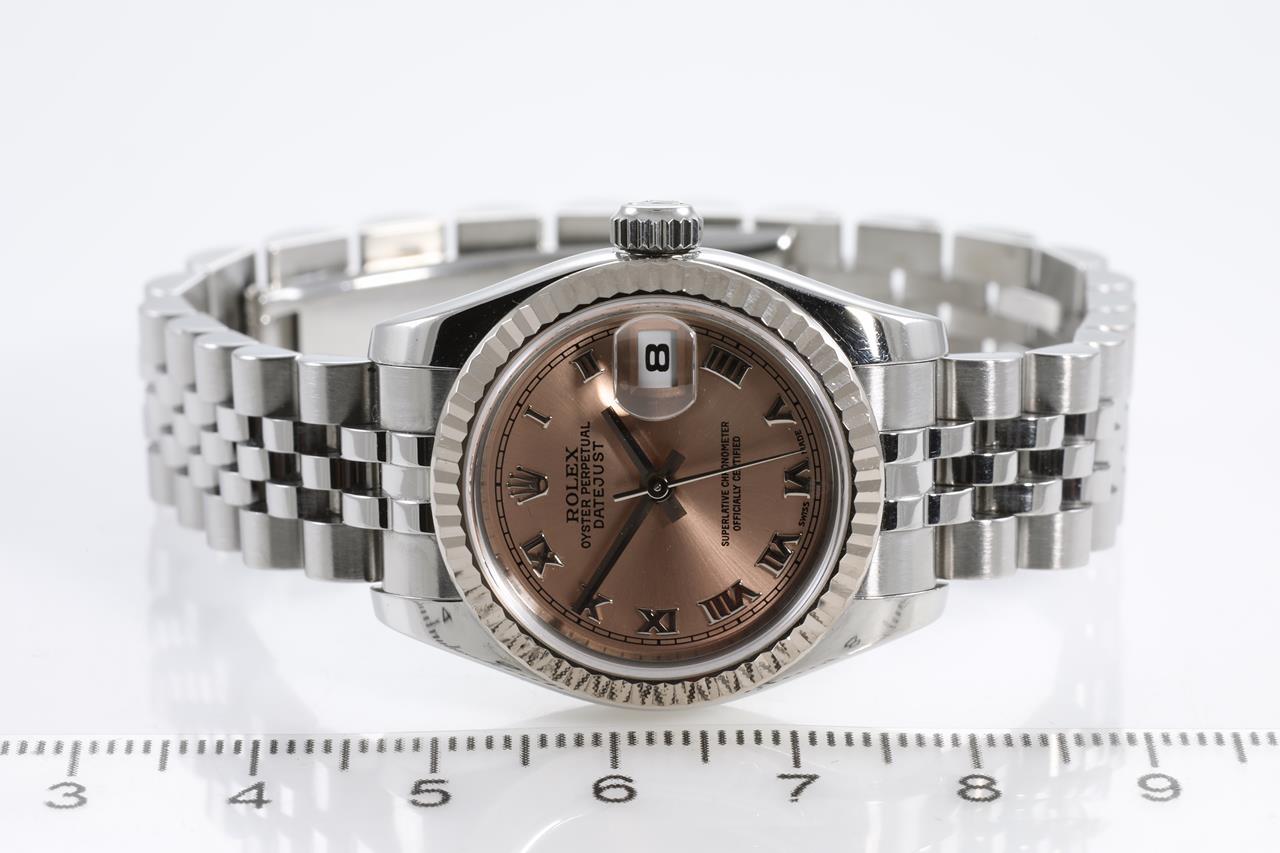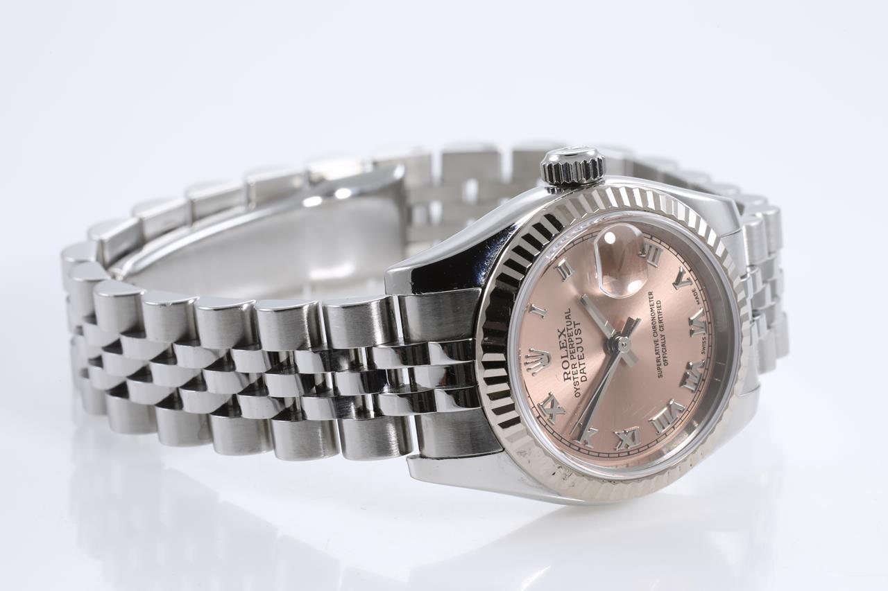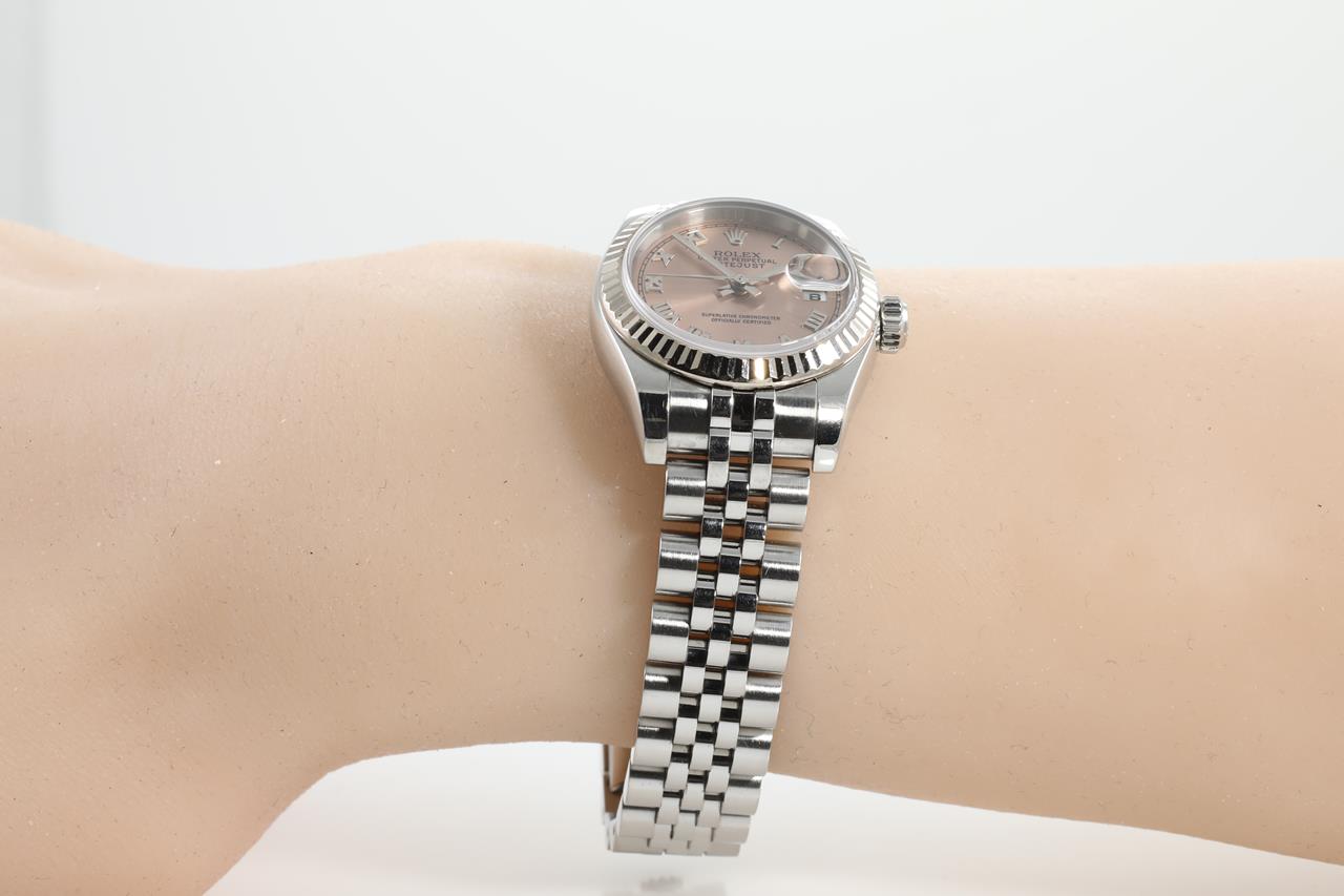 Rolex Oyster Perpetual Datejust 18ct gold & stainless steel ladies automatic watch. Pink dial, 18ct white gold flutted bezel, date, wrist size: 15.5cm, case diameter: 26mm, Swiss Made. Ref# 179174, Circa: 2005. With Rolex Jubilee bracelet and clasp. With Certificate of Authenticity and Rolex guarantee certificate. 3 month FSA warranty. (Pre-owned)