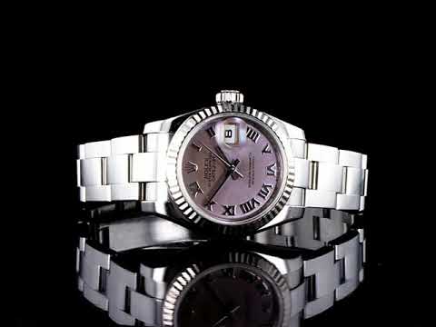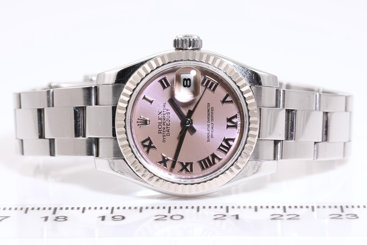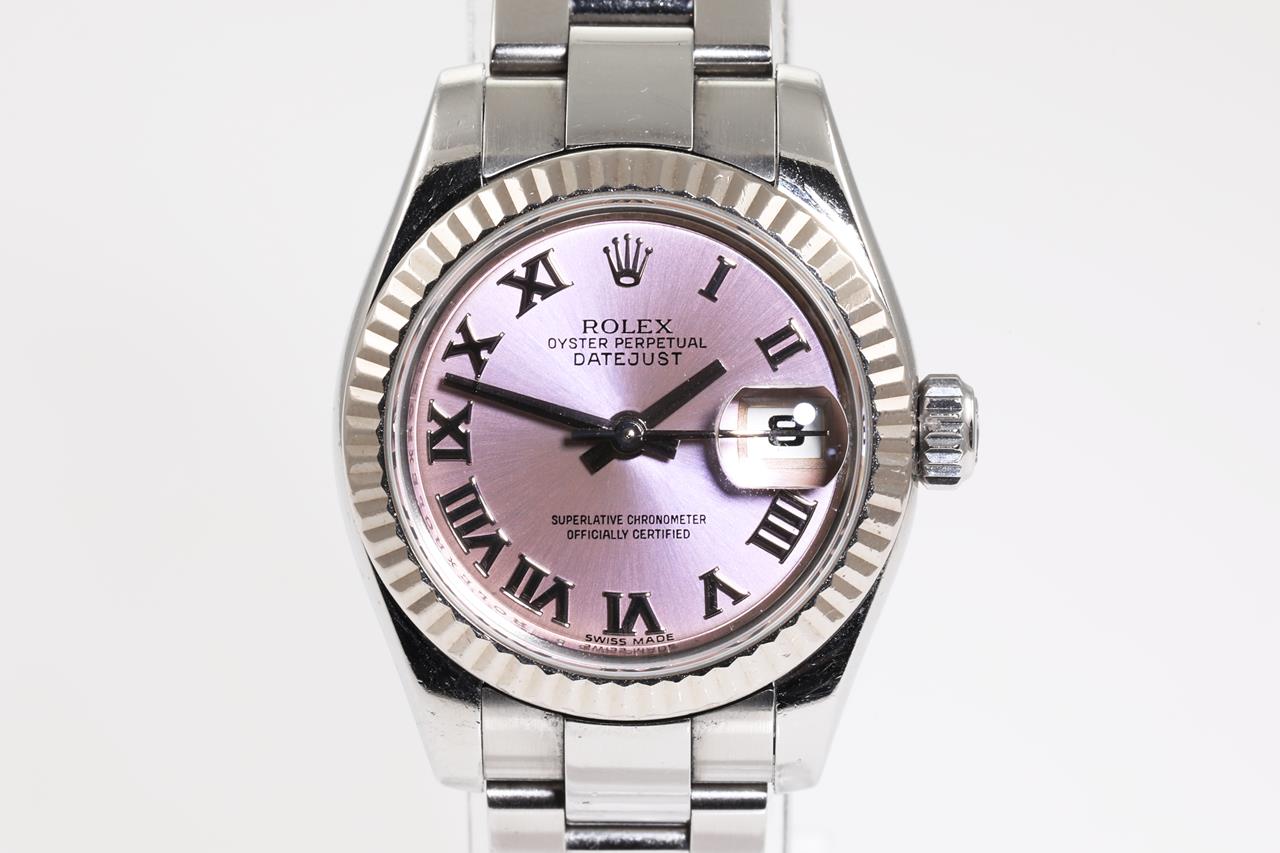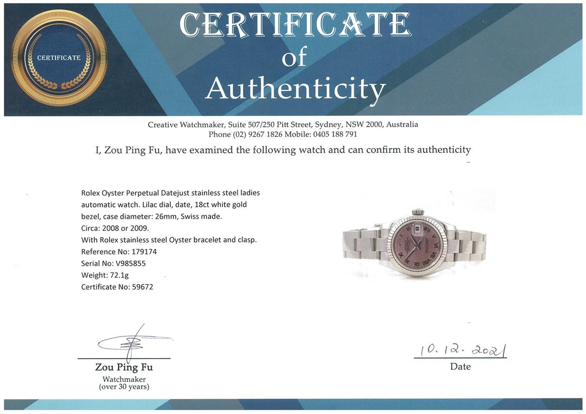 Rolex Oyster Perpetual Datejust stainless steel ladies automatic watch. Lilac dial, date, 18ct white gold bezel, wrist size: 16cm, case diameter: 26mm, Swiss made. Ref# 179174, Circa: 2008 or 2009. With Rolex stainless steel Oyster bracelet and clasp. With Certificate of Authenticity, Rolex International Warranty card dated 31/12/2010 and Rolex box. 3 month FSA warranty. (Pre-owned)