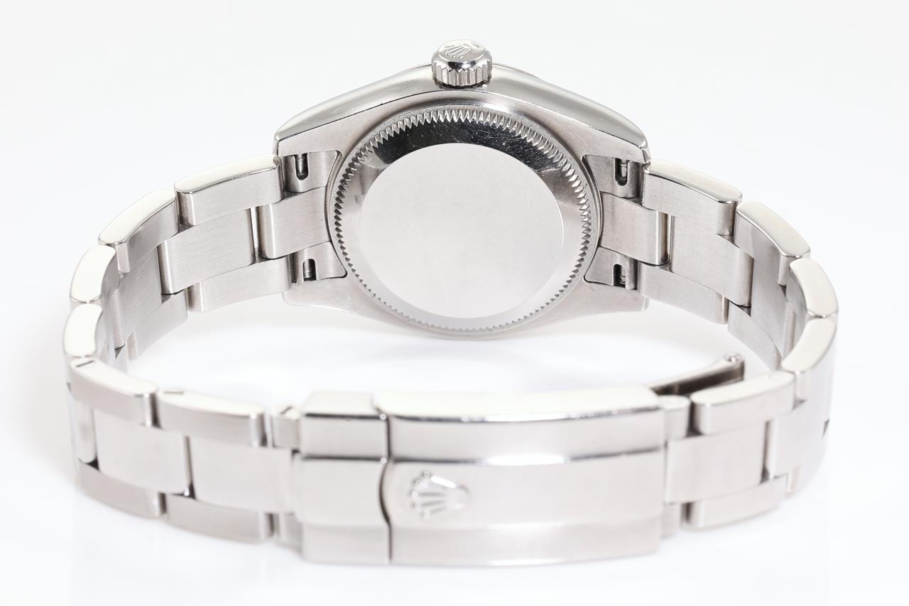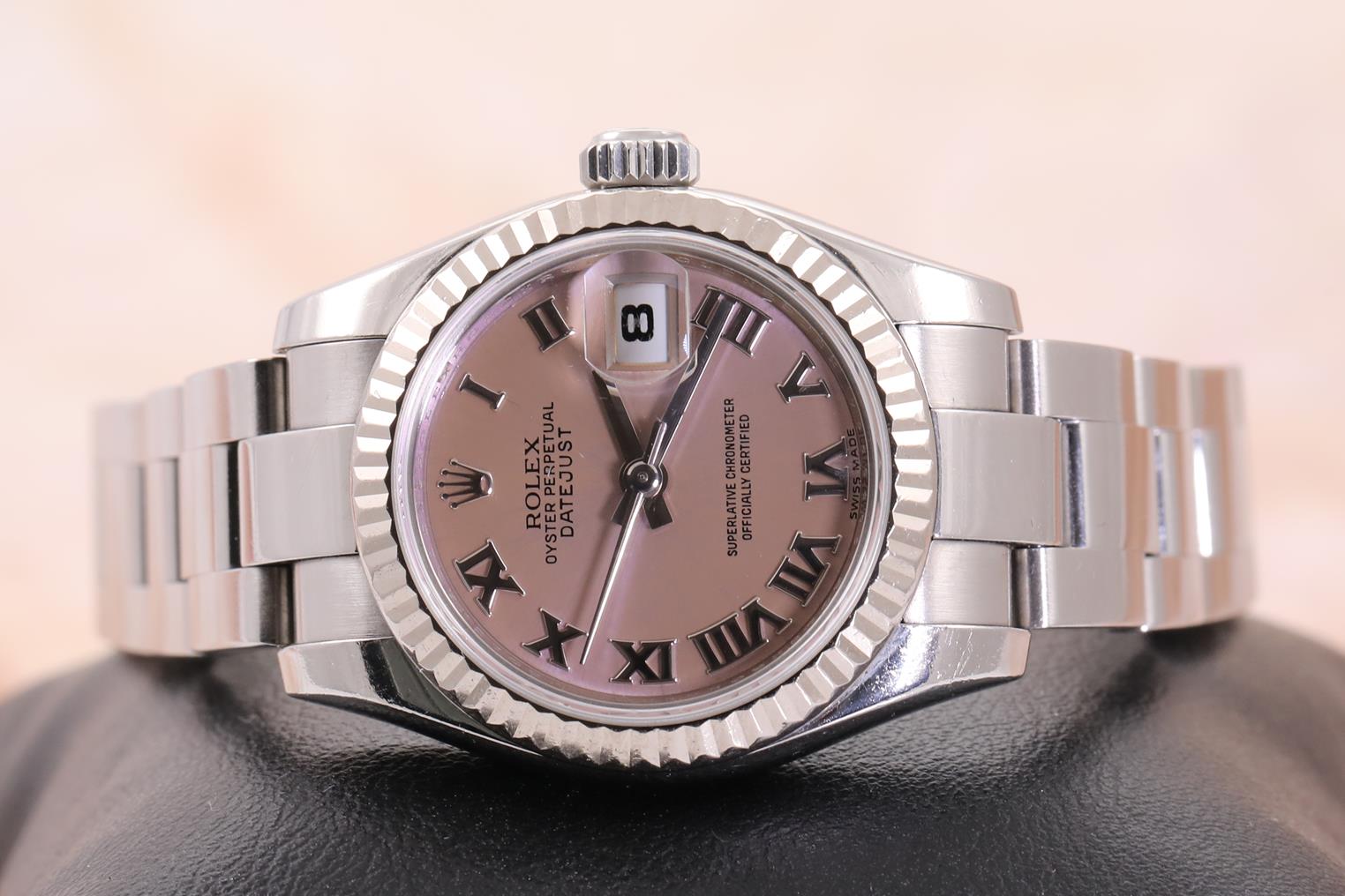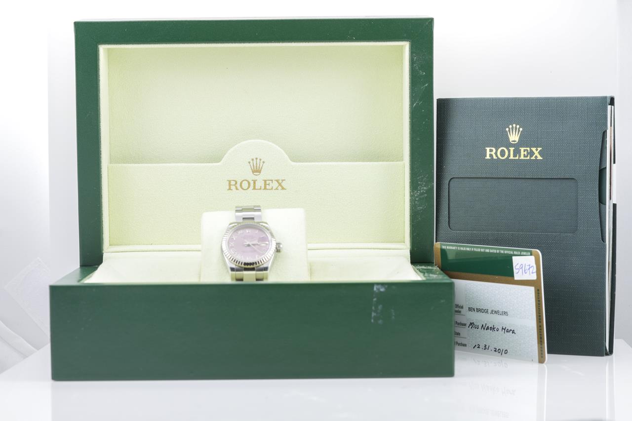 Rolex Oyster Perpetual Datejust stainless steel ladies automatic watch. Lilac dial, date, 18ct white gold bezel, wrist size: 16cm, case diameter: 26mm, Swiss made. Ref# 179174, Circa: 2008 or 2009. With Rolex stainless steel Oyster bracelet and clasp. With Certificate of Authenticity, Rolex International Warranty card dated 31/12/2010 and Rolex box. 3 month FSA warranty. (Pre-owned)