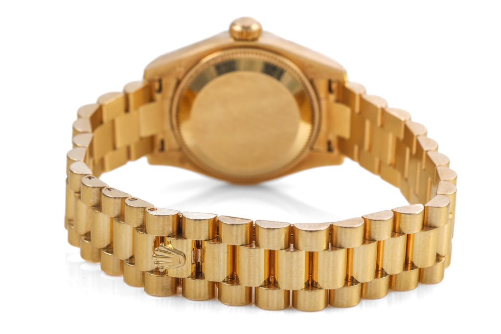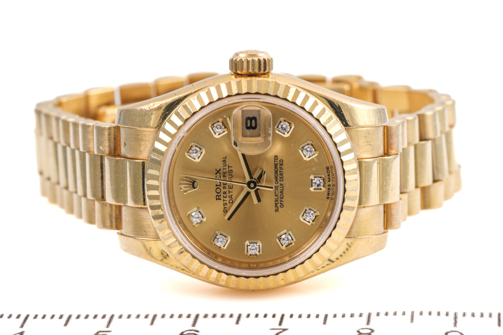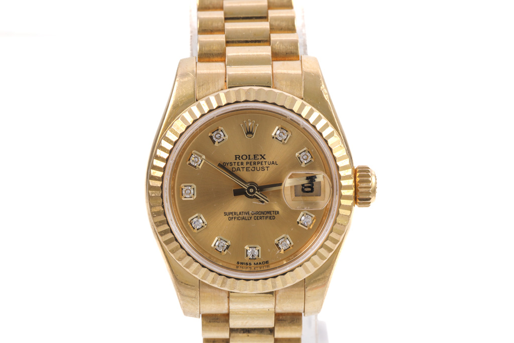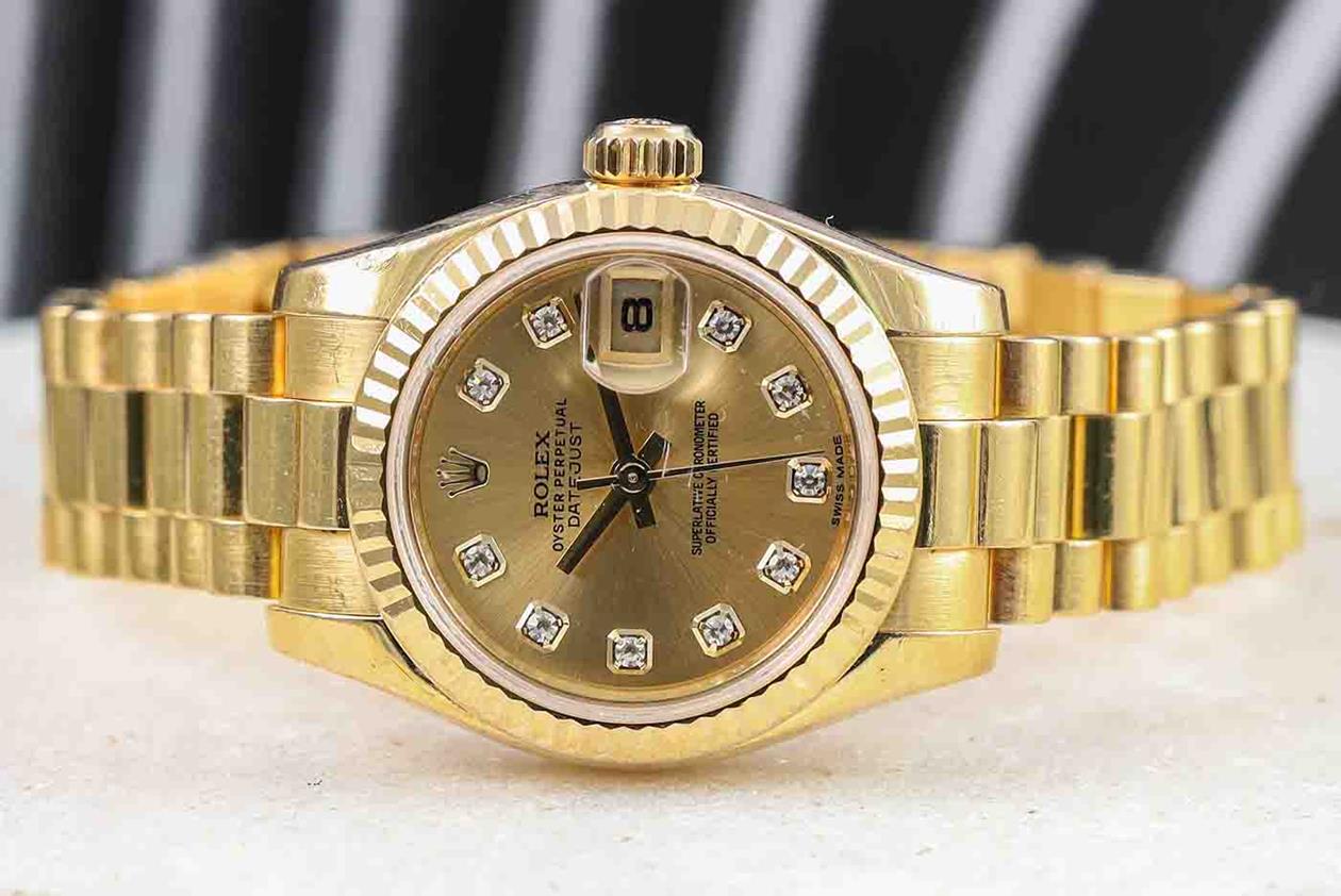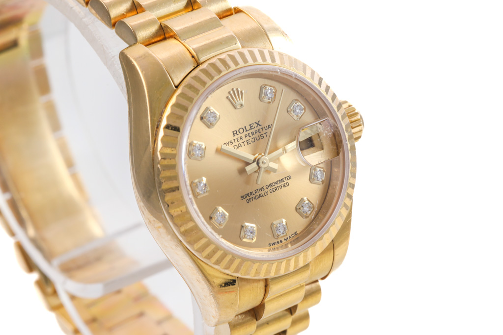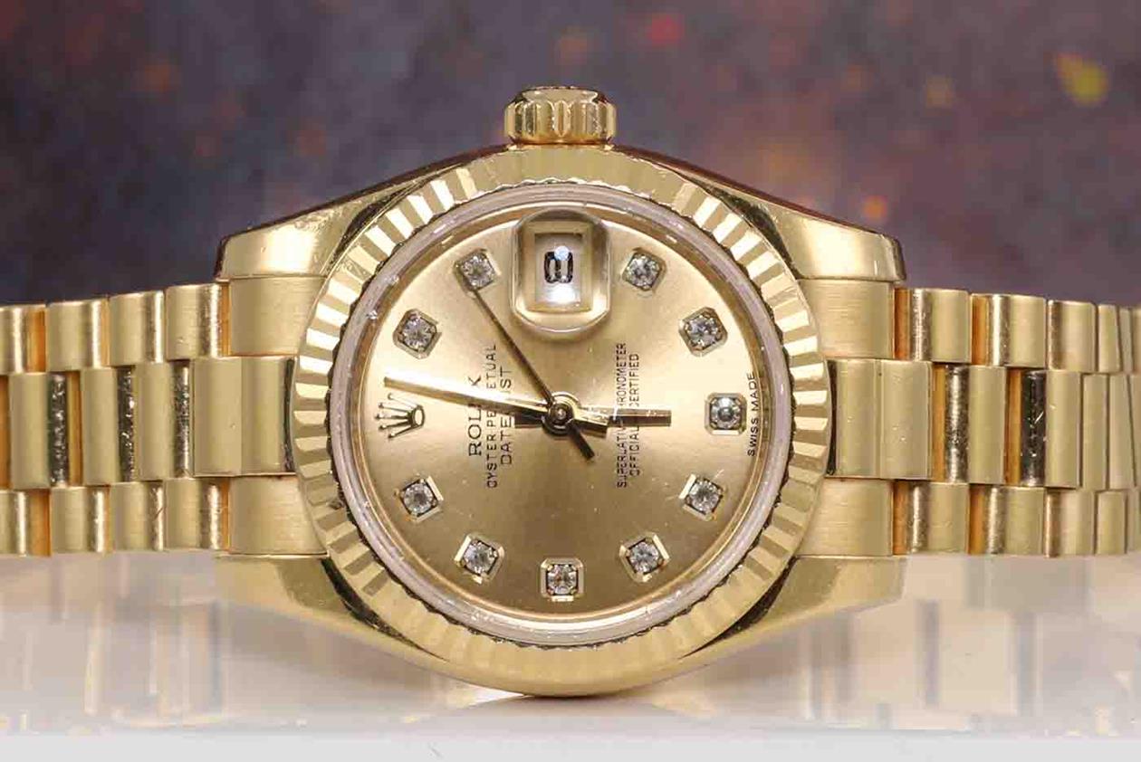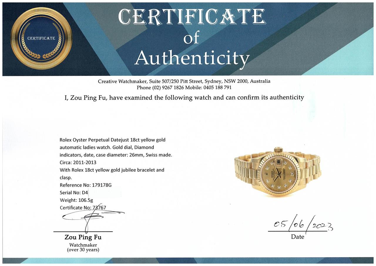 Rolex Oyster Perpetual Datejust 18ct yellow gold automatic ladies watch. Gold dial, Diamond indicators, date, case diameter: 26mm, wrist size: 16cm, Swiss made. Ref# 179178G. Circa: 2011-2023. With Rolex 18ct yellow gold jubilee bracelet and clasp. With Certificate of Authenticity, Rolex International Guarantee card dated 25/06/2015 and Rolex box. 3 month FSA warranty. (Pre-owned)