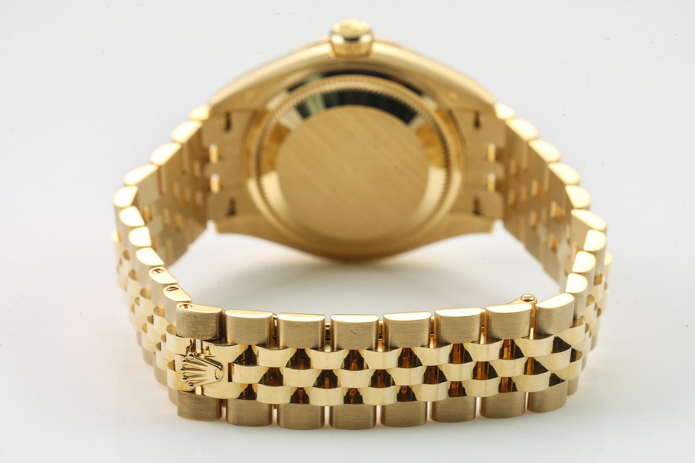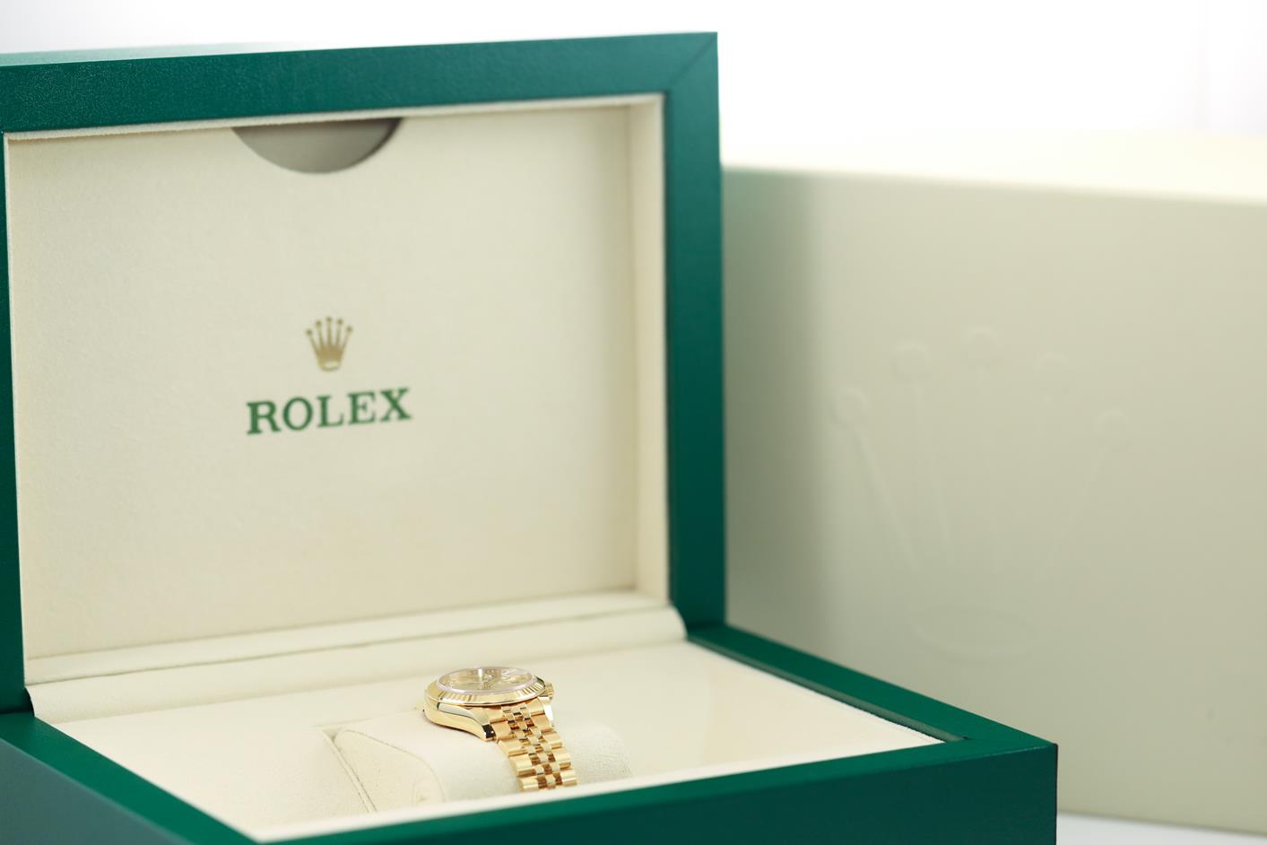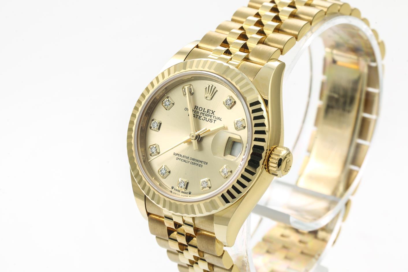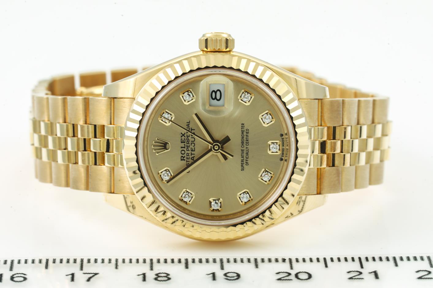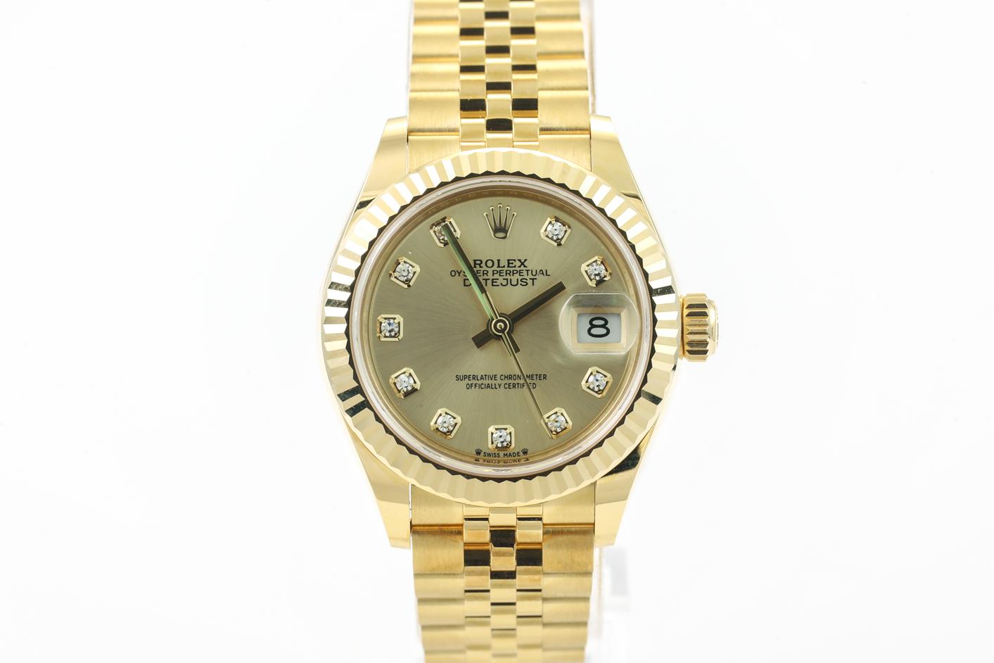 Rolex Oyster Perpetual Datejust 18ct yellow gold automatic ladies watch. Gold dial, date, Diamond indicators, case diameter: 28mm, wrist size: 15.5cm, Swiss made. Ref# 279178G. With Rolex 18ct yellow gold Jubilee bracelet and clasp. Rolex International Warranty card dated 06/03/2022 and Rolex box. Balance of 5 years Rolex manufactory warranty applies. (Pre-owned)