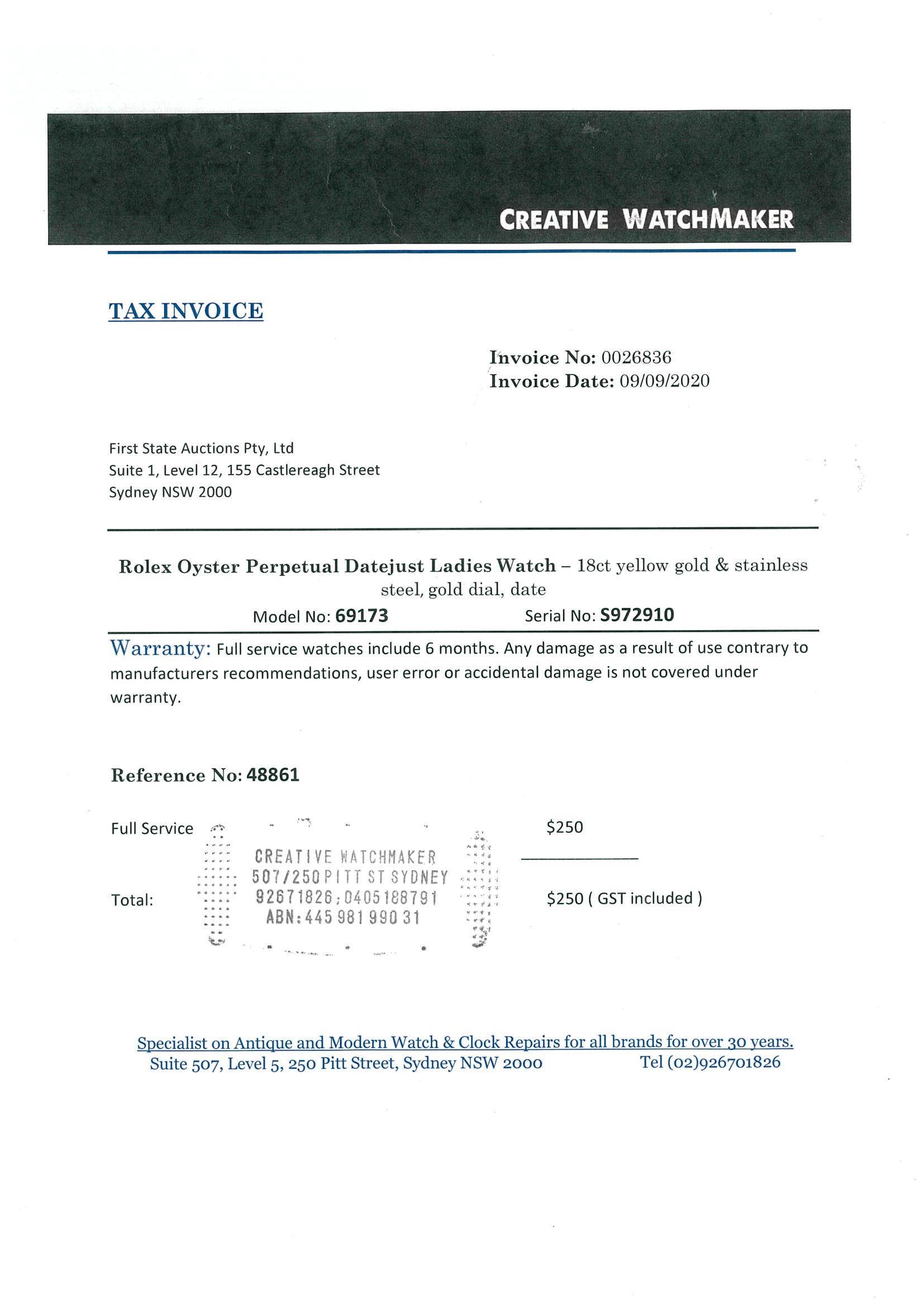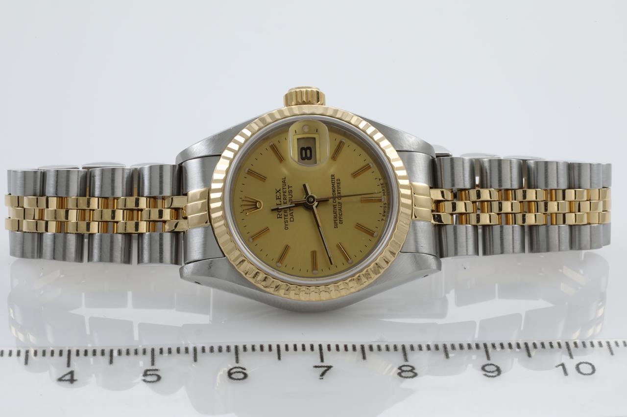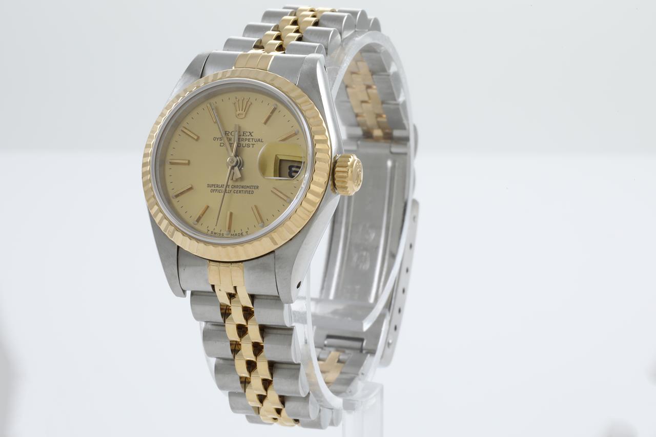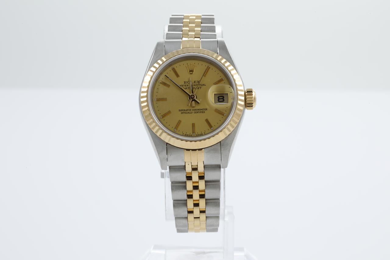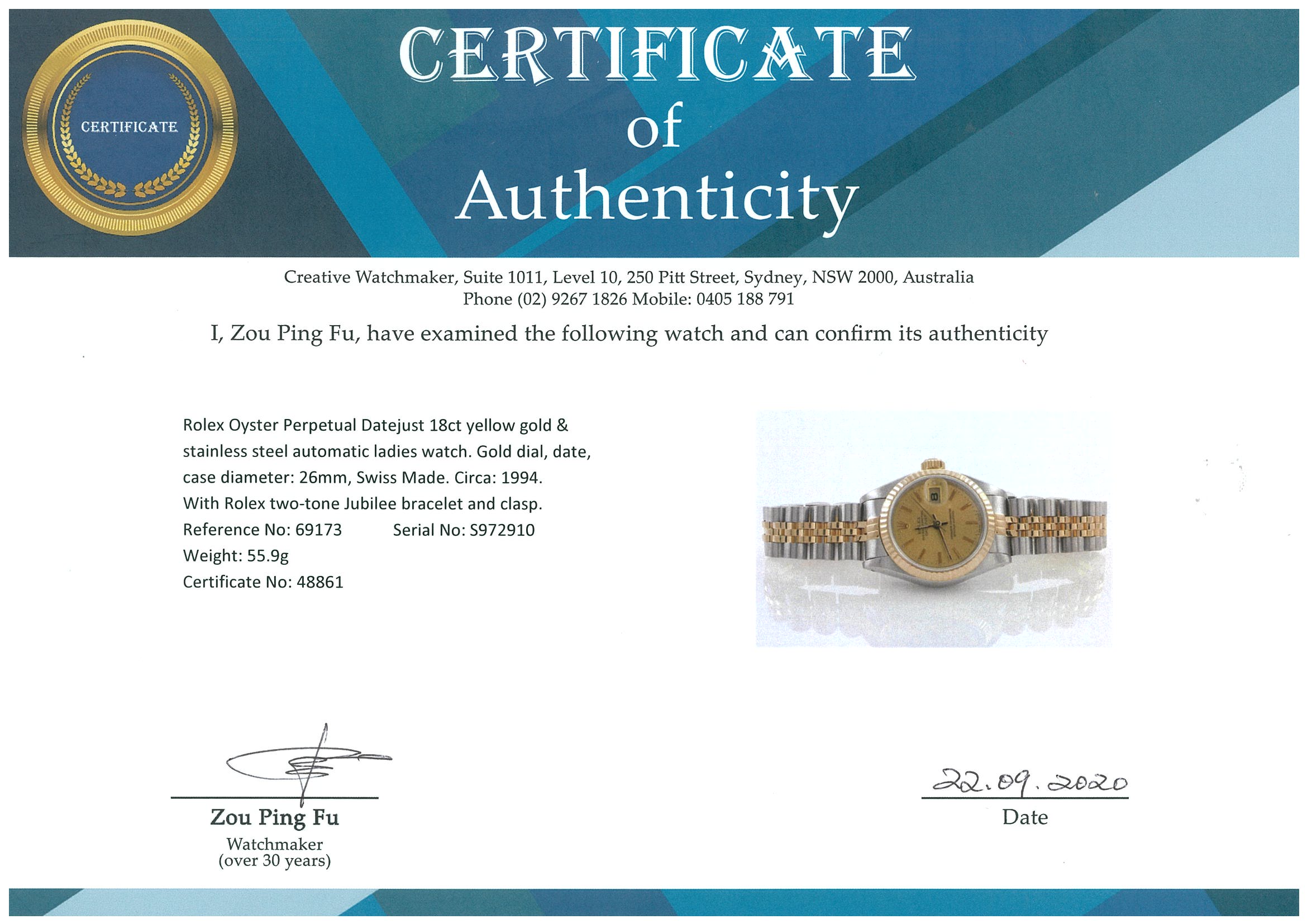 Rolex Oyster Perpetual Datejust 18ct yellow gold & stainless steel automatic ladies watch. Gold dial, date, case diameter 26mm, wrist size 16cm, Swiss Made. Note: minor chipped on the glass. Ref# 69173, Circa 1994. With Rolex two-tone bracelet & clasp. With certificate of authenticity & Rolex guarantee certificate. 6 month Creative watchmaker warranty from the date of full service. (Pre-owned)