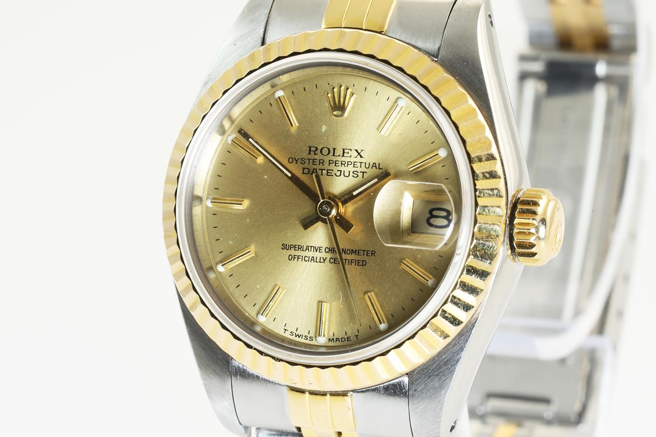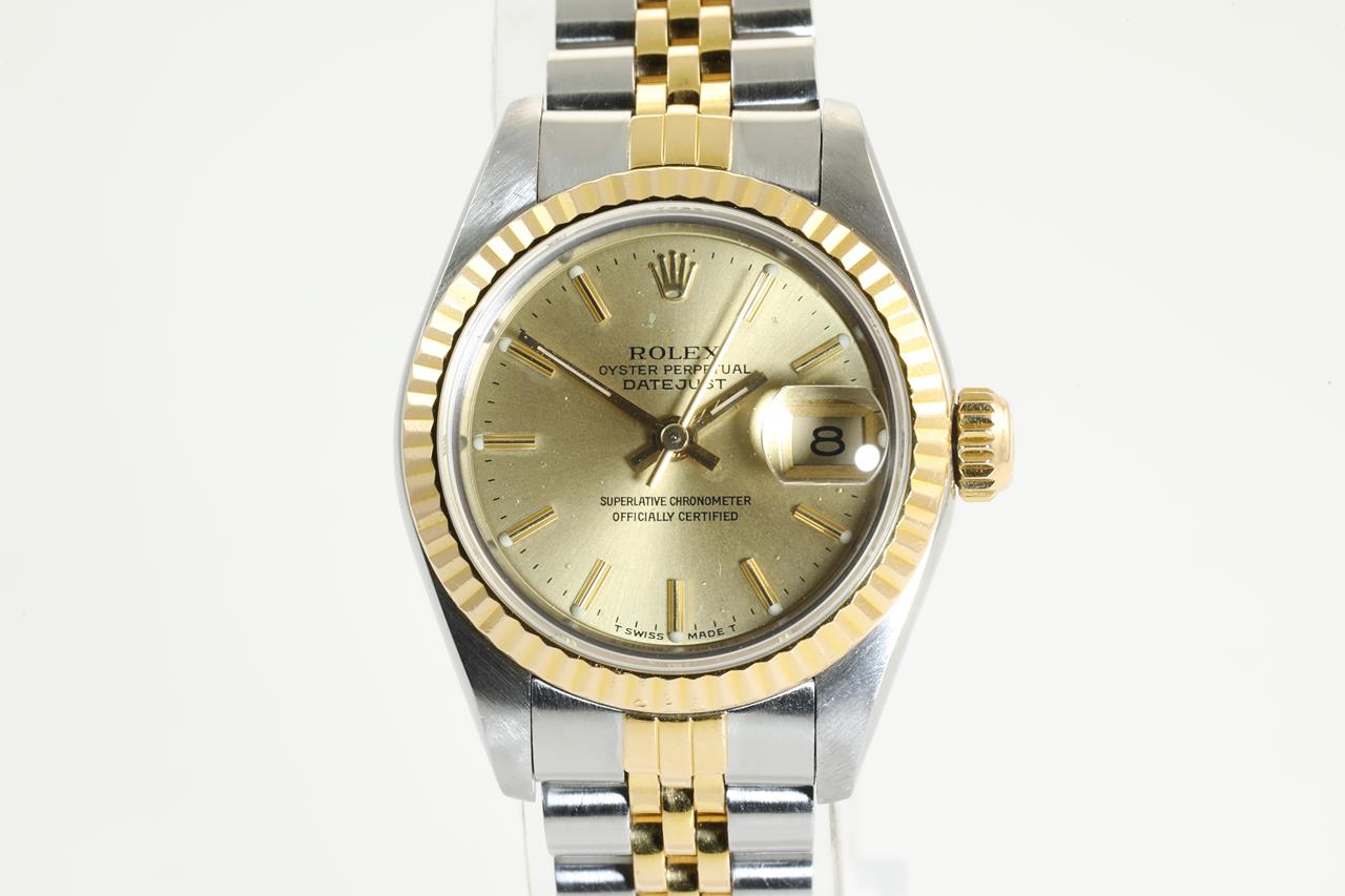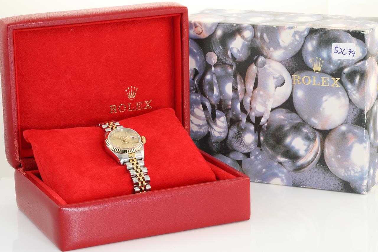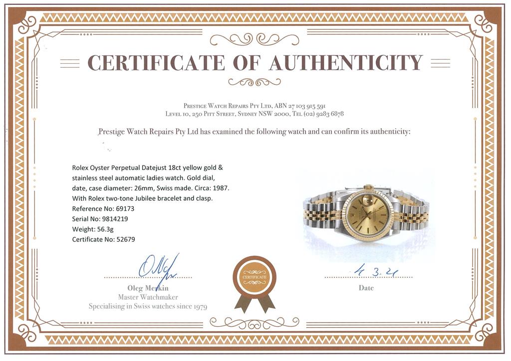Rolex Oyster Perpetual Datejust 18ct yellow gold & stainless steel automatic ladies watch. Gold dial, date, case diameter: 26mm, wrist size: 15.5cm. Swiss Made. Ref# 69173, Circa: 1987. With Rolex two-tone Jubilee bracelet and clasp. With certificate of authenticity, 6 month Prestige watchmaker warranty from the date of full service and Rolex box. 3 month FSA warranty. (Pre-owned)
