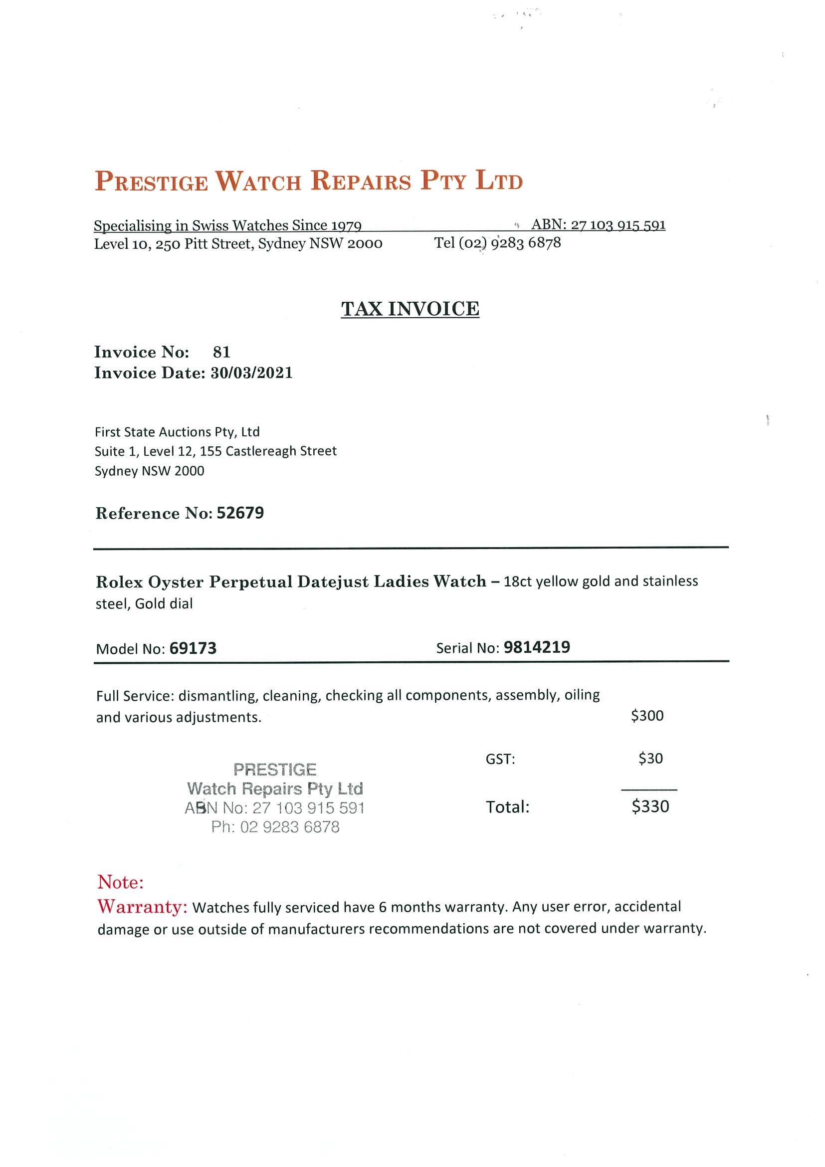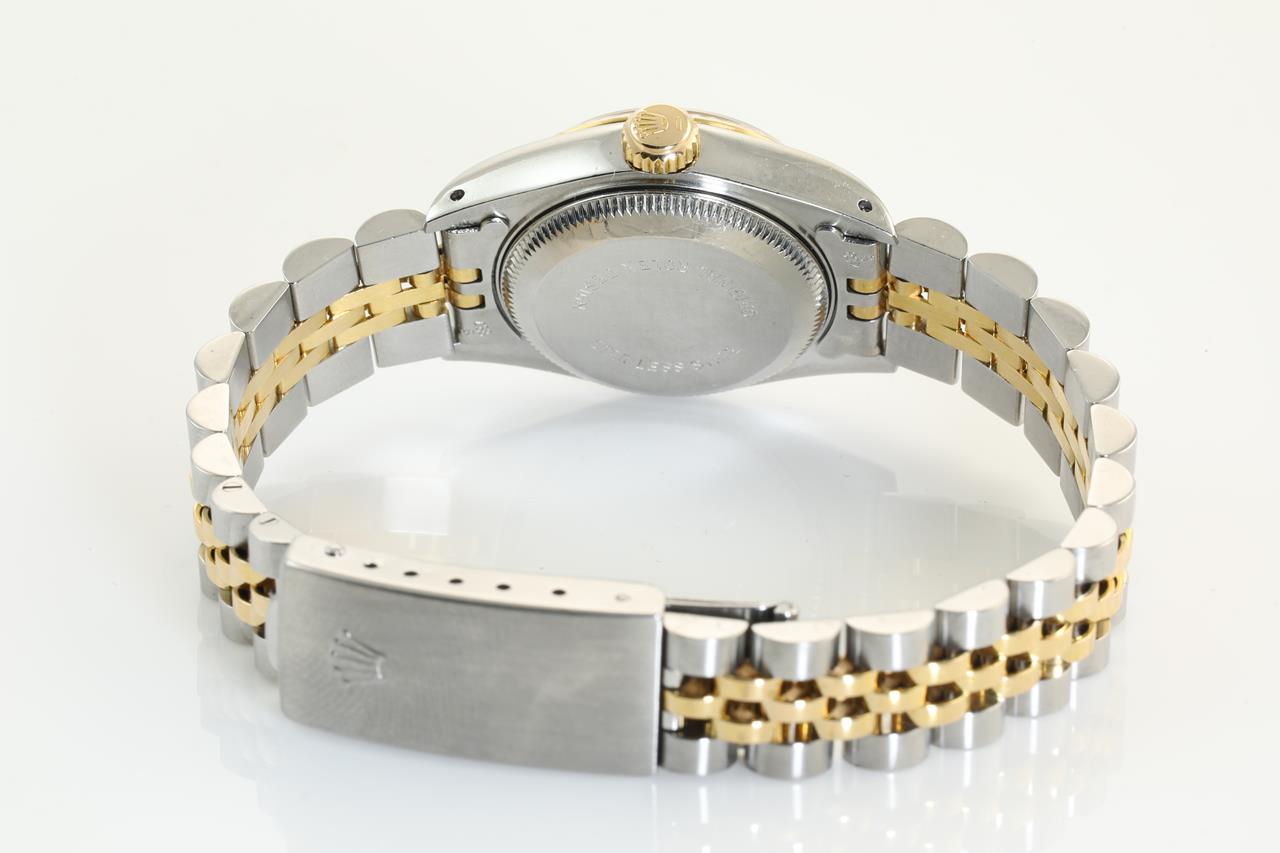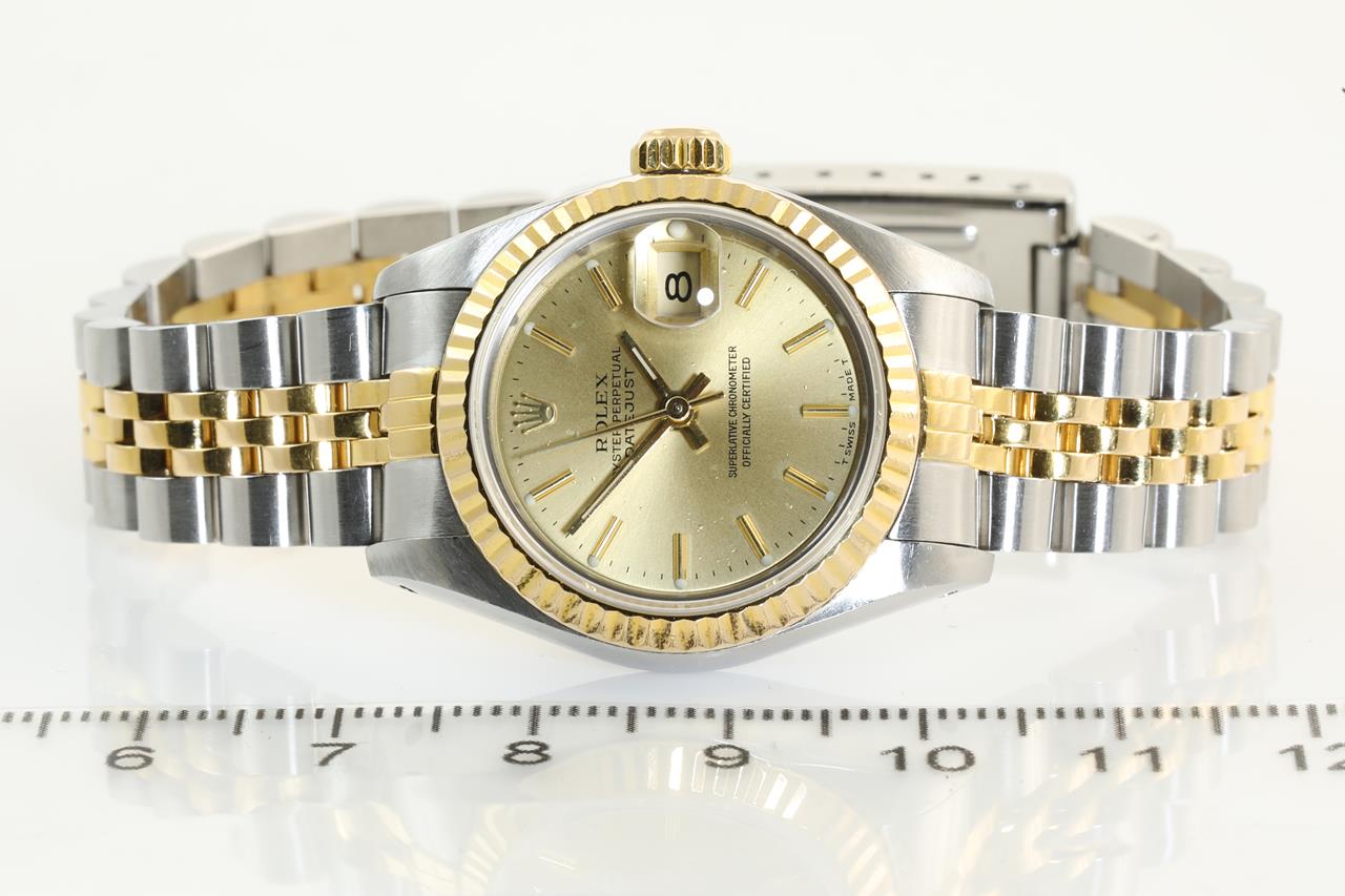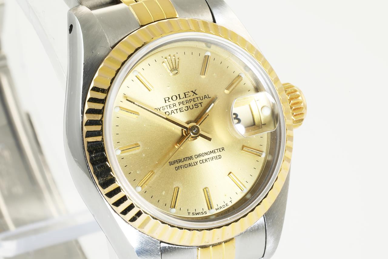 Rolex Oyster Perpetual Datejust 18ct yellow gold & stainless steel automatic ladies watch. Gold dial, date, case diameter: 26mm, wrist size: 15.5cm. Swiss Made. Ref# 69173, Circa: 1987. With Rolex two-tone Jubilee bracelet and clasp. With certificate of authenticity, 6 month Prestige watchmaker warranty from the date of full service and Rolex box. 3 month FSA warranty. (Pre-owned)