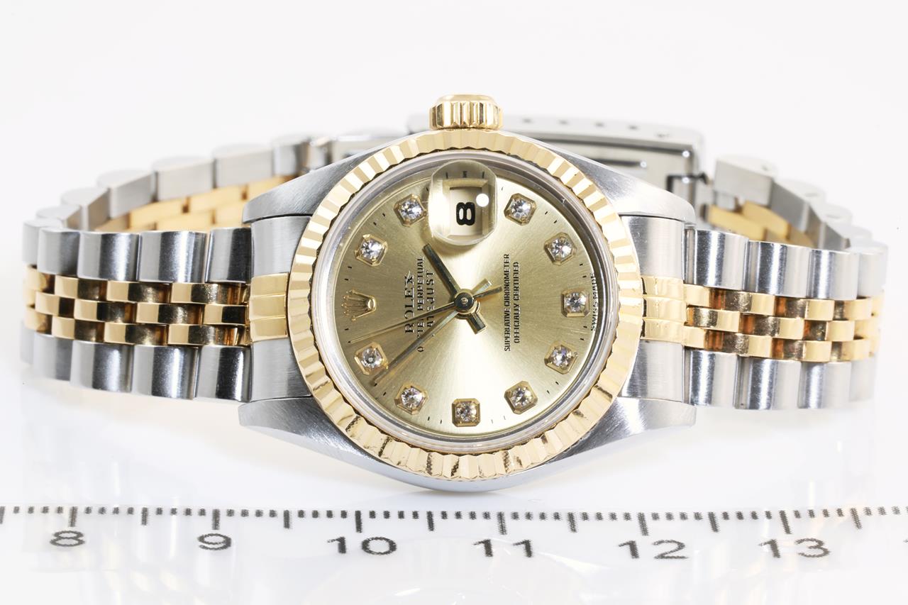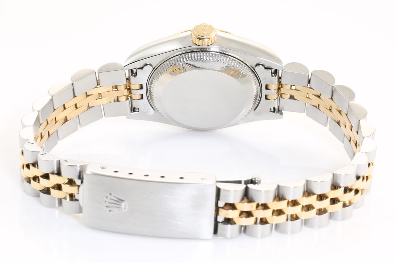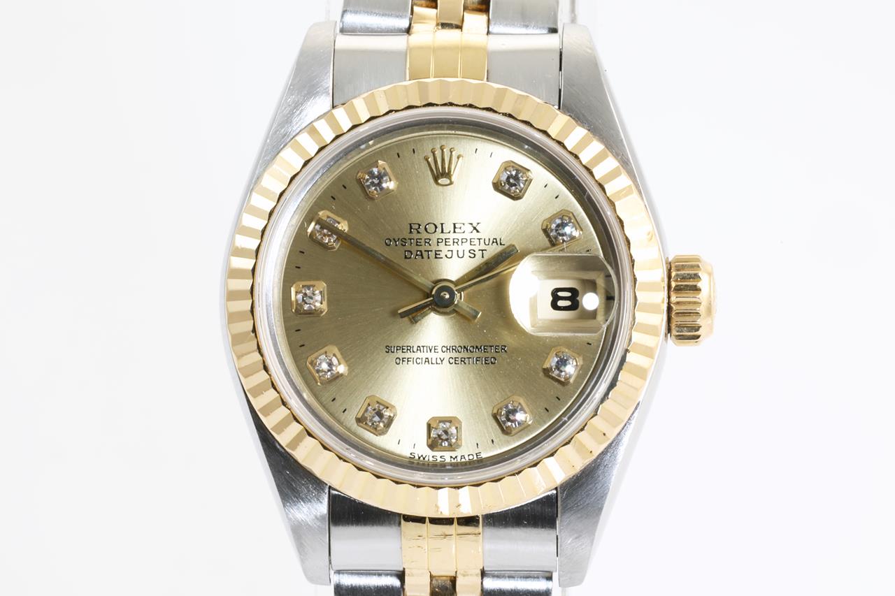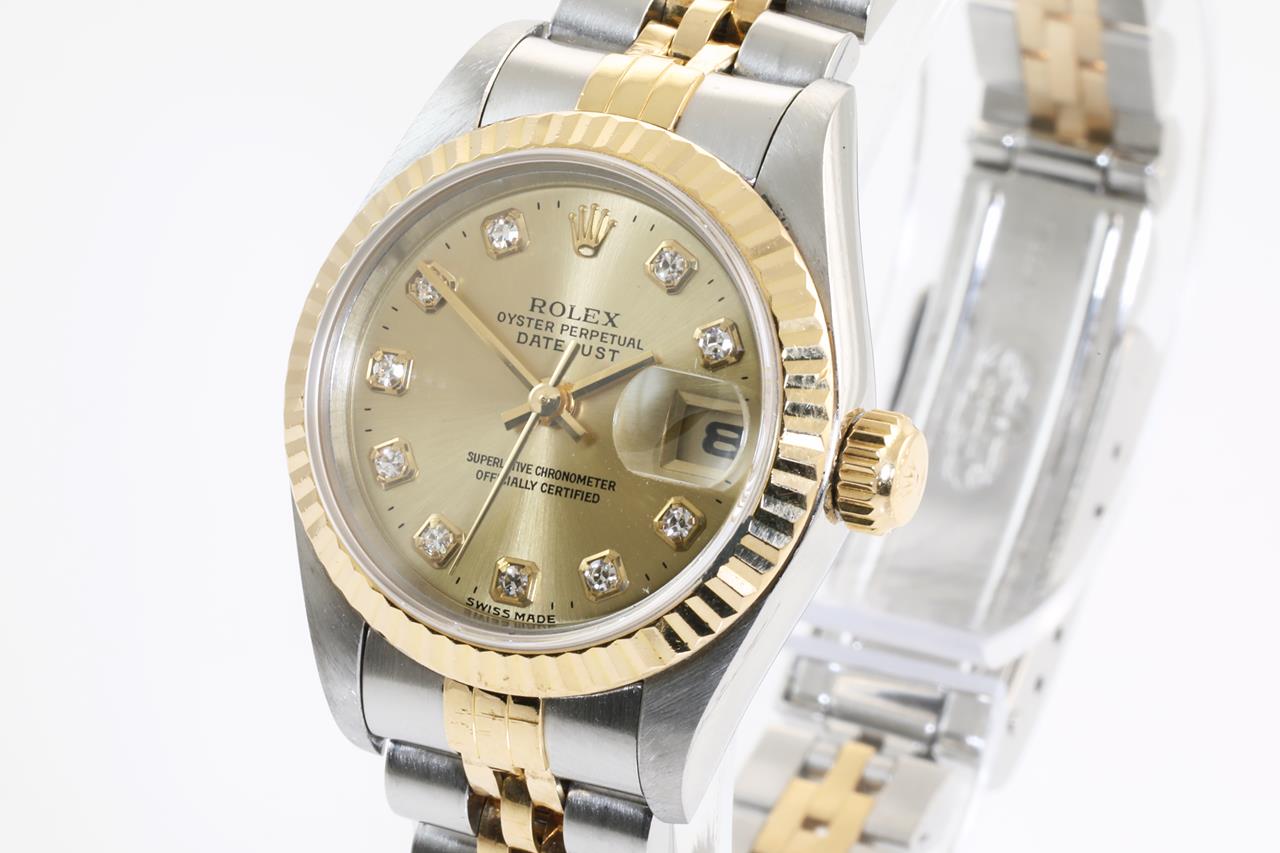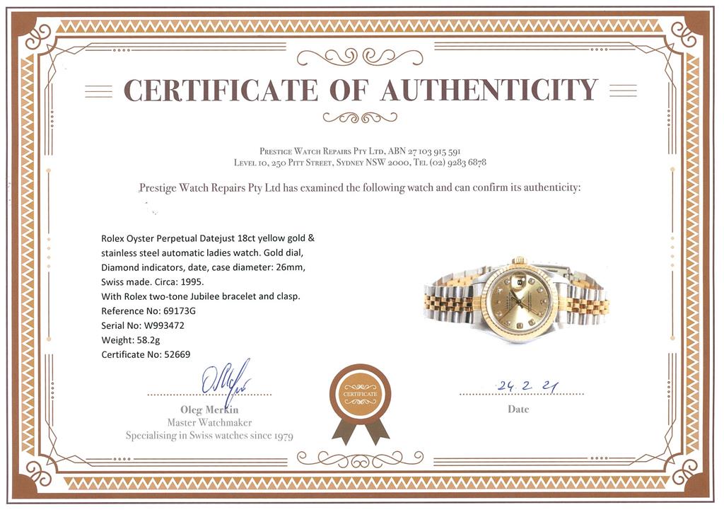 Rolex Oyster Perpetual Datejust 18ct yellow gold & stainless steel automatic ladies watch. Gold dial, Diamond indicators, date, case diameter: 26mm, wrist size: 15.5cm, Swiss made. Ref# 69173G, Circa: 1995. With Rolex two-tone Jubilee bracelet and clasp. With Certificate of authenticity and Rolex box. 3 month FSA warranty. (Pre-owned)