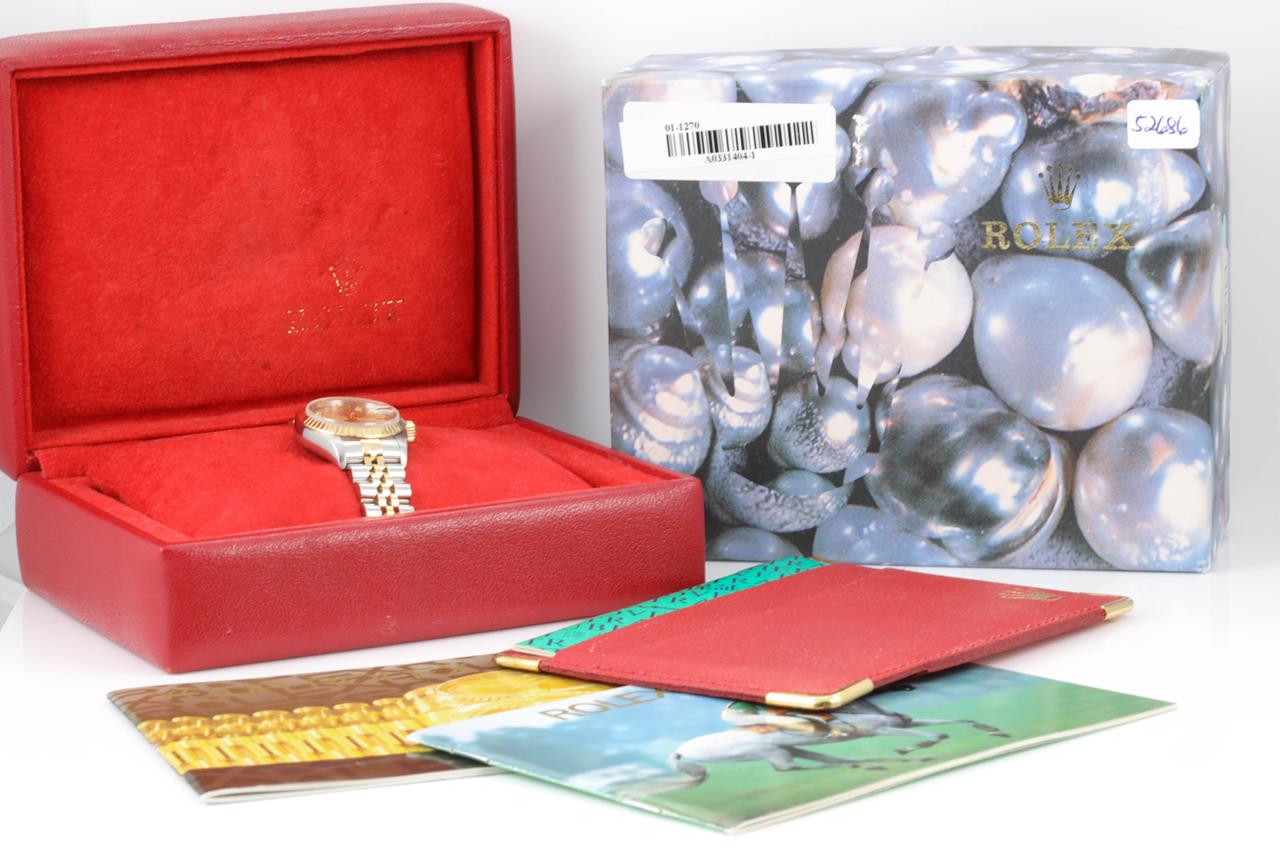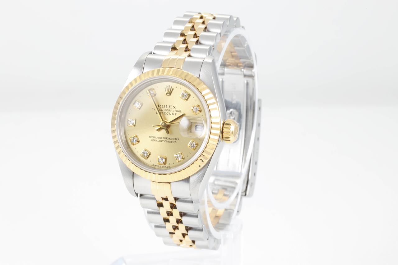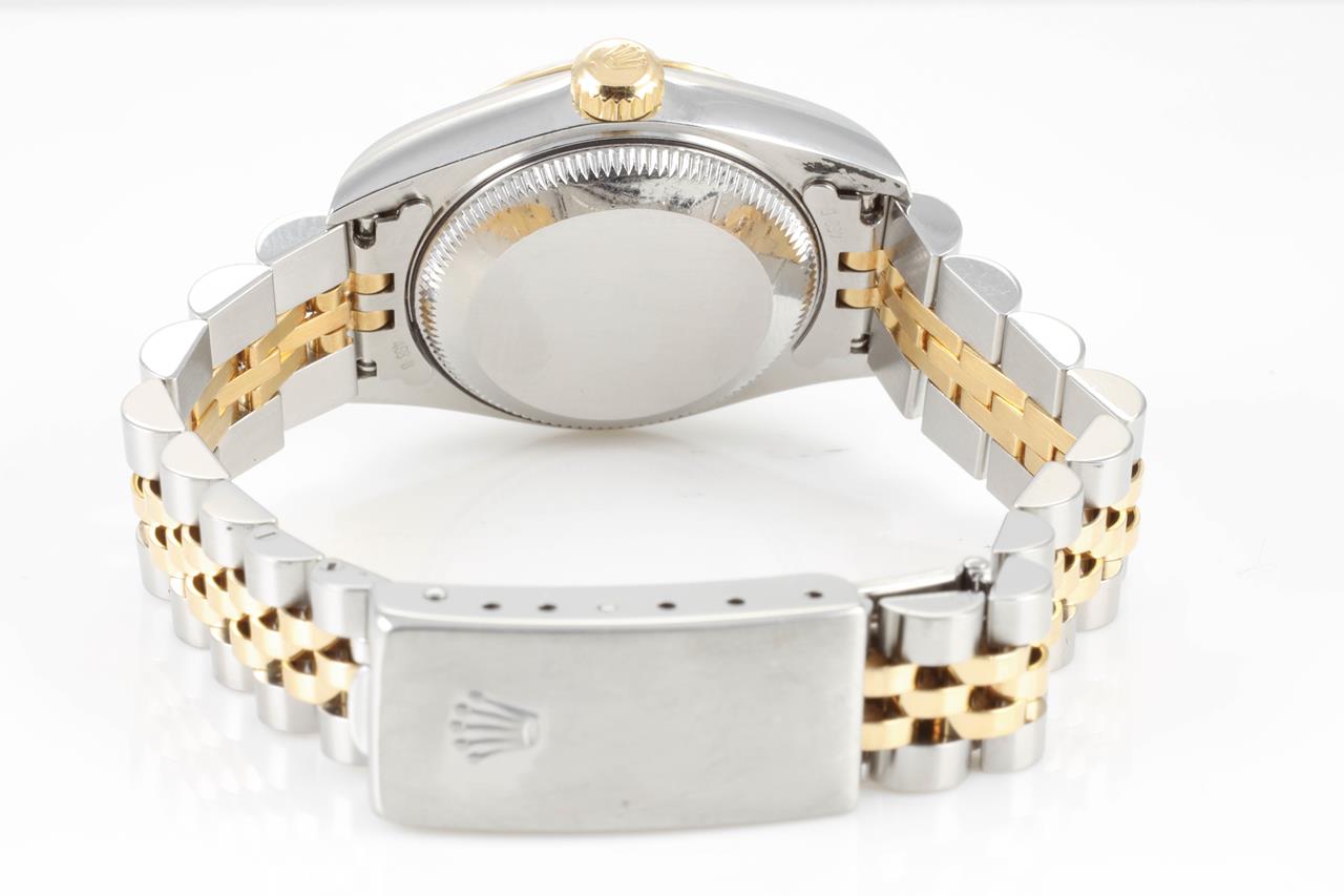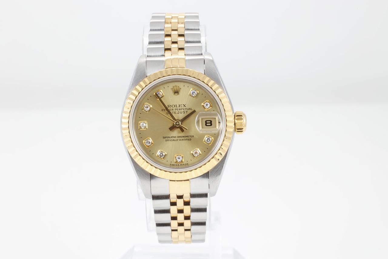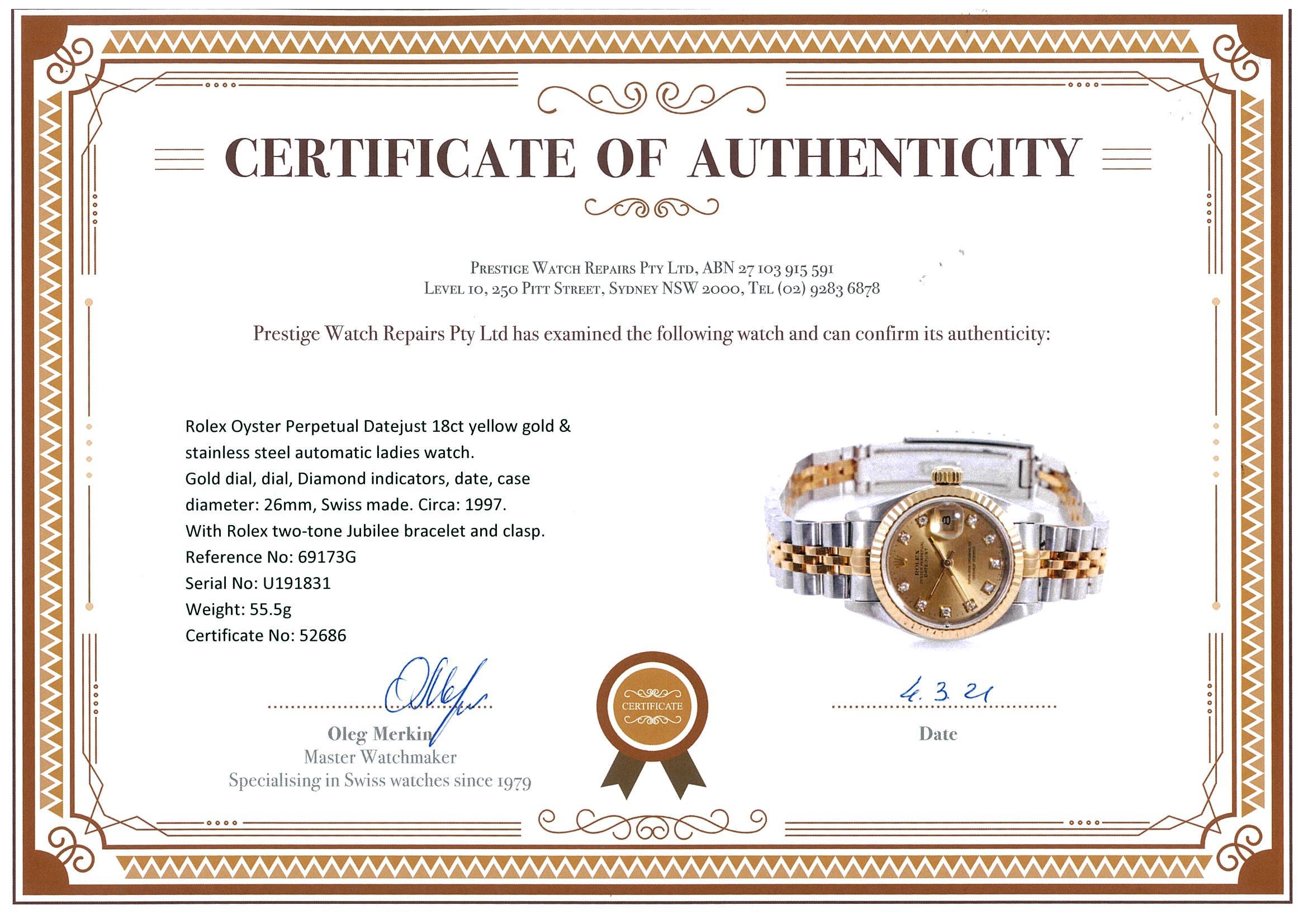 Rolex Oyster Perpetual Datejust 18ct yellow gold & stainless steel automatic ladies watch. Gold dial, dial, Diamond indicators, date, case diameter: 26mm, wrist size: 15cm, Swiss made. Ref# 69173G, Circa: 1997. With Rolex two-tone Jubilee bracelet and clasp. With Certificate of authenticity, Rolex guarantee certificate dated 5 Nov 1998 and Rolex box. 3 month FSA warranty. (Pre-owned)