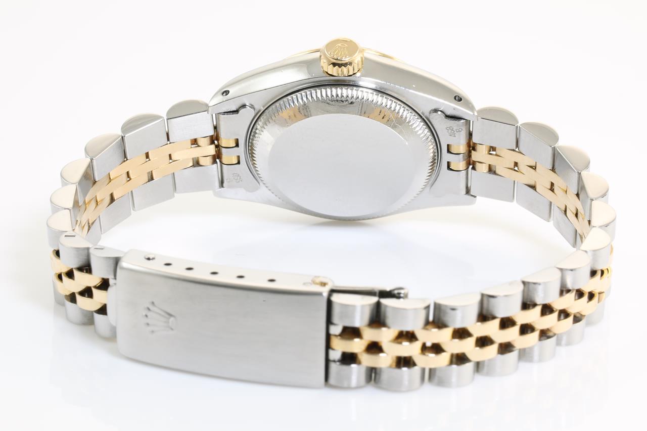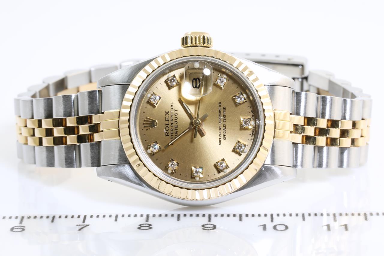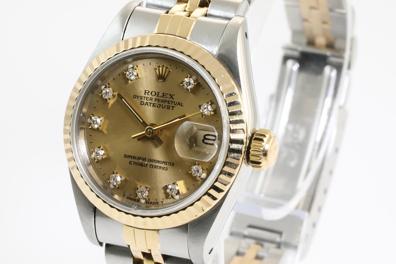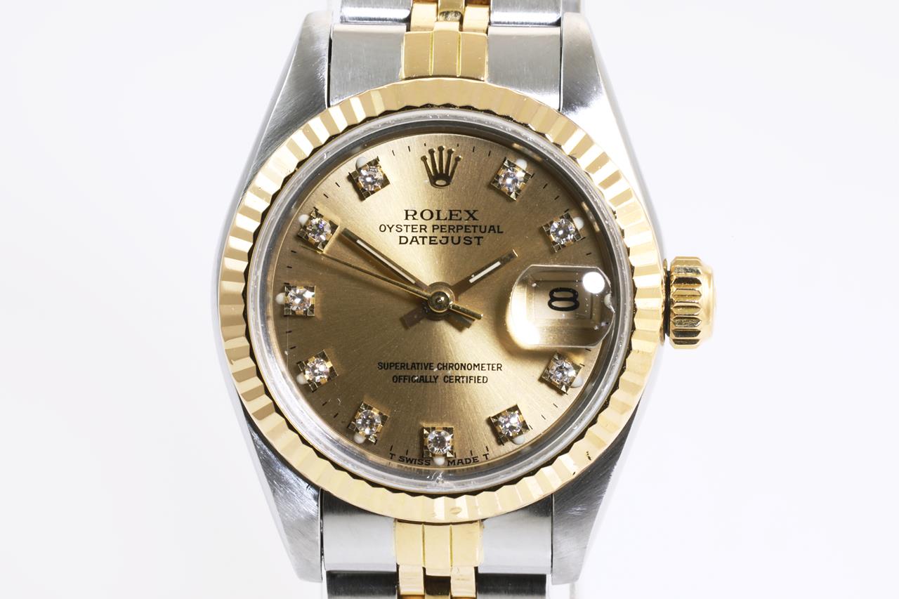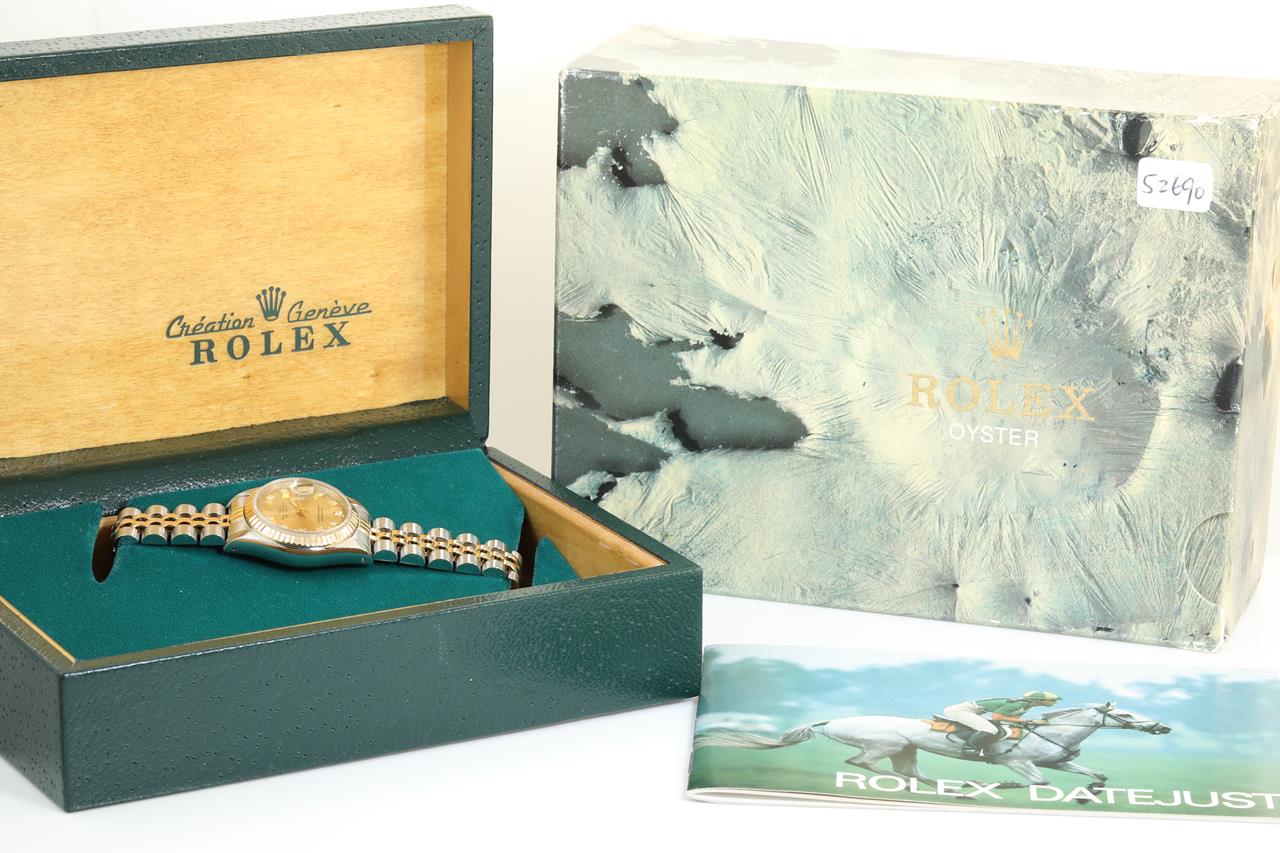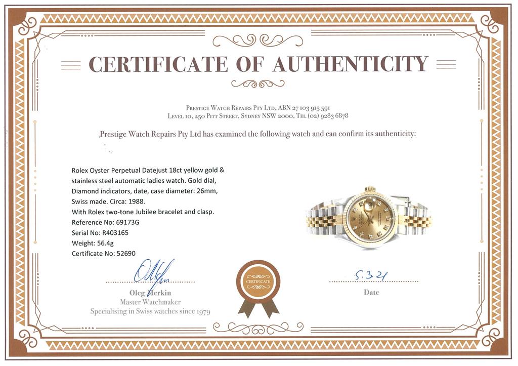 Rolex Oyster Perpetual Datejust 18ct yellow gold & stainless steel automatic ladies watch. Gold dial, Diamond indicators, date, case diameter: 26mm, wrist size: 15cm, Swiss made. Ref# 69173G, Circa: 1988. With Rolex two-tone Jubilee bracelet and clasp. With Certificate of authenticity, Rolex guarantee certificate dated 10/3/88 and Rolex box. 3 month FSA warranty. (Pre-owned)
