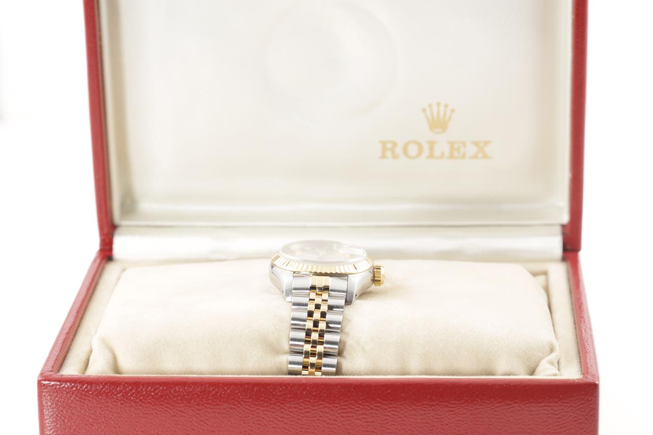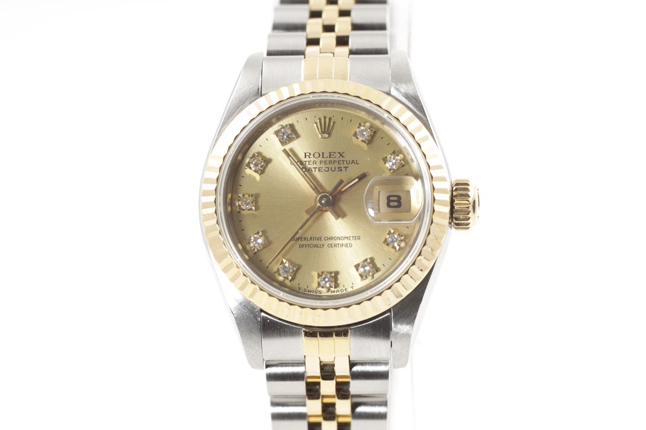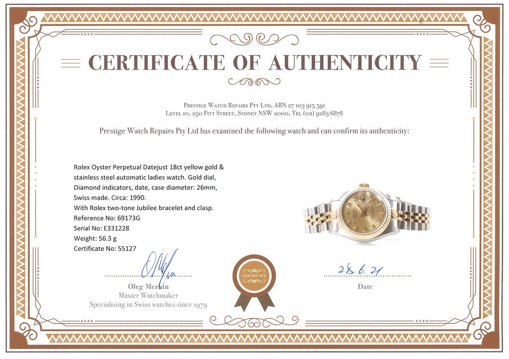 Rolex Oyster Perpetual Datejust 18ct yellow gold & stainless steel automatic ladies watch. Gold dial, Diamond indicators, date, case diameter: 26mm, wrist size:16cm, Swiss made. Ref# 69173G, Circa: 1990. With Rolex two-tone Jubilee bracelet and clasp. With Certificate of authenticity, Rolex international guarantee certificate dated Jan 19, 1991 and Rolex box. 3 month FSA warranty. (Pre-owned)