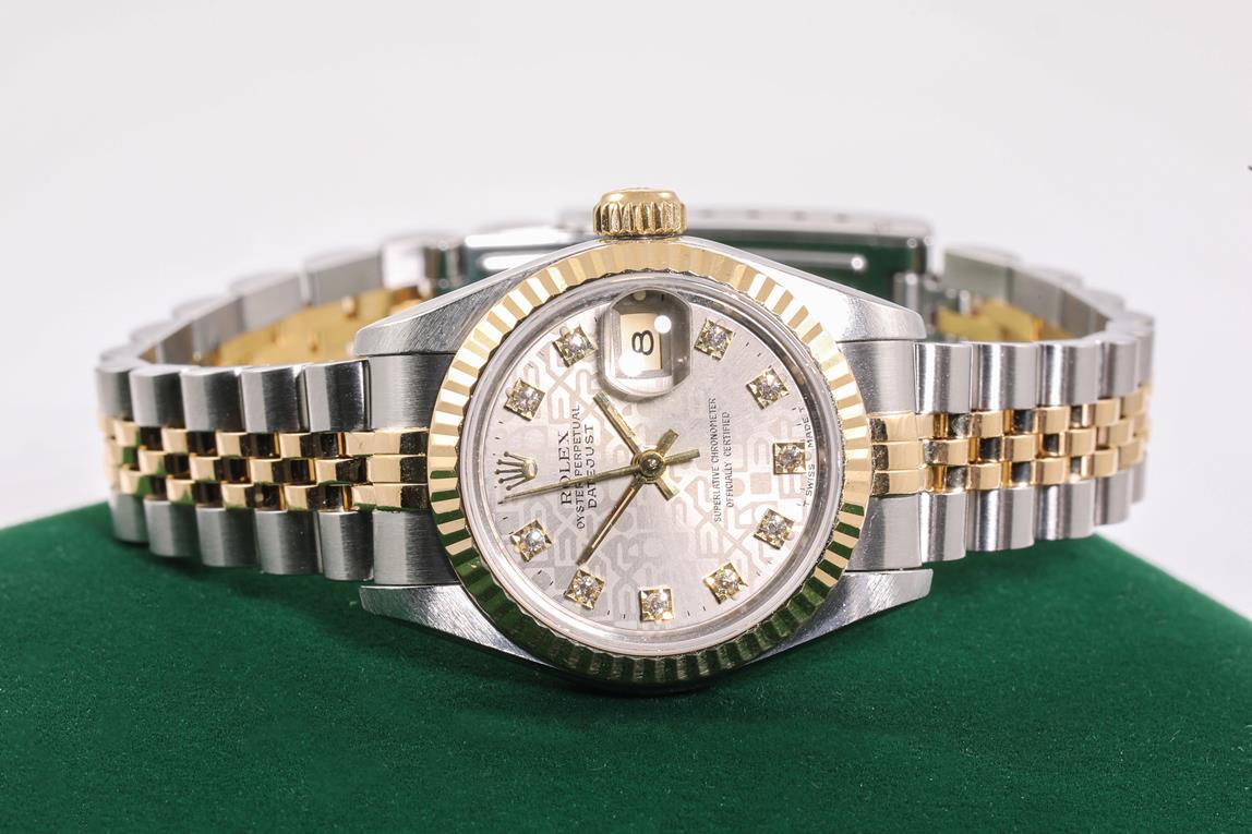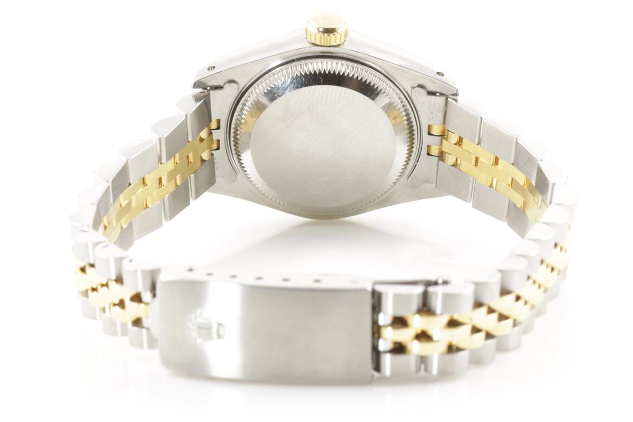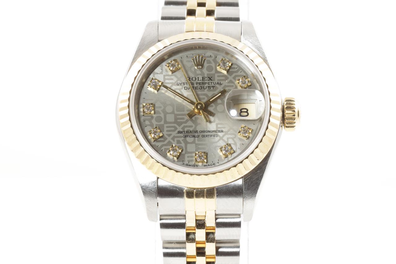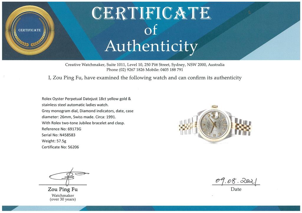 Rolex Oyster Perpetual Datejust 18ct yellow gold & stainless steel automatic ladies watch. Grey monogram dial, Diamond indicators, date, case diameter: 26mm, wrist size: 17cm, Swiss made. Ref# 69173G, Circa: 1991. With Rolex two-tone Jubilee bracelet and clasp. With Certificate of authenticity, Rolex guarantee certificate dated 03/01/1993 and Rolex box. 3 month FSA warranty. (Pre-owned)