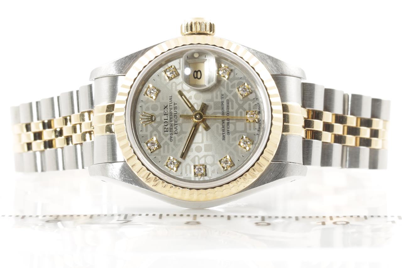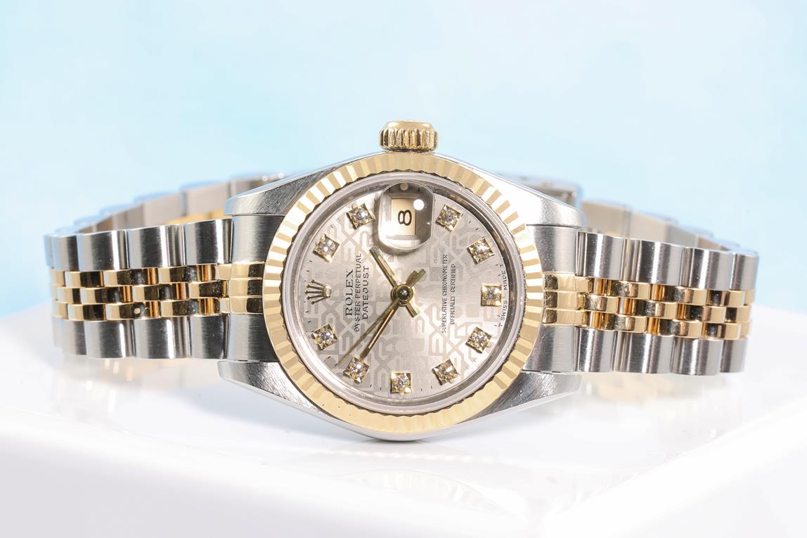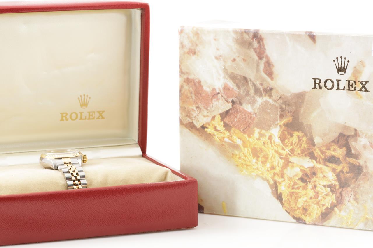 Rolex Oyster Perpetual Datejust 18ct yellow gold & stainless steel automatic ladies watch. Grey monogram dial, Diamond indicators, date, case diameter: 26mm, wrist size: 17cm, Swiss made. Ref# 69173G, Circa: 1991. With Rolex two-tone Jubilee bracelet and clasp. With Certificate of authenticity, Rolex guarantee certificate dated 03/01/1993 and Rolex box. 3 month FSA warranty. (Pre-owned)