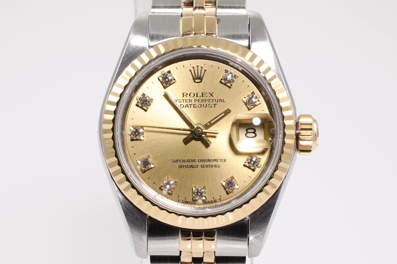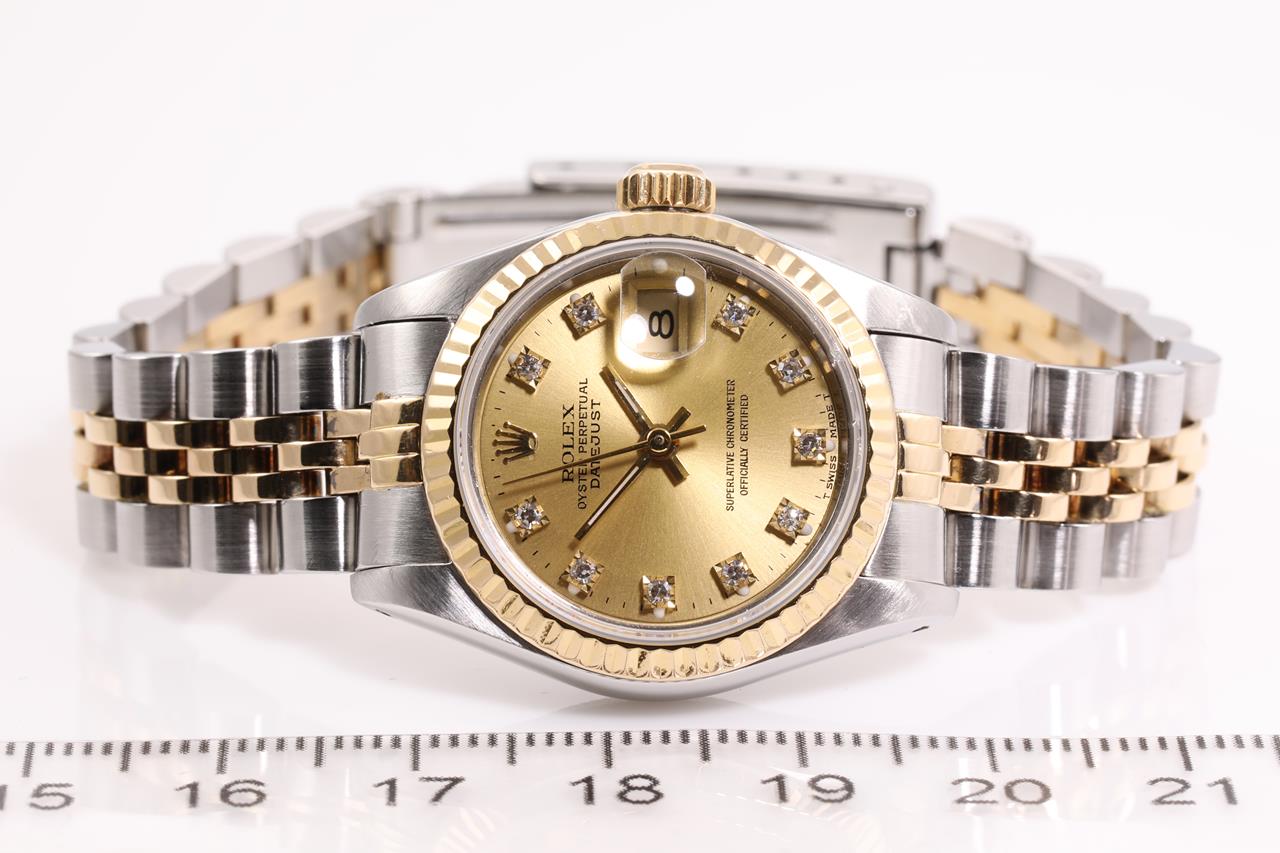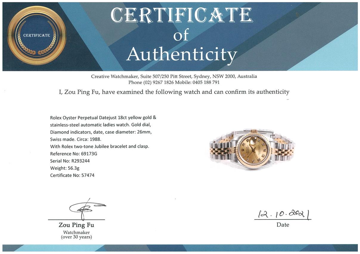 Rolex Oyster Perpetual Datejust 18ct yellow gold & stainless steel automatic ladies watch. Gold dial, Diamond indicators, date, case diameter: 26mm, wrist size: 15.5cm, Swiss made. Ref# 69173G, Circa: 1988. With Rolex two-tone Jubilee bracelet and clasp. With certificate of authenticity and Rolex box. 6 month Creative watchmaker warranty from the date of full service. (Pre-owned)