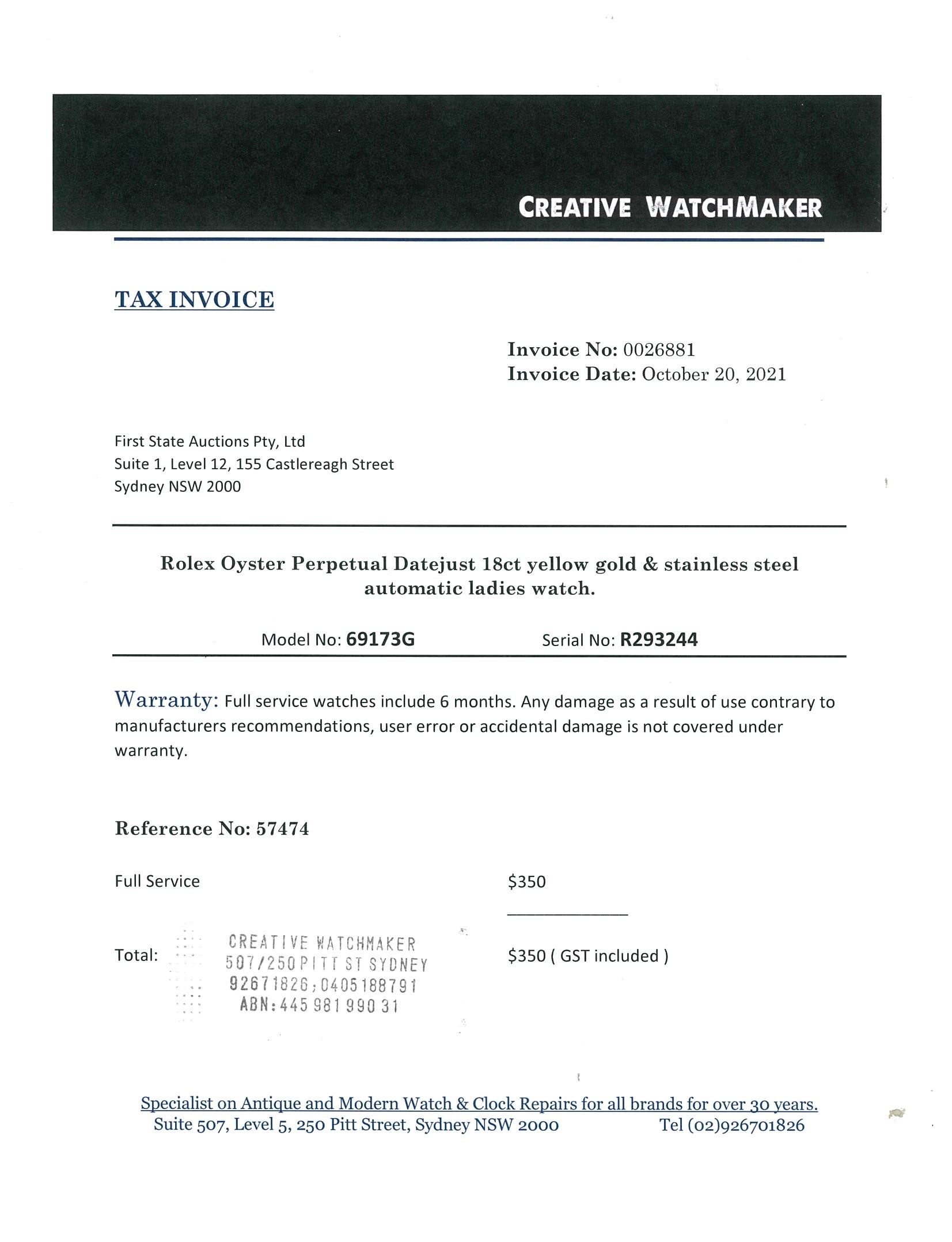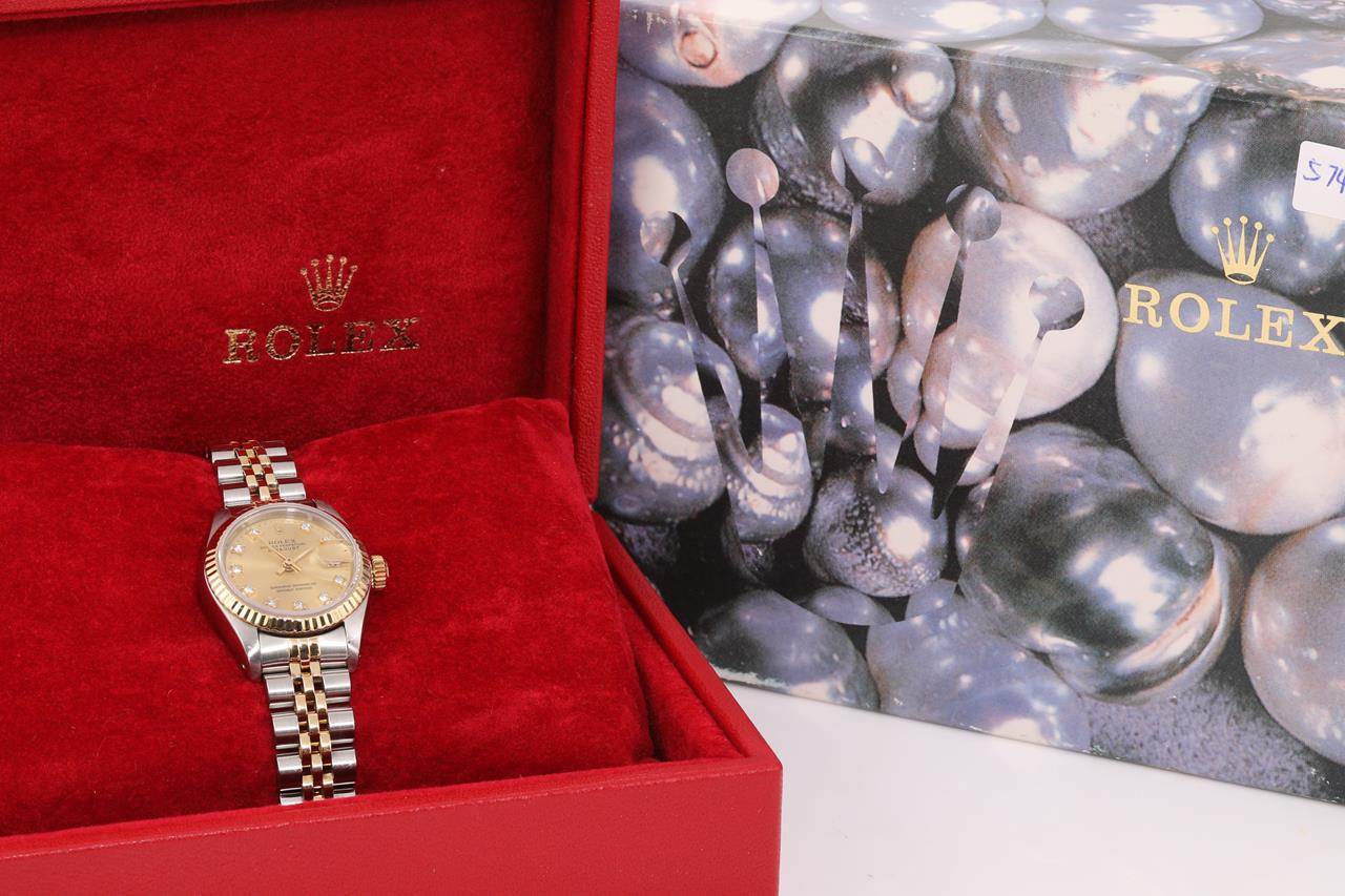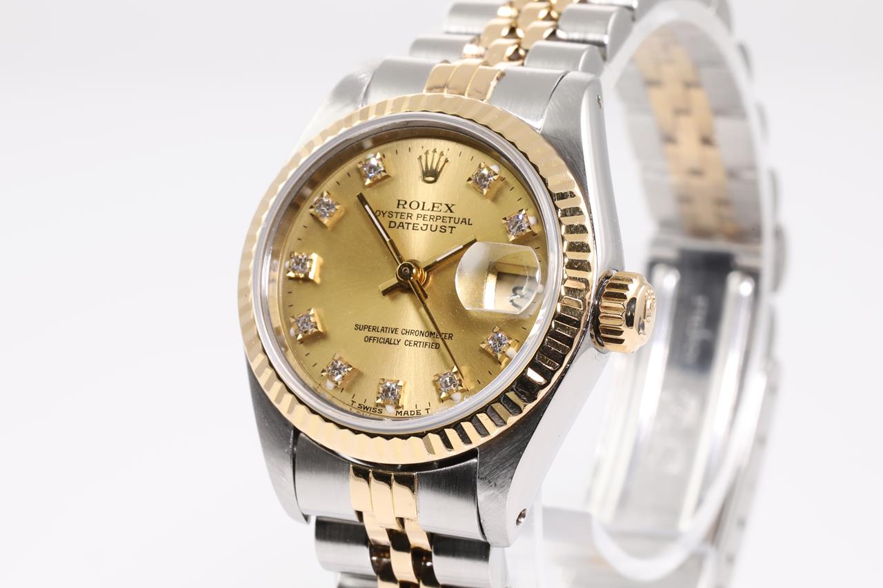 Rolex Oyster Perpetual Datejust 18ct yellow gold & stainless steel automatic ladies watch. Gold dial, Diamond indicators, date, case diameter: 26mm, wrist size: 15.5cm, Swiss made. Ref# 69173G, Circa: 1988. With Rolex two-tone Jubilee bracelet and clasp. With certificate of authenticity and Rolex box. 6 month Creative watchmaker warranty from the date of full service. (Pre-owned)