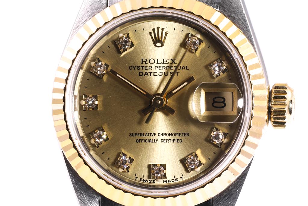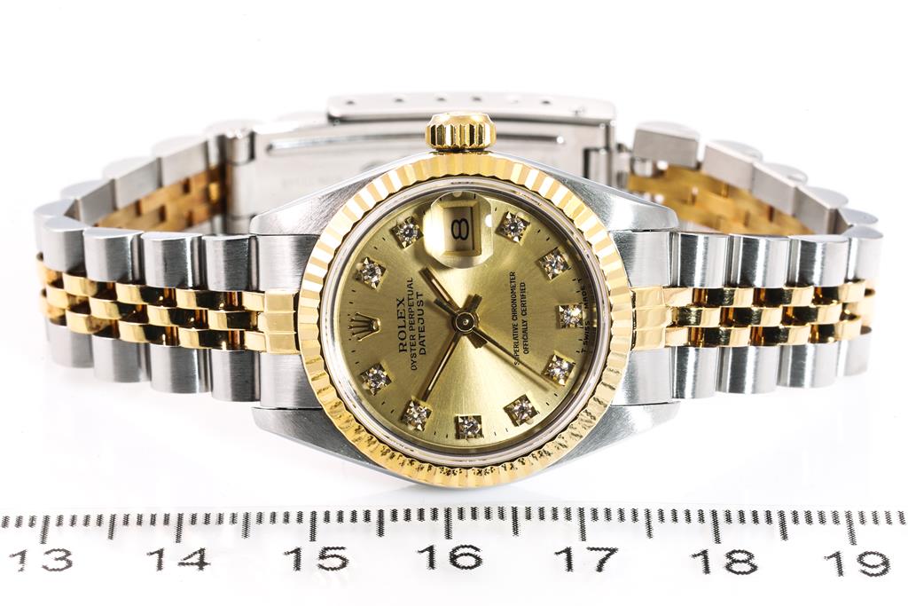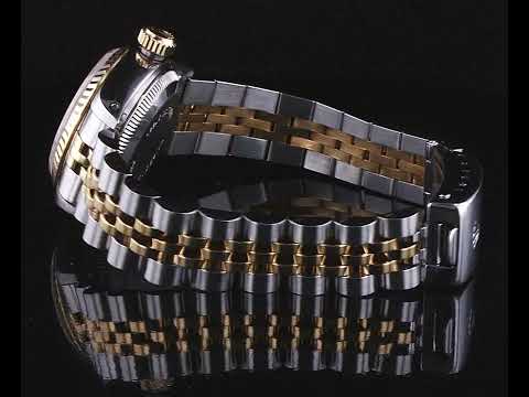 Rolex Oyster Perpetual Datejust 18ct yellow gold & stainless steel automatic ladies watch. Gold dial, Diamond indicators, date, case diameter: 26mm, wrist size: 15.5cm, Swiss made. Ref# 69173G, Circa: 1990. With Rolex two-tone Jubilee bracelet and clasp. With Certificate of Authenticity and Rolex box. 3 month FSA warranty. (Pre-owned)