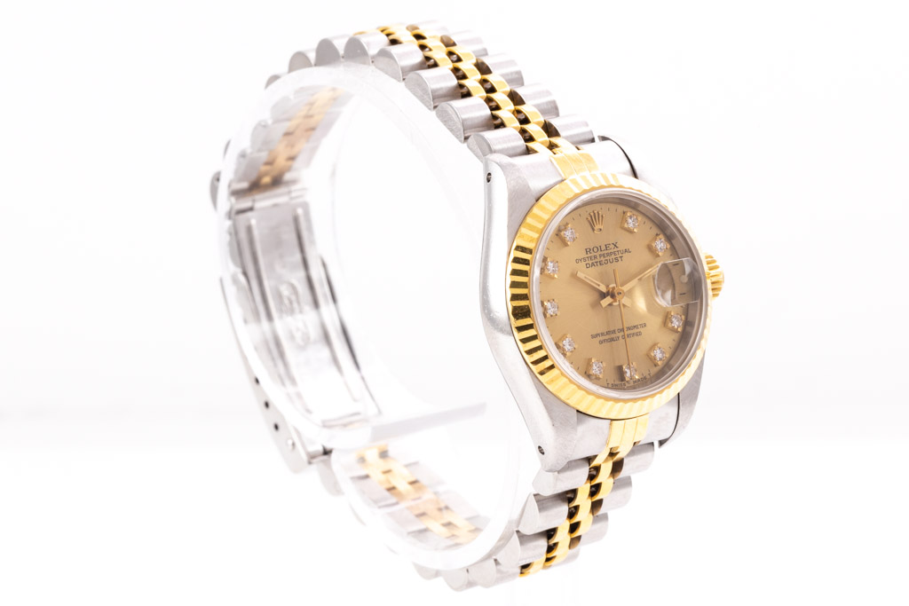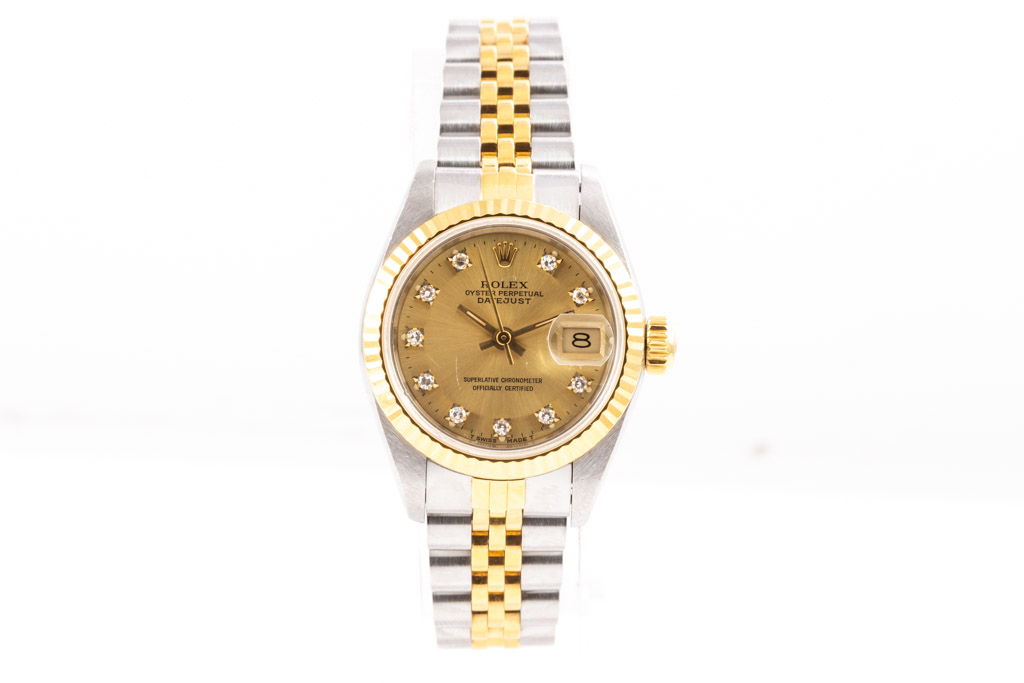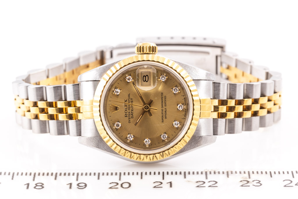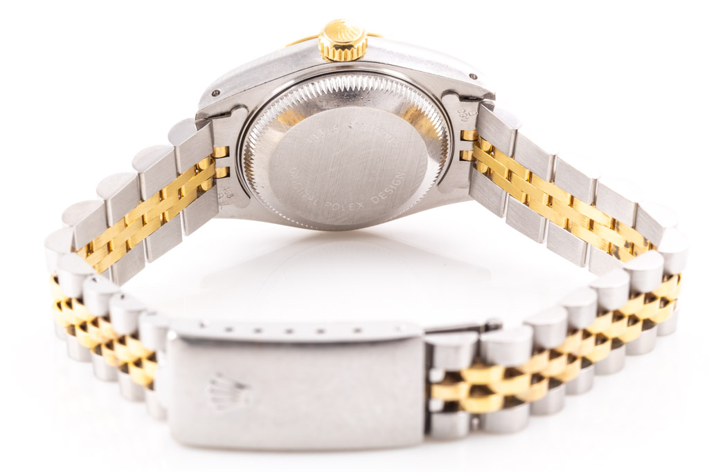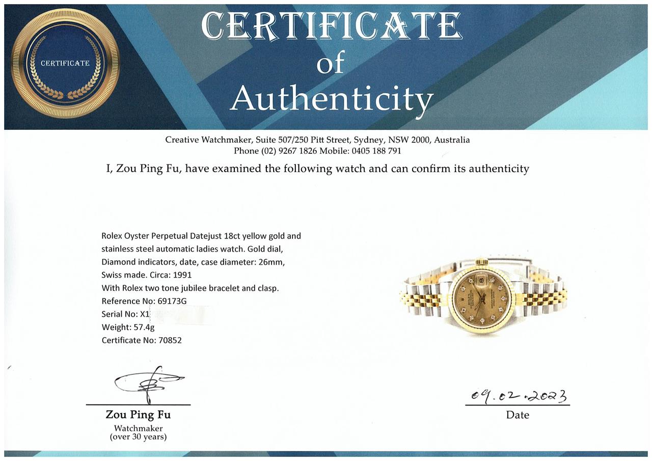 Rolex Oyster Perpetual Datejust 18ct yellow gold and stainless steel automatic ladies watch. Gold dial, Diamond indicators, date, case diameter: 26mm, wrist size: 17cm, Swiss made. Ref# 69173G. Circa: 1991. With Rolex two tone jubilee bracelet and clasp. With Certificate of Authenticity, Rolex Guarantee Certificate and Rolex box. 3 month FSA warranty (Pre-owned)