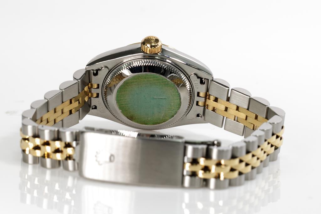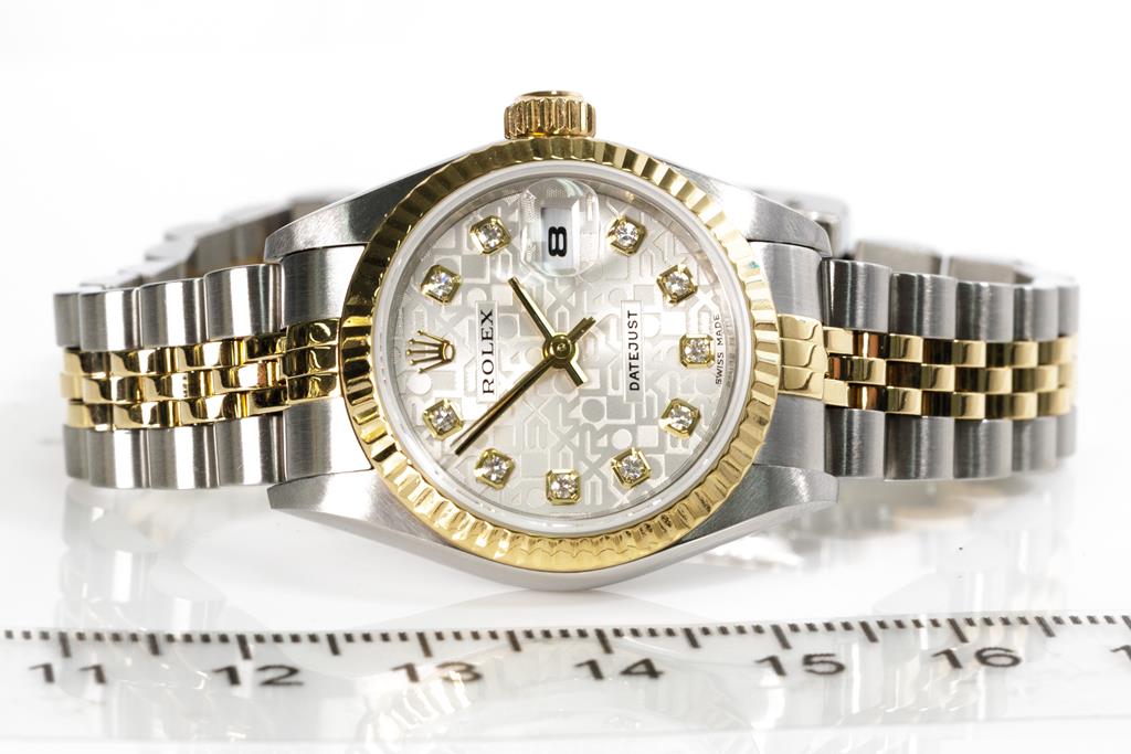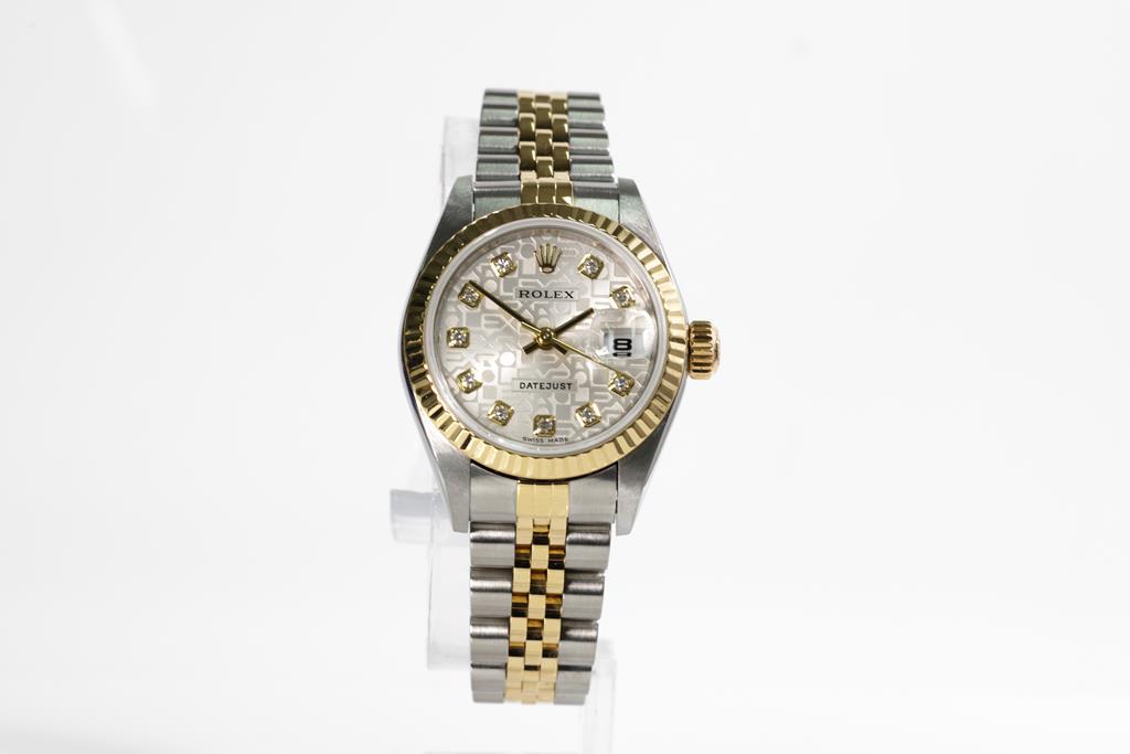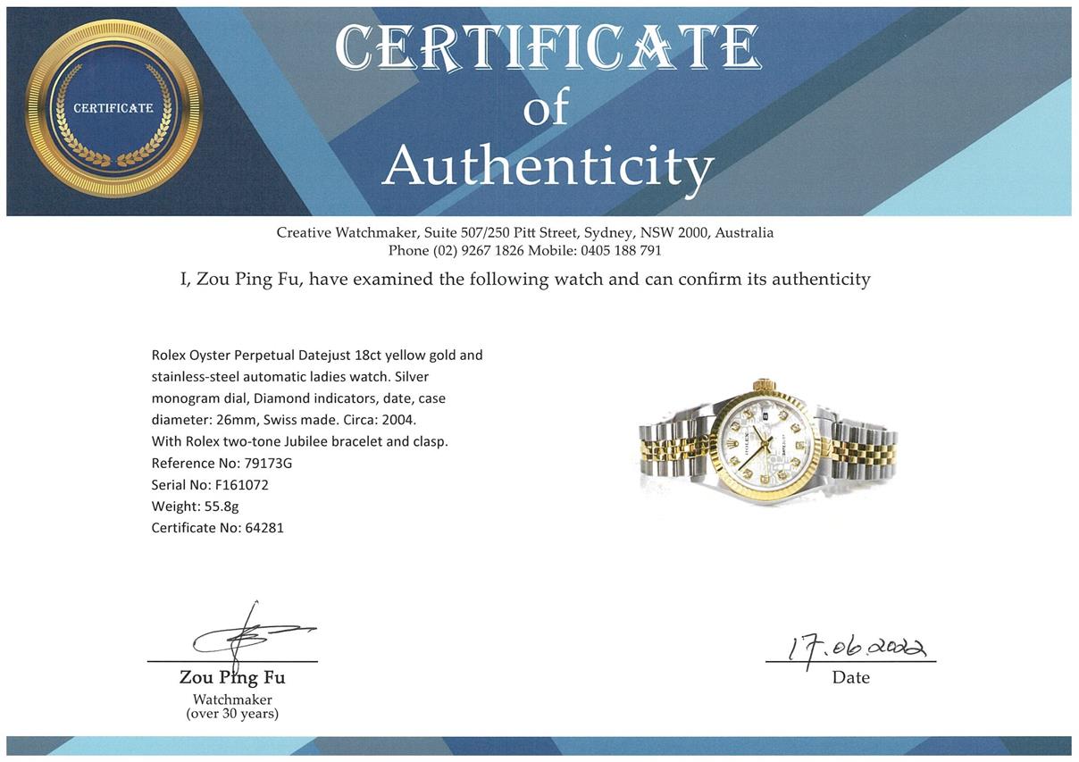 Rolex Oyster Perpetual Datejust 18ct yellow gold and stainless steel automatic ladies watch. Silver monogram dial, Diamond indicators, date, case diameter: 26mm, wrist size: 15.5cm, Swiss made. Ref# 79173G, Circa: 2004. With Rolex two-tone Jubilee bracelet and clasp. With Certificate of Authenticity and Rolex box with Rolex gift bag. 3 month FSA warranty. (Pre-owned)