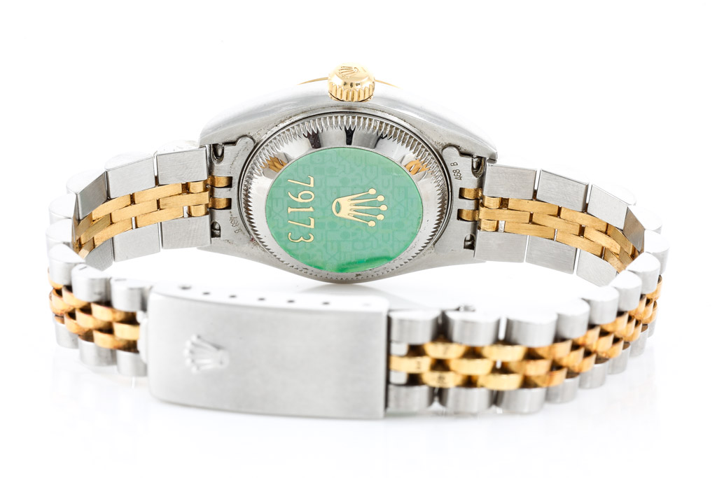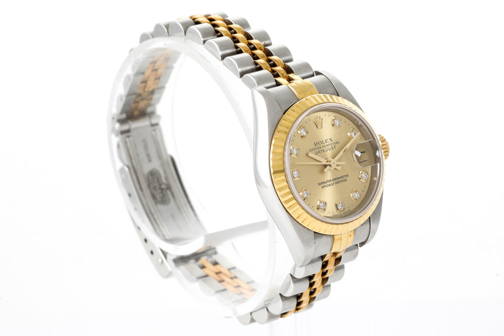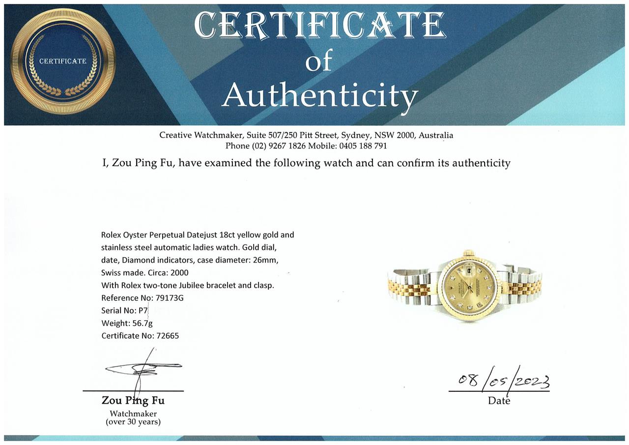 Rolex Oyster Perpetual Datejust 18ct yellow gold and stainless steel automatic ladies watch. Gold dial, date, Diamond indicators, case diameter: 26mm, wrist size: 16cm, Swiss made. Ref# 79173G, Circa: 2000. With Rolex two-tone Jubilee bracelet and clasp. With Certificate of Authenticity and Rolex box (including Rolex gift bag). 3 month FSA warranty. (Pre-owned)