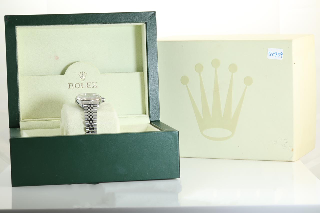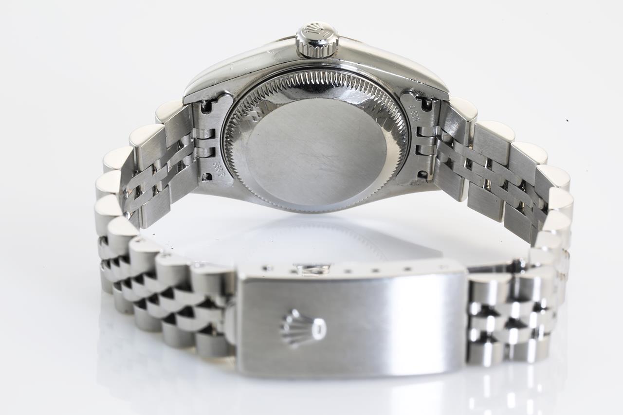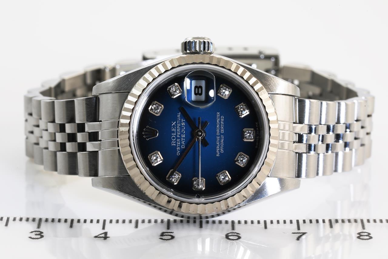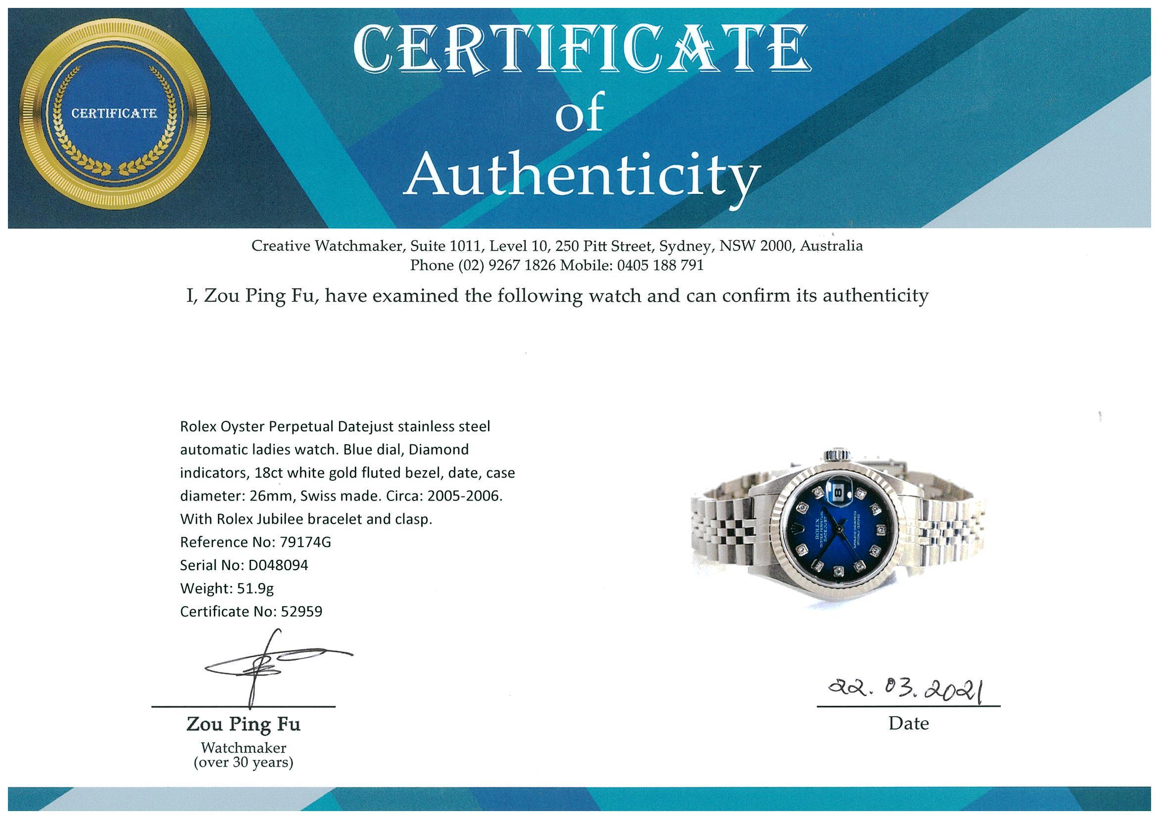 Rolex Oyster Perpetual Datejust stainless steel automatic ladies watch. Blue dial, Diamond indicators, 18ct white gold fluted bezel, date, case diameter: 26mm, wrist size: 16cm, Swiss made. Ref# 79174G, Circa: 2005-2006. With Rolex Jubilee bracelet and clasp. With certificate of authenticity, Rolex guarantee certificate and Rolex box. 3 month FSA warranty. (Pre-owned)