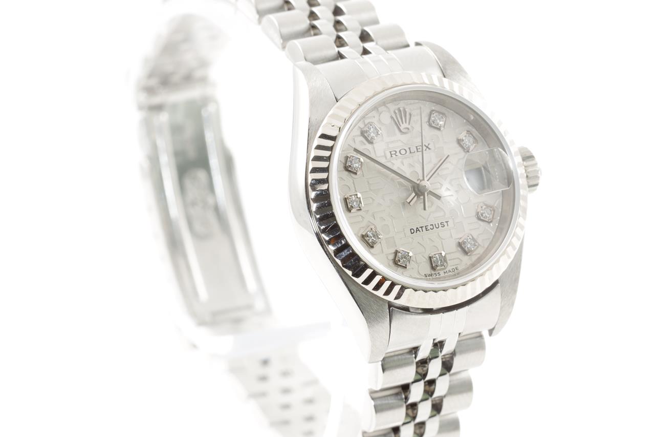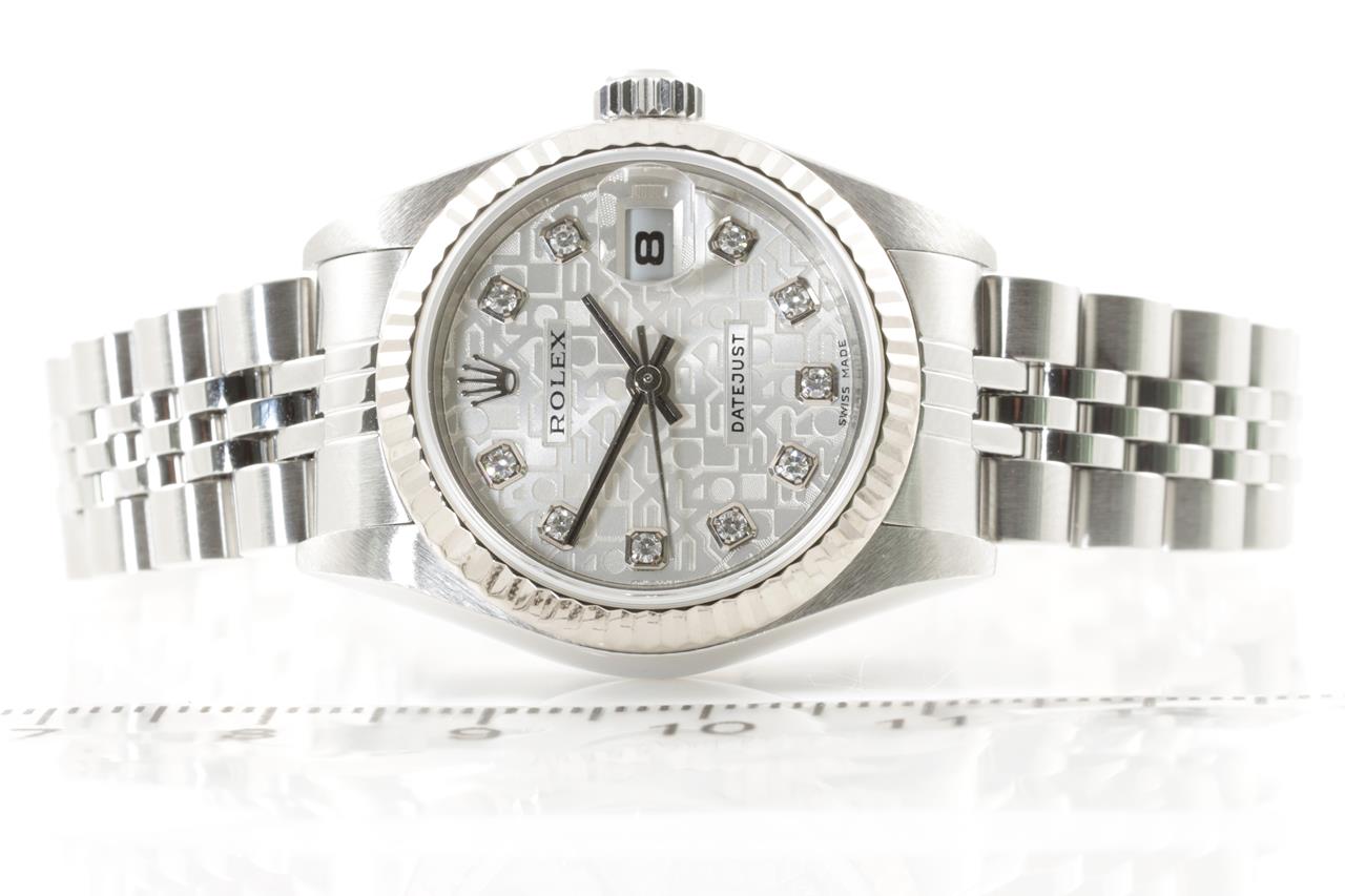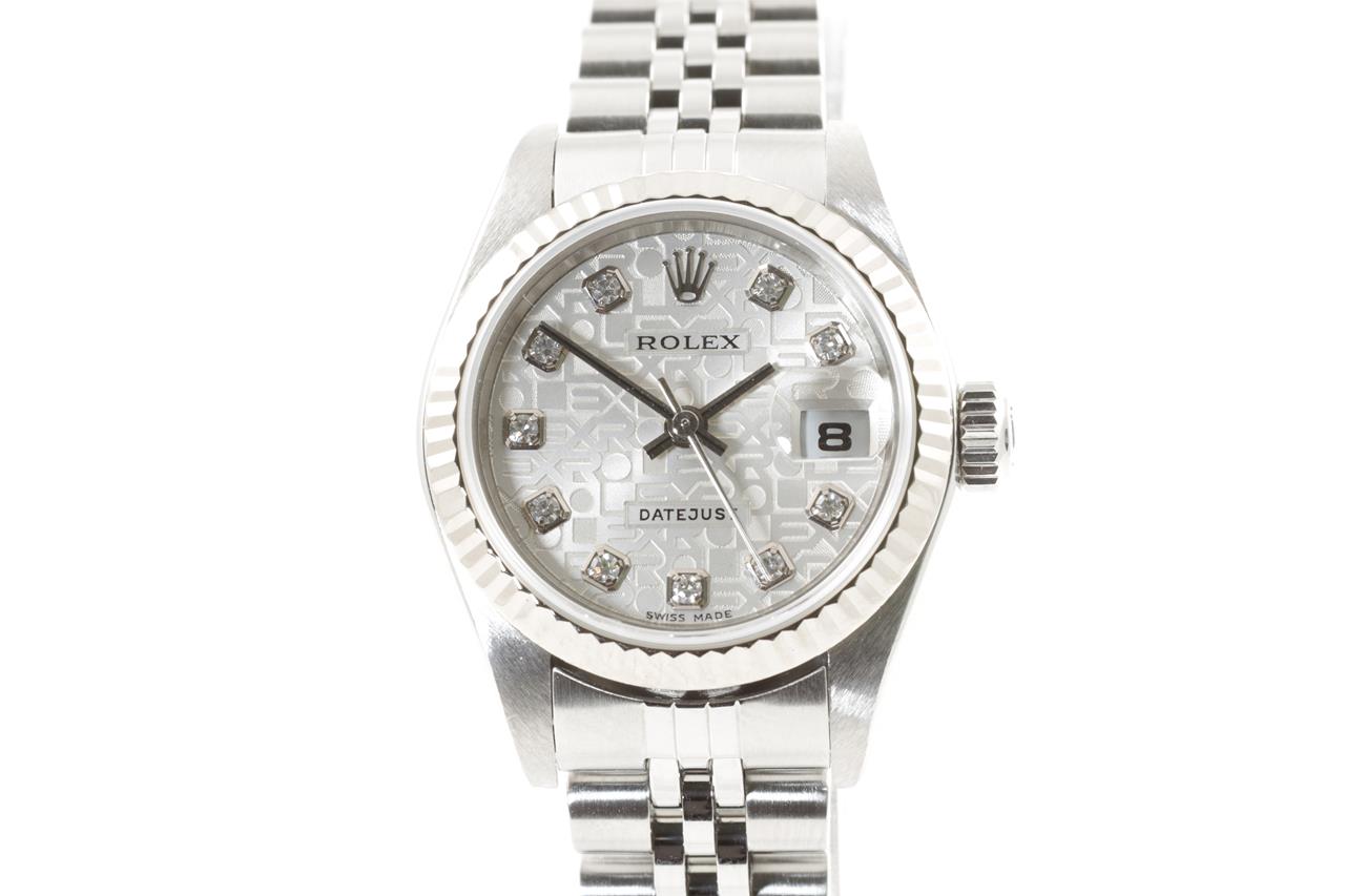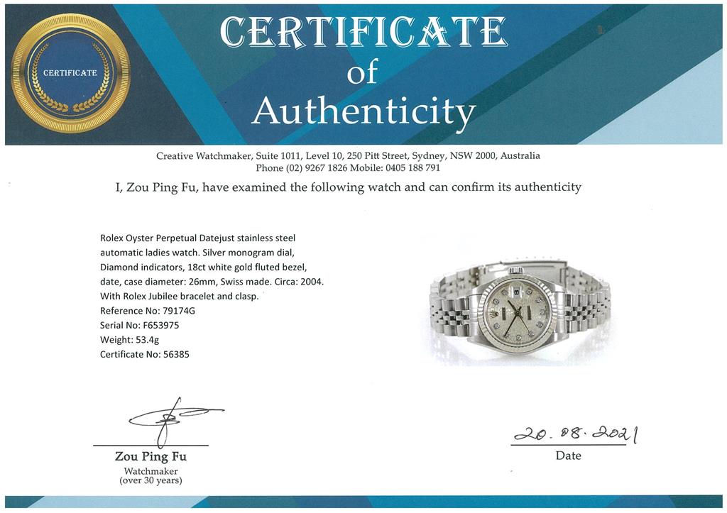 Rolex Oyster Perpetual Datejust stainless steel automatic ladies watch. Silver monogram dial, Diamond indicators, 18ct white gold fluted bezel, date, case diameter: 26mm, wrist size: 17cm, Swiss made. Ref# 79174G, Circa: 2004. With Rolex Jubilee bracelet and clasp. With certificate of authenticity and Rolex box. 3 month FSA warranty. (Pre-owned)