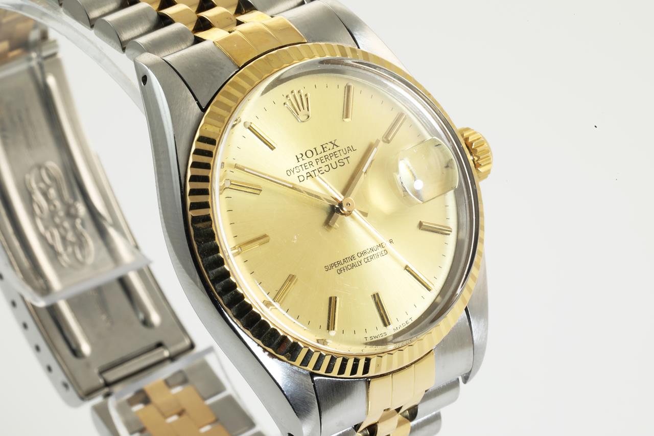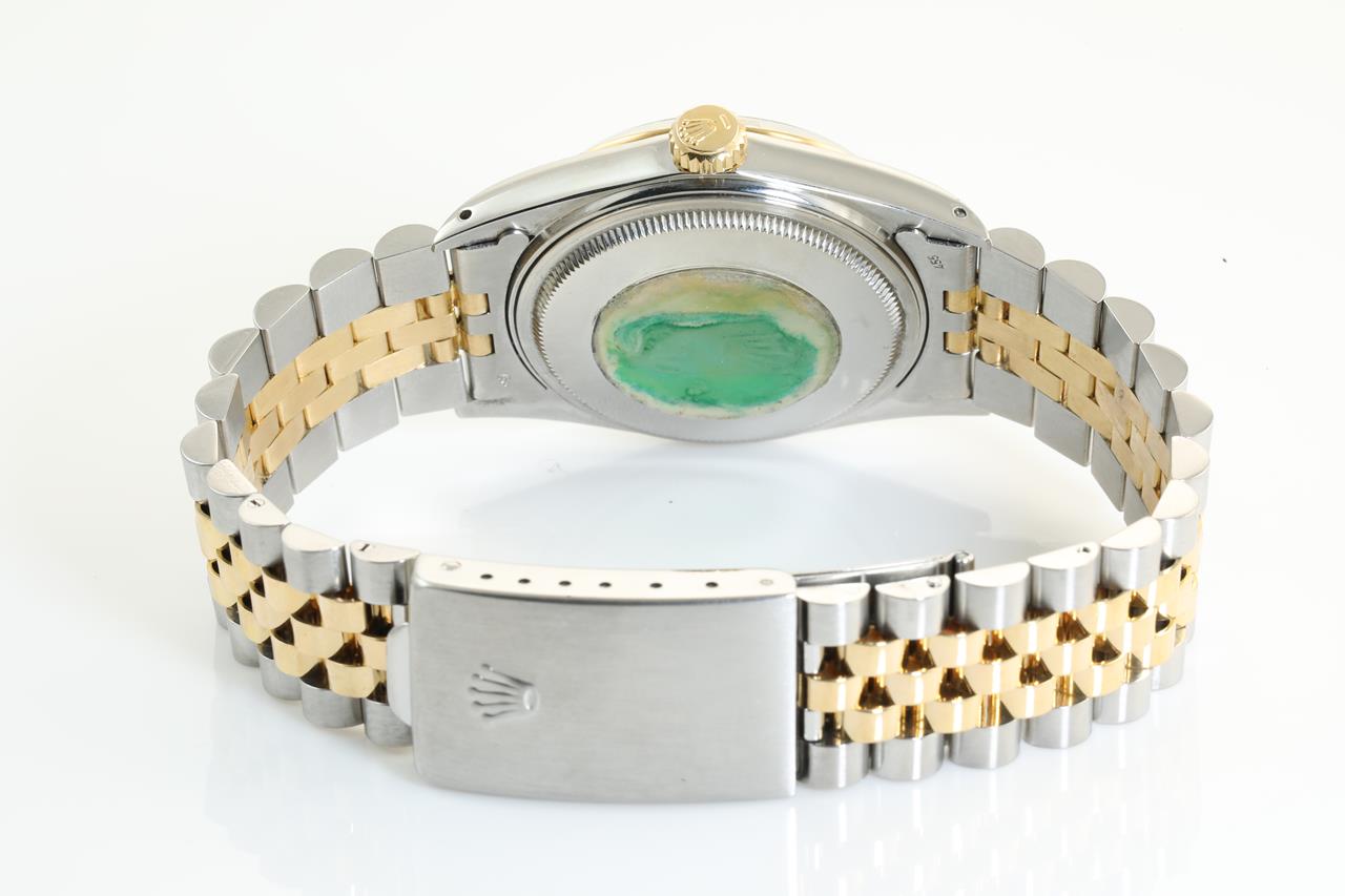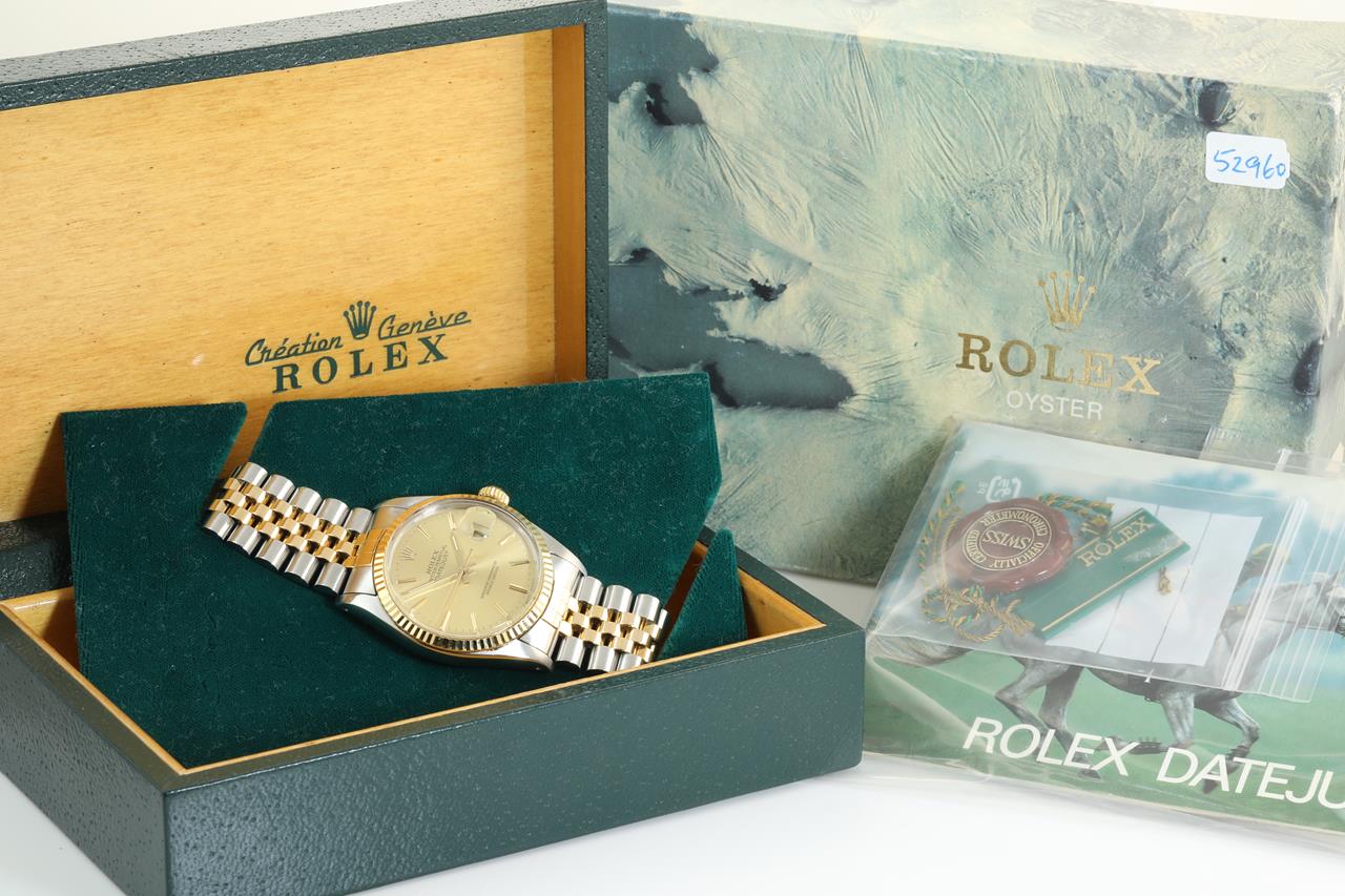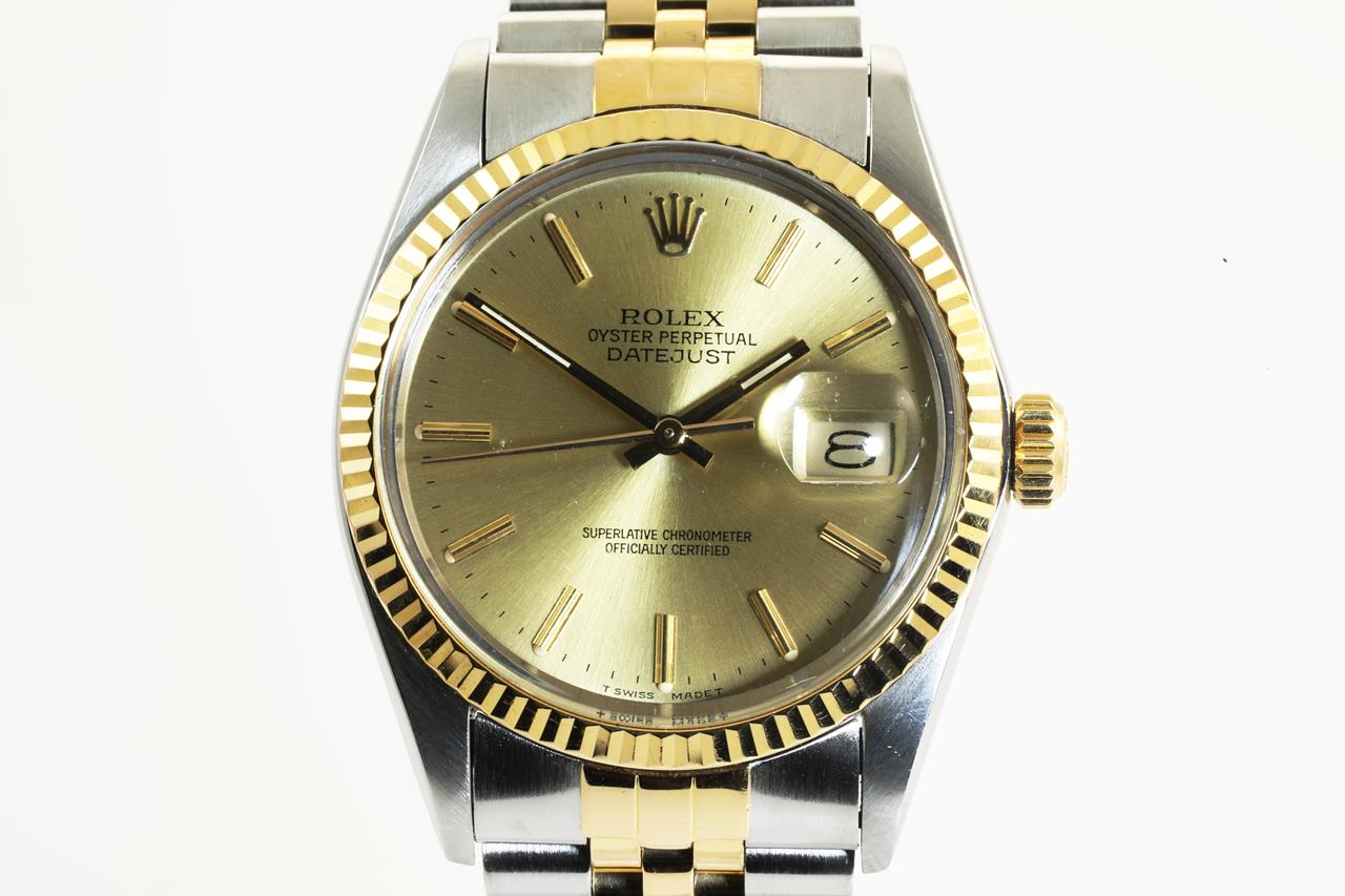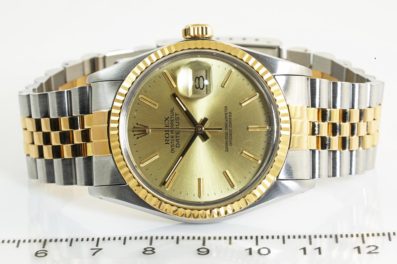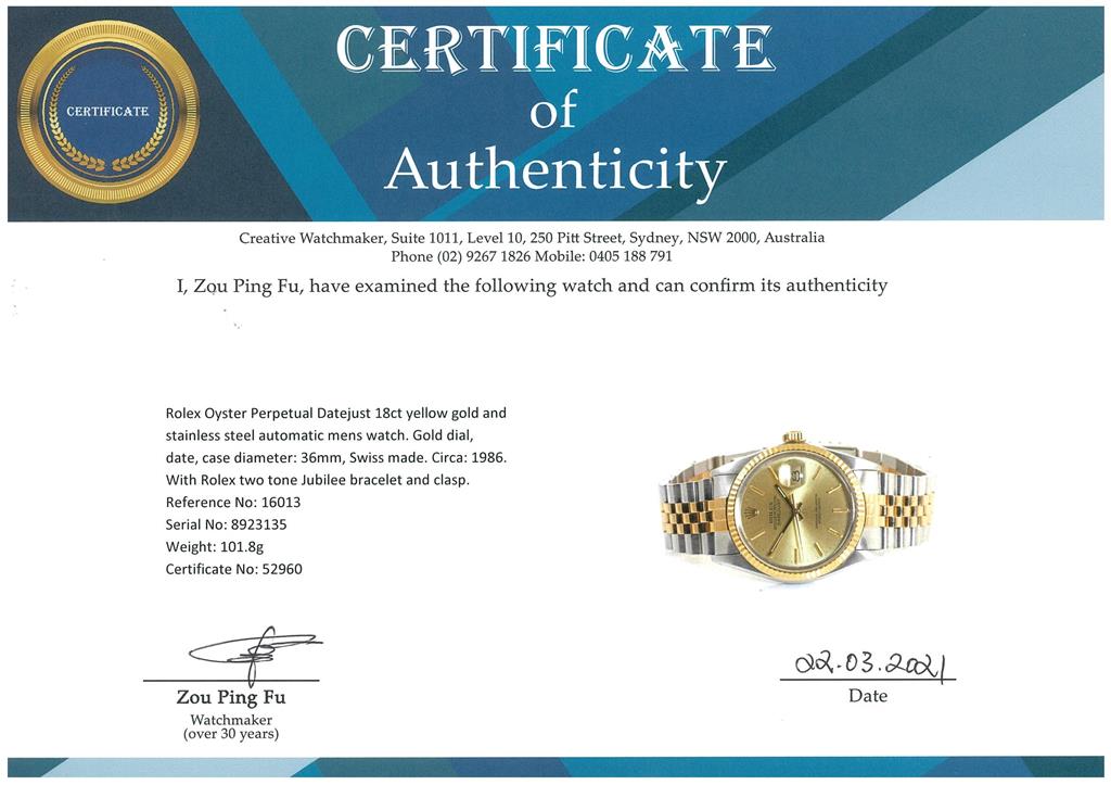 Rolex Oyster Perpetual Datejust 18ct yellow gold and stainless steel automatic mens watch. Gold dial, date, case diameter: 36mm, wrist size: 19cm, Swiss made. Ref# 16013, Circa: 1986. With Rolex two tone Jubilee bracelet and clasp. With certificate of authenticity and Rolex box. 3 month FSA warranty. (Pre-owned)