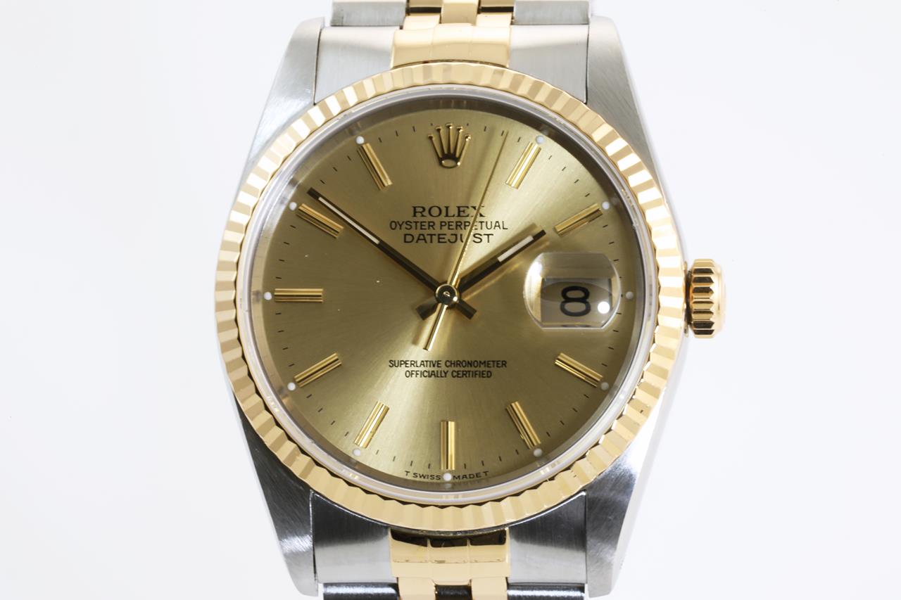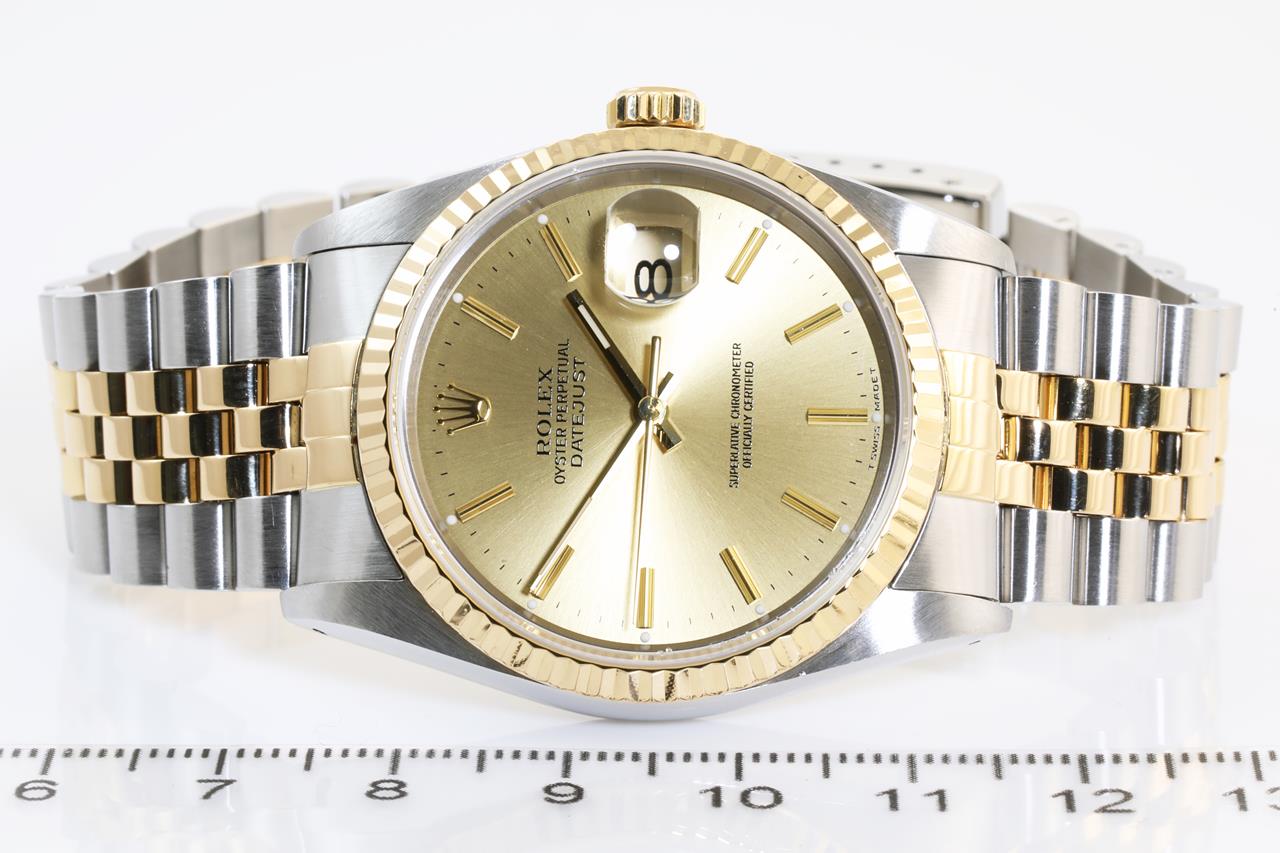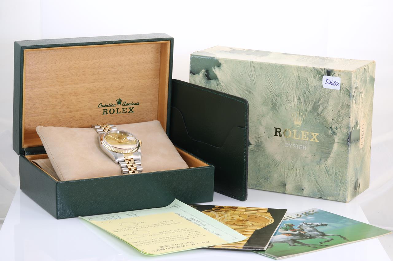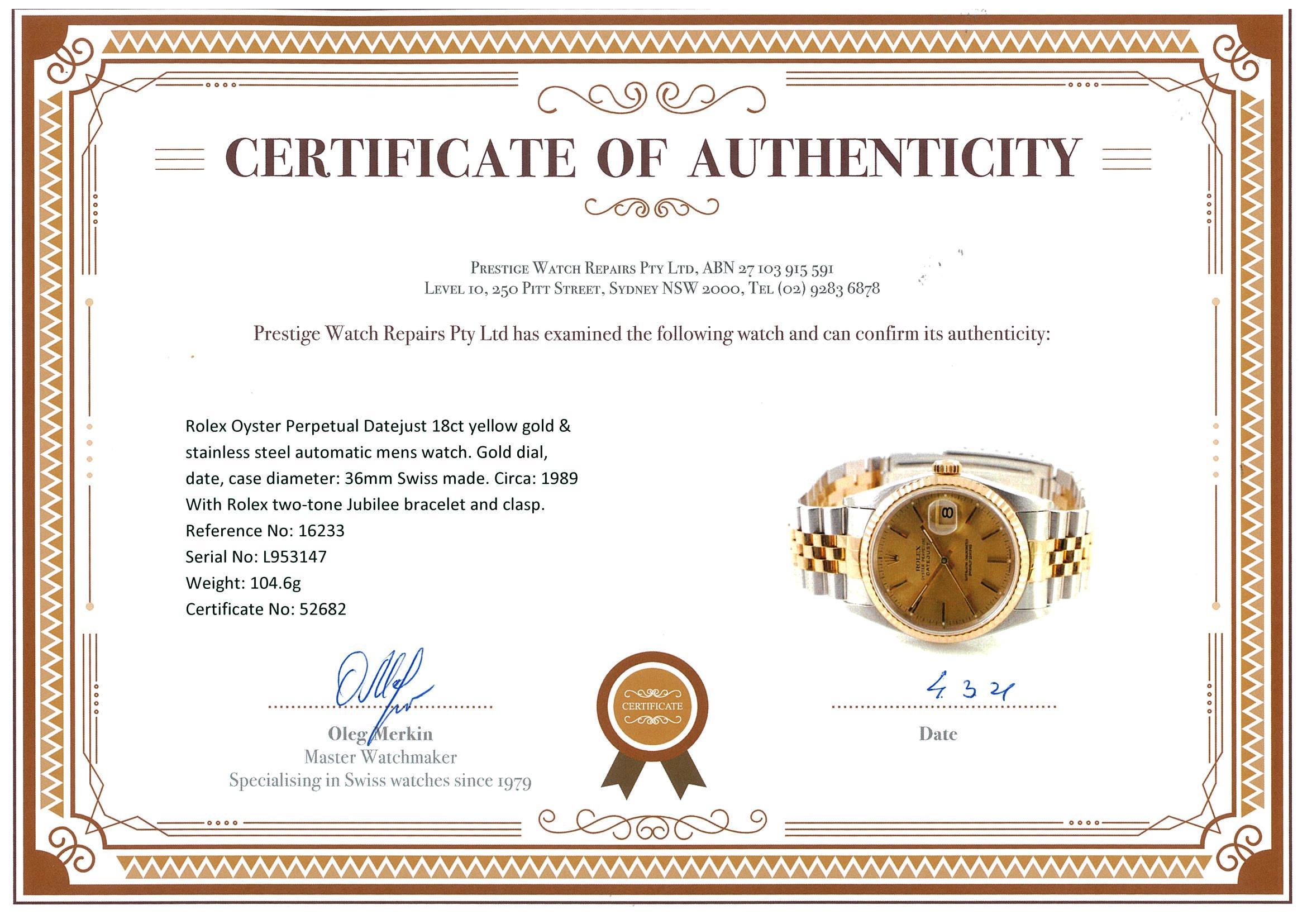 Rolex Oyster Perpetual Datejust 18ct yellow gold & stainless steel automatic mens watch. Gold dial, date, case diameter: 36mm, wrist size: 16cm, Swiss made. Ref# 16233, Circa: 1989. With Rolex two-tone Jubilee bracelet and clasp. With Certificate of Authenticity and Rolex guarantee certificate date December 1990. With two Rolex international service guarantee card dated 2011/03/08 & 2017/07/10 inside Rolex box. 3 month FSA warranty. (Pre-owned)