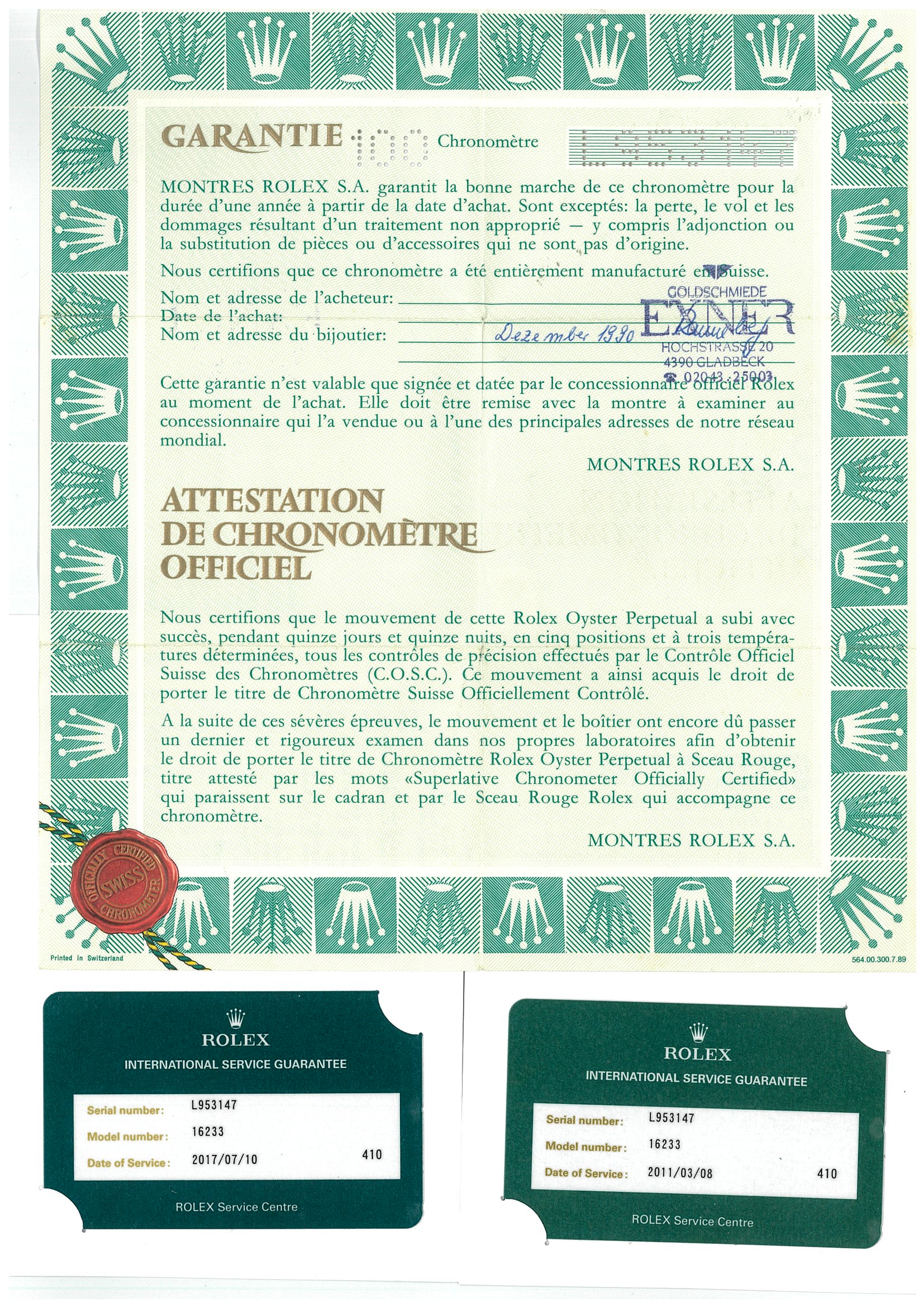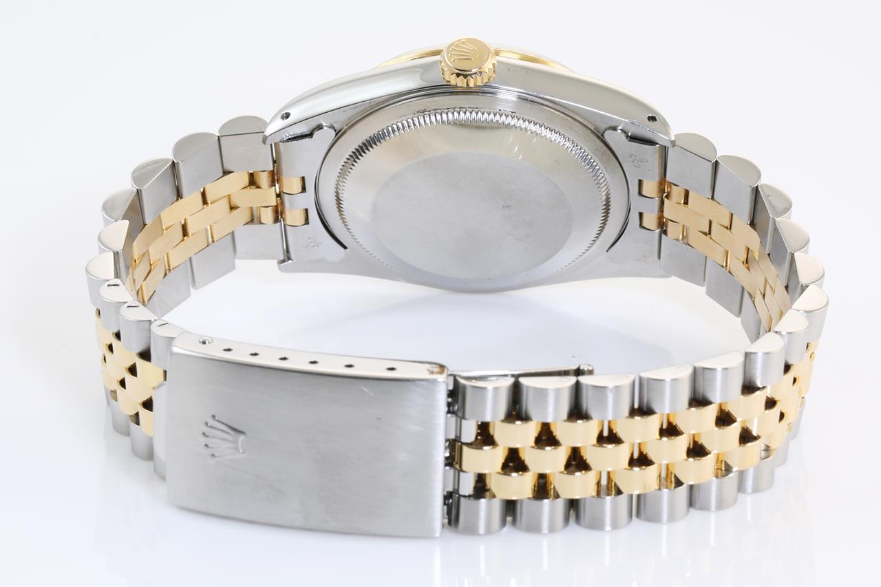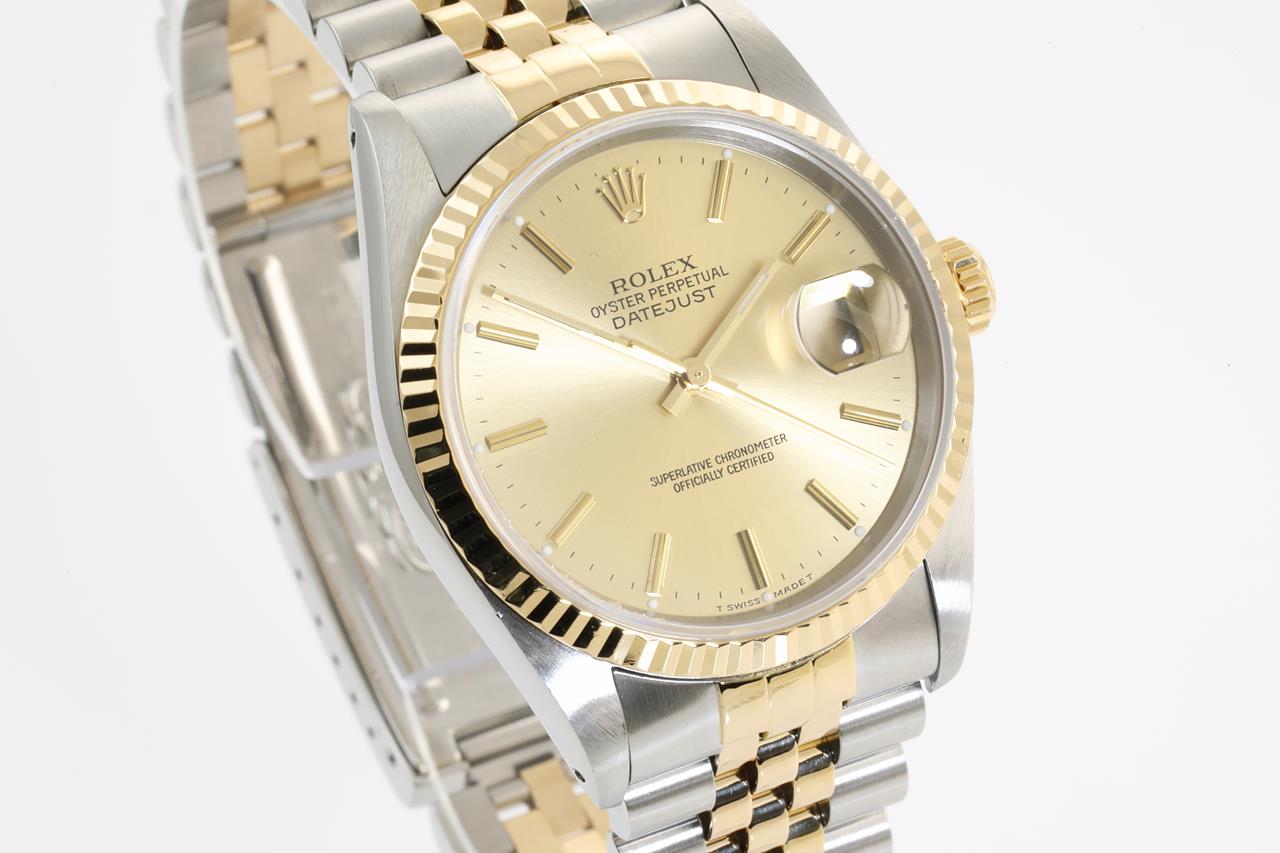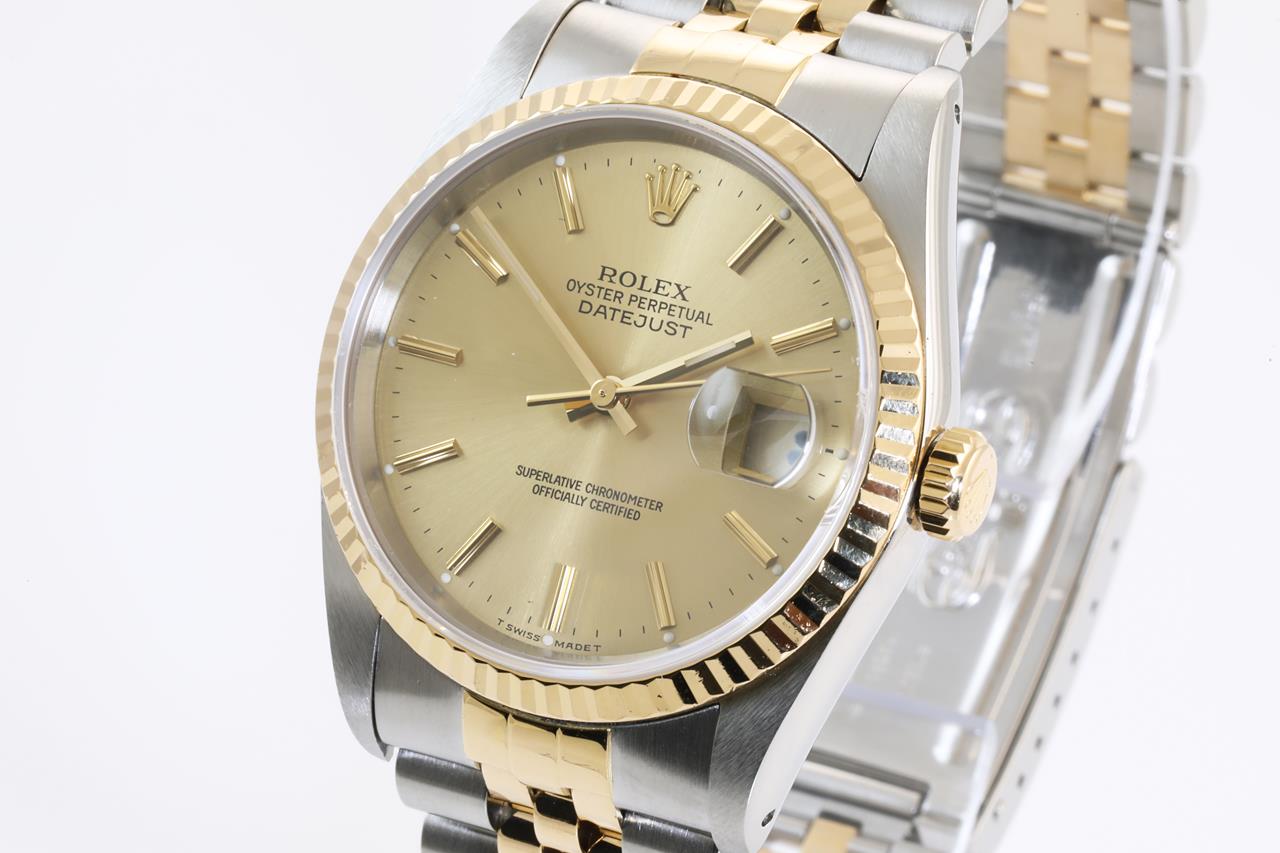 Rolex Oyster Perpetual Datejust 18ct yellow gold & stainless steel automatic mens watch. Gold dial, date, case diameter: 36mm, wrist size: 16cm, Swiss made. Ref# 16233, Circa: 1989. With Rolex two-tone Jubilee bracelet and clasp. With Certificate of Authenticity and Rolex guarantee certificate date December 1990. With two Rolex international service guarantee card dated 2011/03/08 & 2017/07/10 inside Rolex box. 3 month FSA warranty. (Pre-owned)