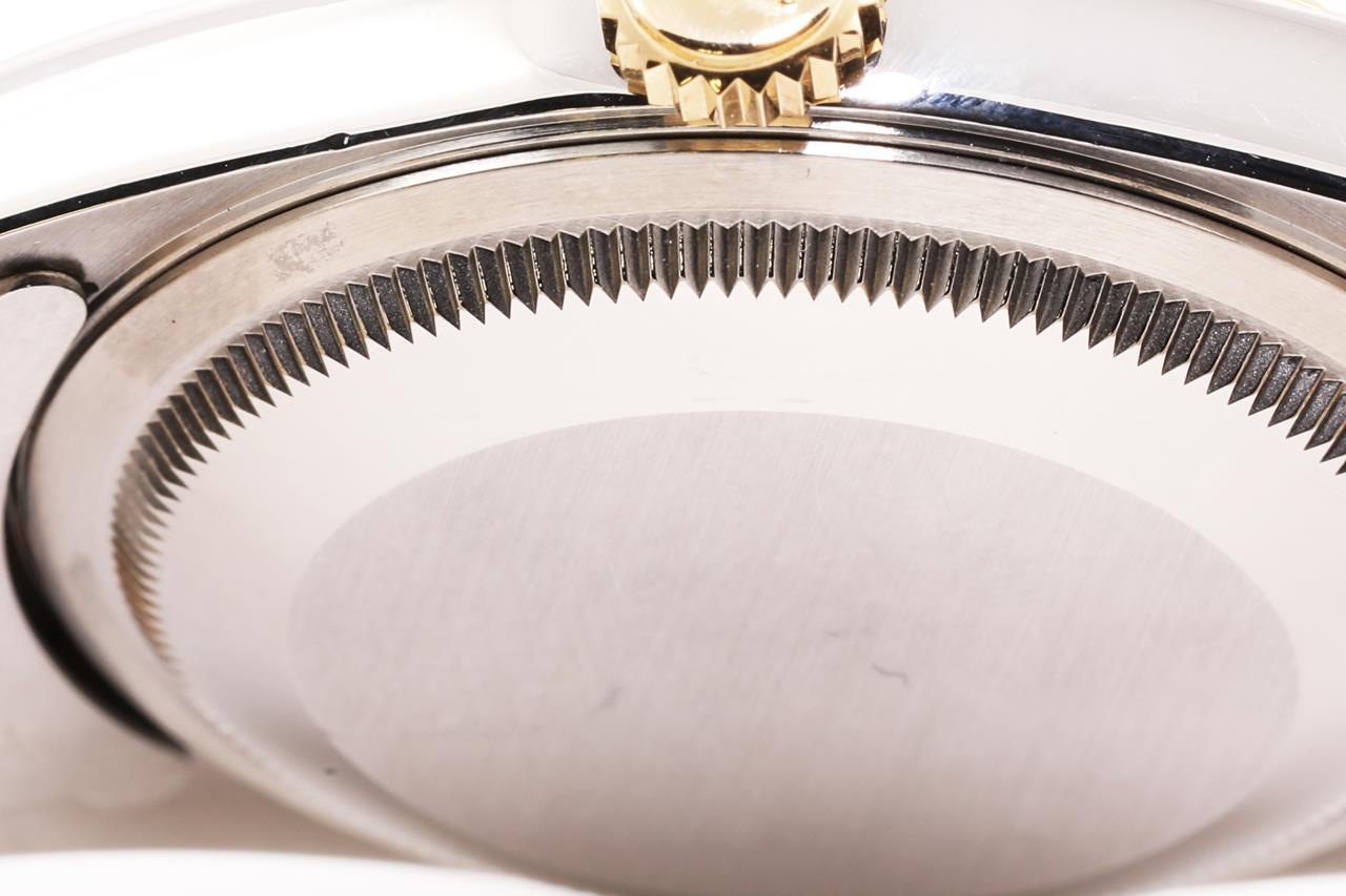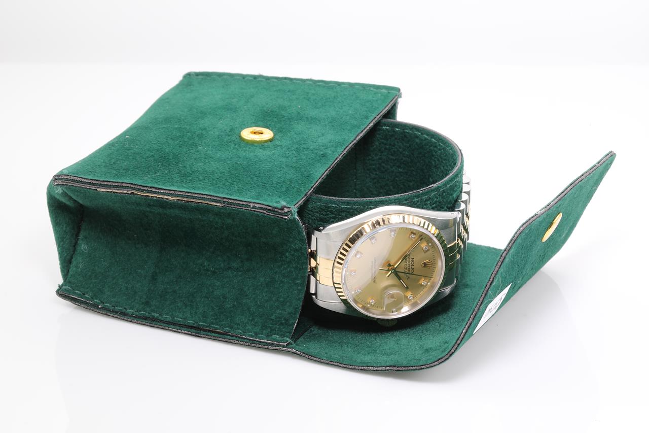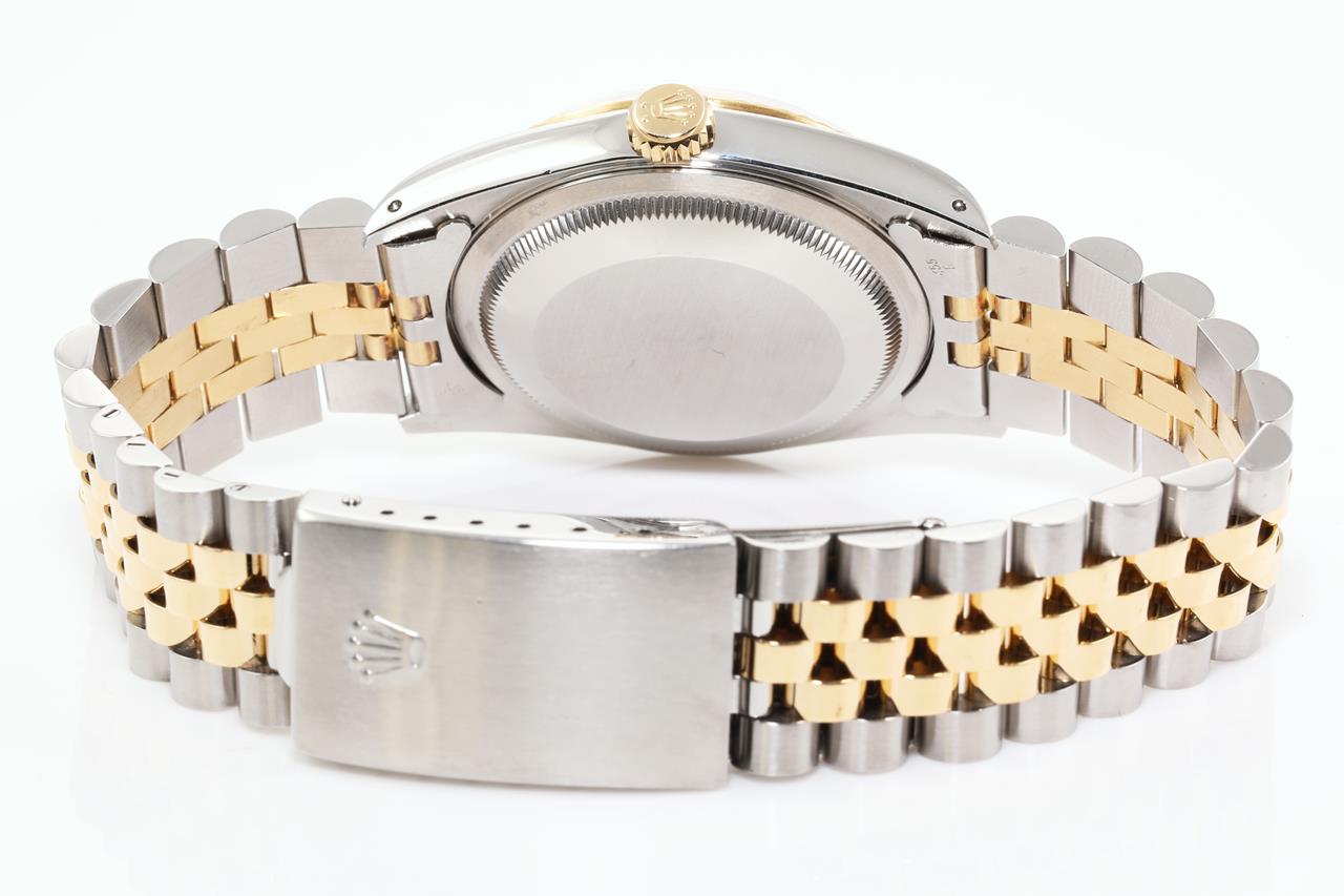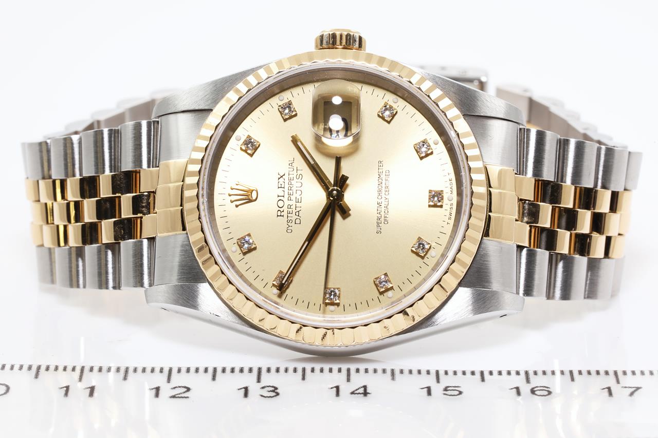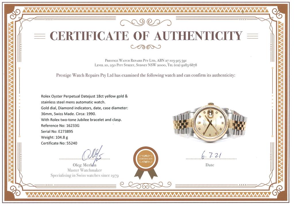 Rolex Oyster Perpetual Datejust 18ct yellow gold & stainless steel mens automatic watch. Gold dial, Diamond indicators, date, case diameter: 36mm, wrist size: 19cm, Swiss made. Ref# 16233G, Circa: 1990. With Rolex two-tone Jubilee bracelet and clasp. With certificate of authenticity, Rolex international service card dated 01/08/2021 and Rolex pouch. 3 month FSA warranty. (Pre-owned)