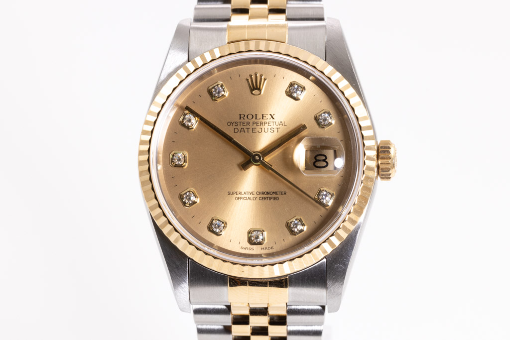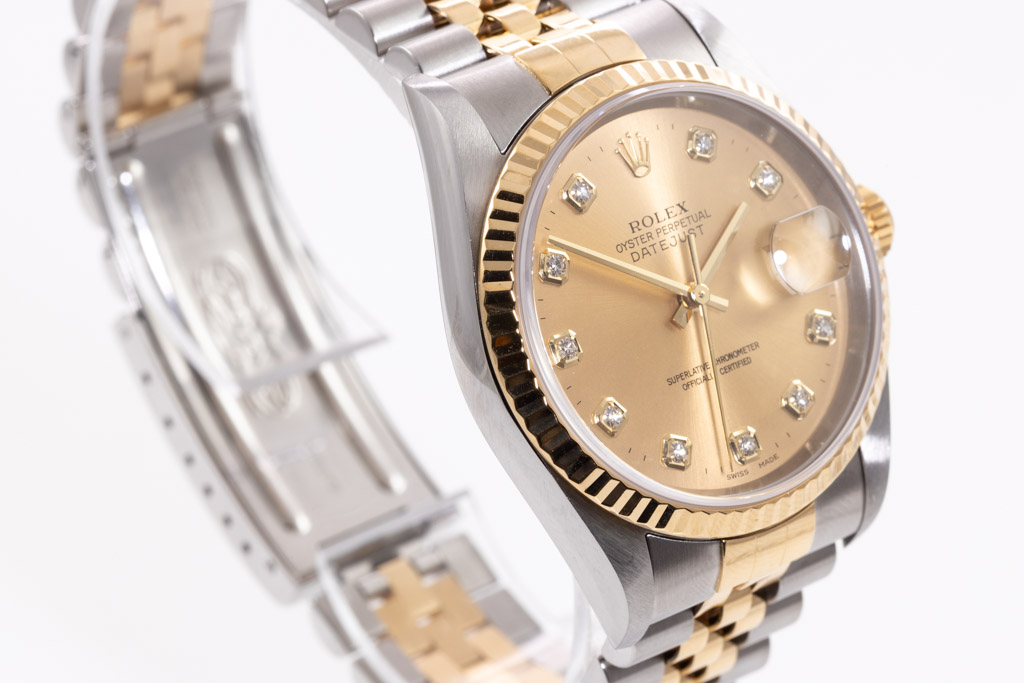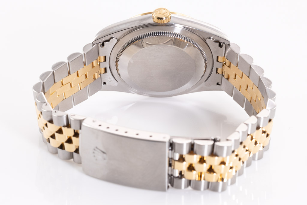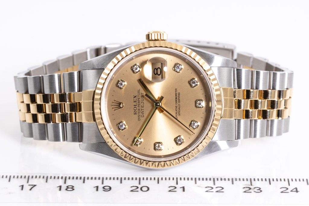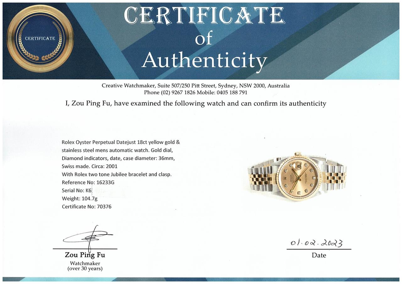 Rolex Oyster Perpetual Datejust 18ct yellow gold & stainless steel mens automatic watch. Gold dial, Diamond indicators, date, case diameter: 36mm, wrist size: 19cm, Swiss made. Ref# 16233G, Circa: 2001. With Rolex two tone Jubilee bracelet and clasp. With Certificate Authenticity, 2 Rolex International Service Guarantee cards dated 18/05/2021 & 04/07/2011 and Rolex box. 3 month FSA warranty. (Pre-owned)
