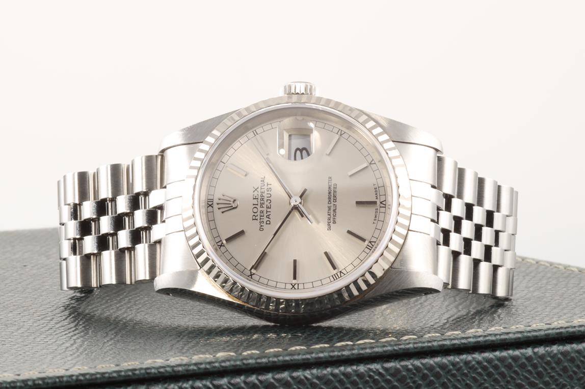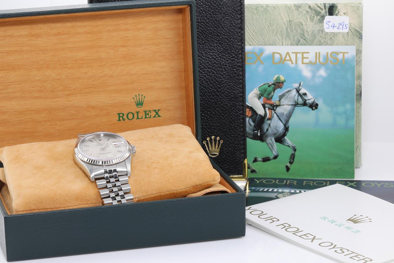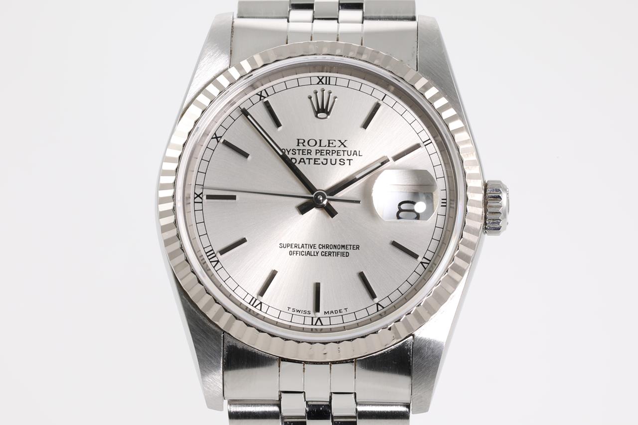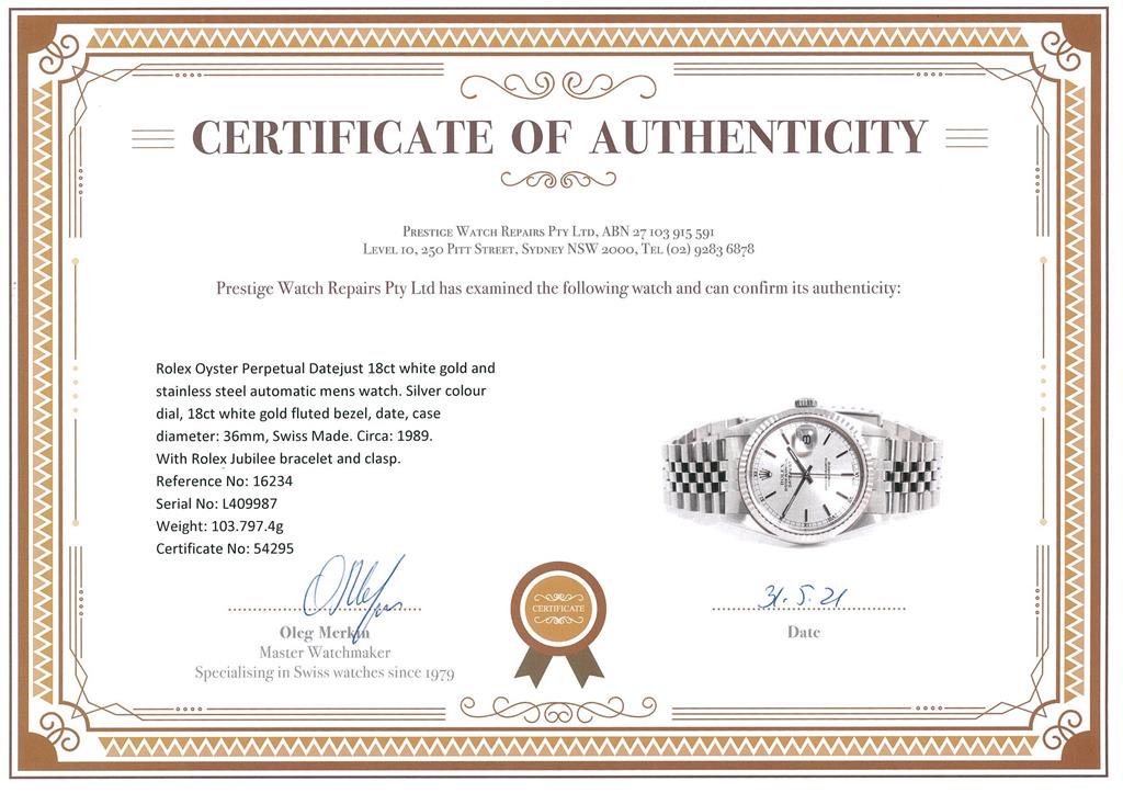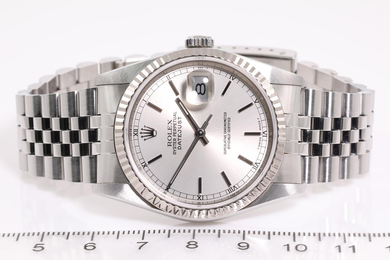 Rolex Oyster Perpetual Datejust 18ct white gold and stainless steel automatic mens watch. Silver dial, 18ct white gold fluted bezel, date, case diameter: 36mm, wrist size: 18cm, Swiss Made. Ref# 16234, Circa: 1989. With Rolex Jubilee bracelet and clasp. With Certificate of Authenticity, Rolex international guarantee certificate dated 12/11/1989 and Rolex box. 3 month FSA warranty. (Pre-owned)