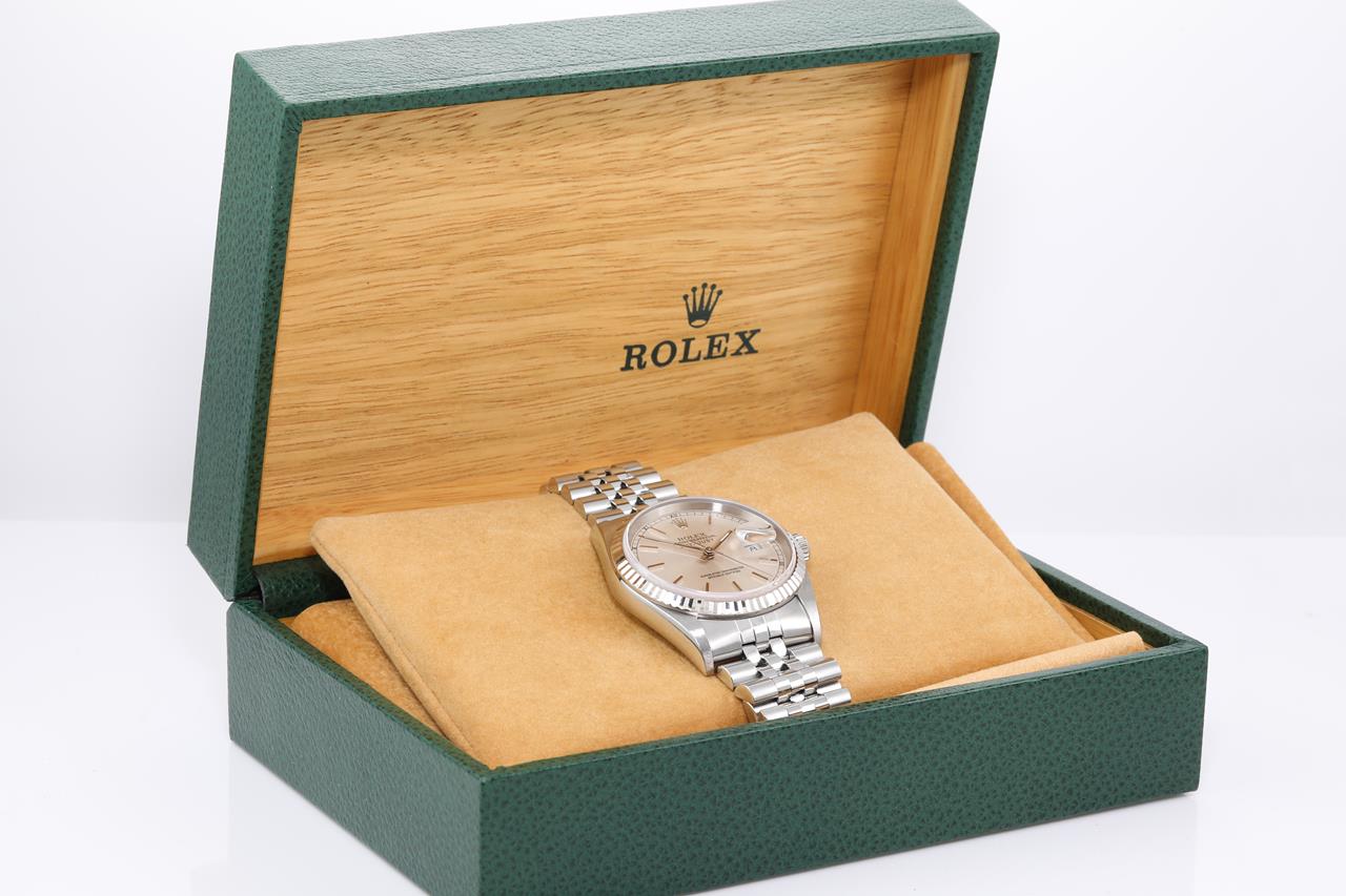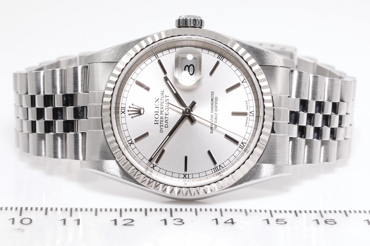 Rolex Oyster Perpetual Datejust 18ct white gold and stainless steel automatic mens watch. Silver dial, 18ct white gold fluted bezel, date, case diameter: 36mm, wrist size: 19cm, Swiss made. Ref# 16234, Circa: 2000. With Rolex Jubilee bracelet and clasp. With Certificate of Authenticity and Rolex box. 3 month FSA warranty. (Pre-owned)