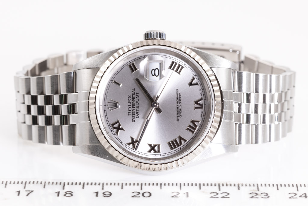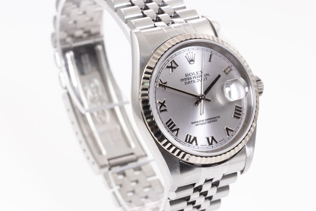 Rolex Oyster Perpetual Datejust stainless steel automatic men's watch. Silver dial, 18ct white gold fluted bezel, date, case diameter: 36mm, wrist size: 19.5cm, Swiss made. Ref# 16234, Circa: 2004. With Rolex stainless steel jubilee bracelet and clasp. With Certificate of Authenticity, Rolex International Service Guarantee Certificate dated 14/01/2010 and Rolex pouch. 3 month FSA warranty. (Pre-owned)