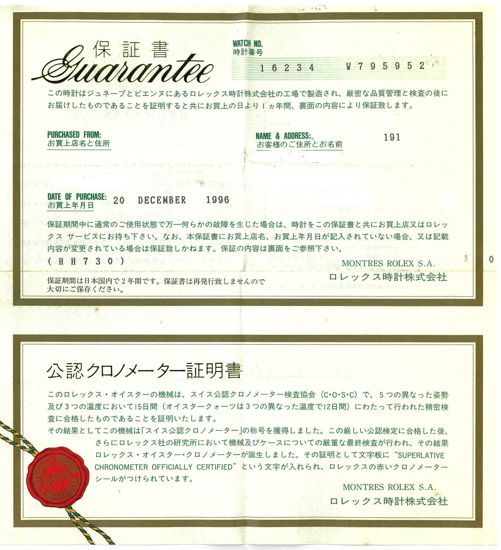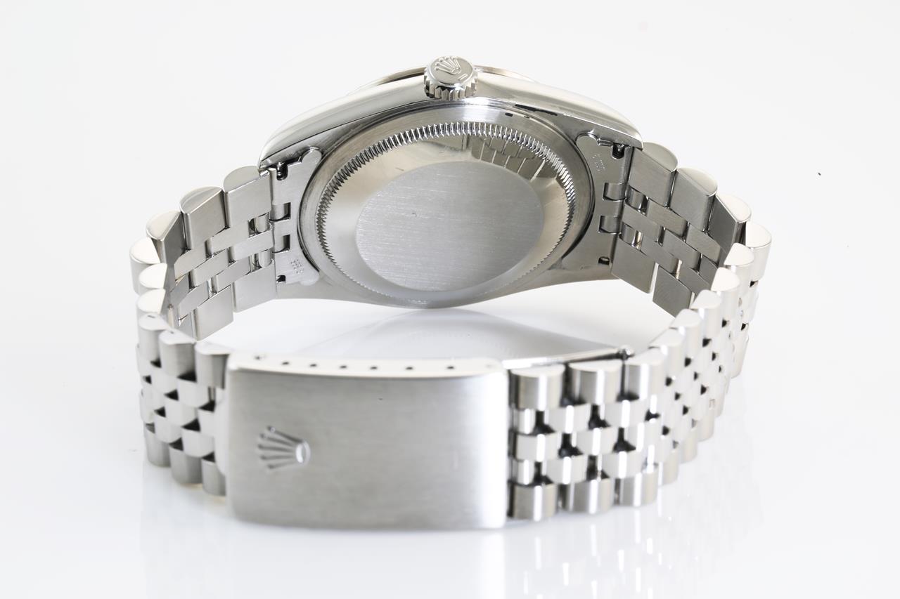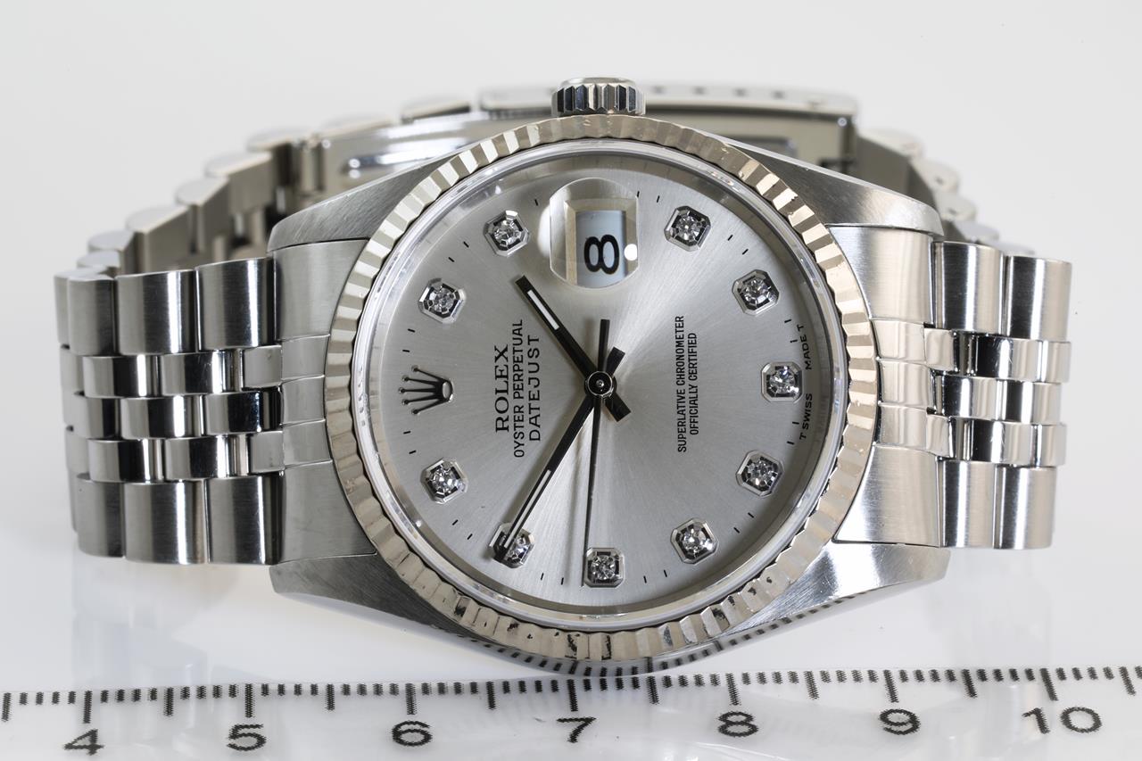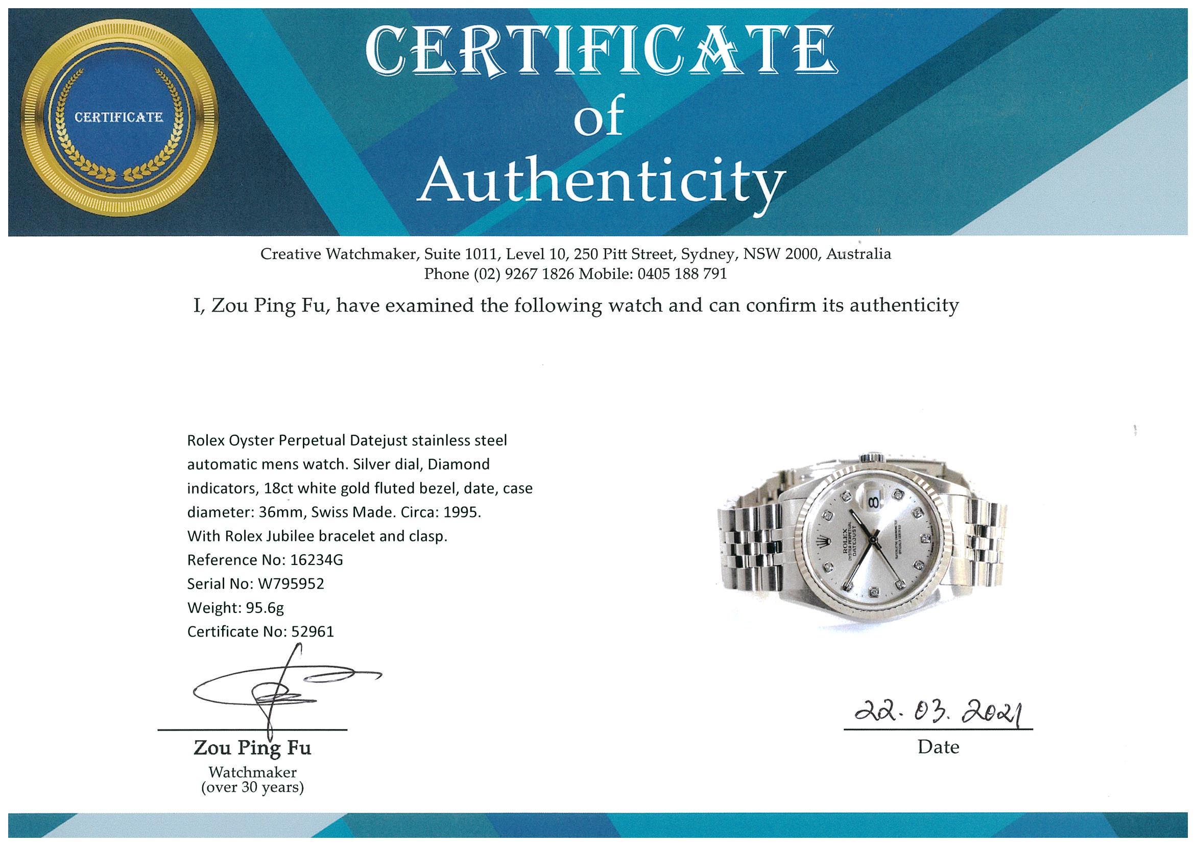 Rolex Oyster Perpetual Datejust stainless steel automatic mens watch. Silver dial, Diamond indicators, 18ct white gold fluted bezel, date, case diameter: 36mm, wrist size: 17.5cm, Swiss made. Ref #16234G, Circa: 1995. With Rolex Jubilee bracelet and clasp. With Rolex Guarantee Certificate dated 20/12/1996 and certificate of authenticity. With Rolex international service guarantee card dated 28/10/2011 & 29/9/2017 inside Rolex box. 3 month FSA warranty (Pre-owned)