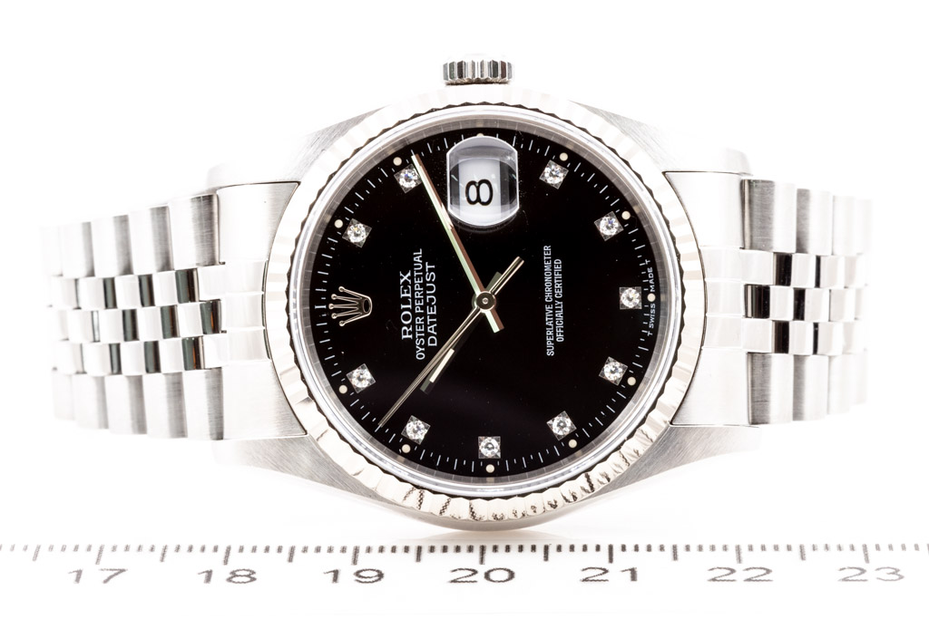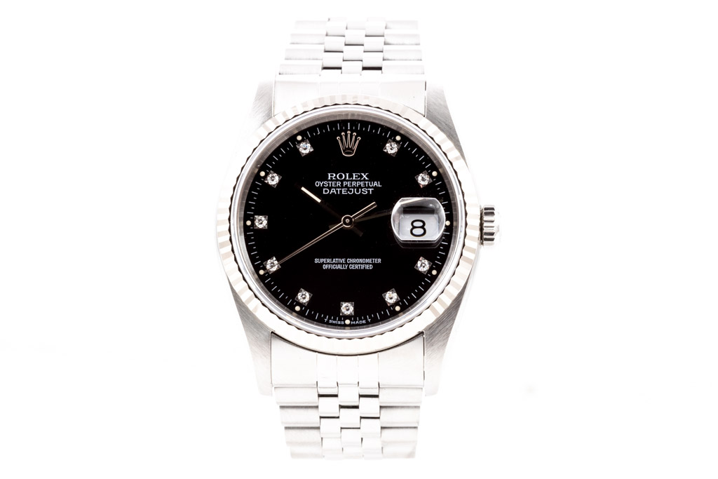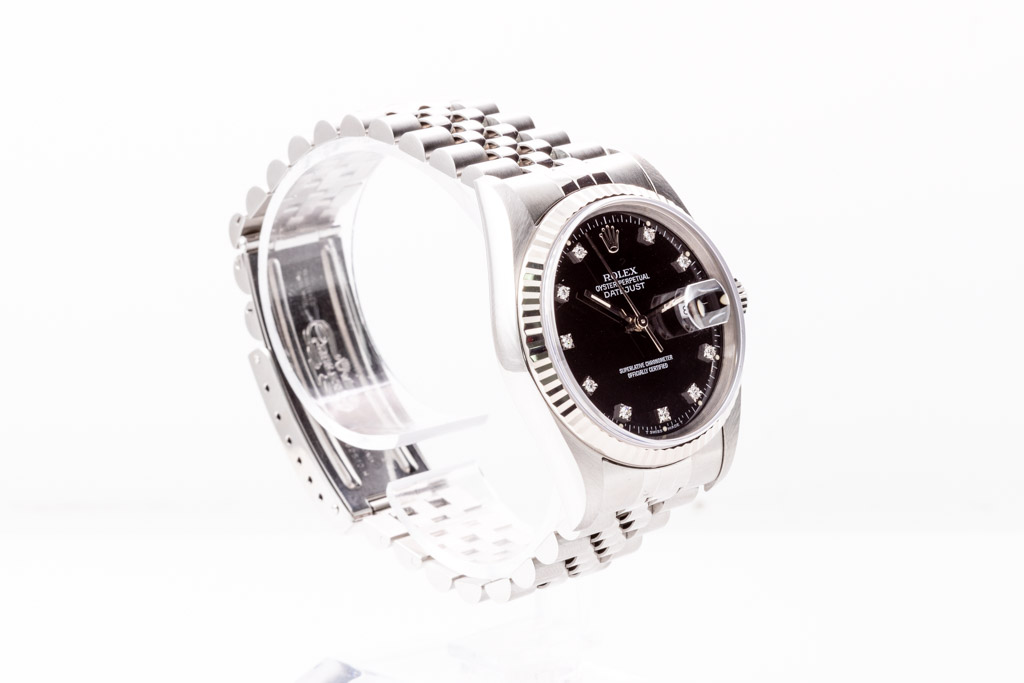 Rolex Oyster Perpetual Datejust stainless steel automatic mens watch. Black dial, Diamond indicators, date, case diameter: 36mm, wrist size: 17.5cm, Swiss made. Ref# 16234G, Circa: 1994. With Rolex stainless steel jubilee bracelet and clasp. With Certificate of Authenticity and Rolex box. 3 month FSA warranty. (Pre-owned)