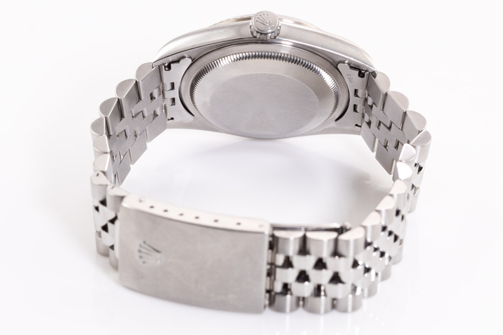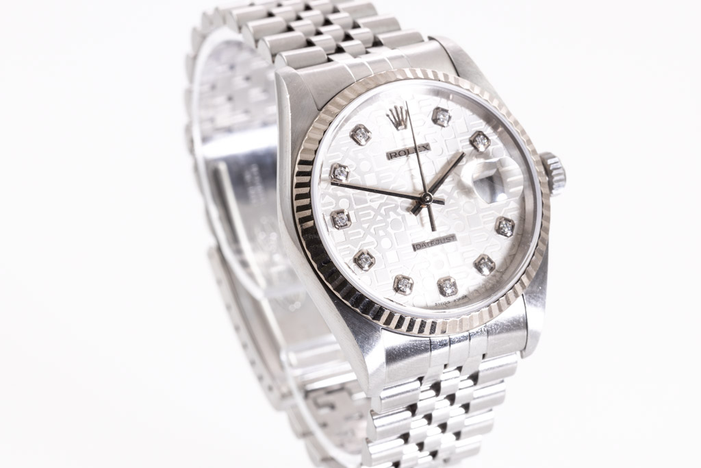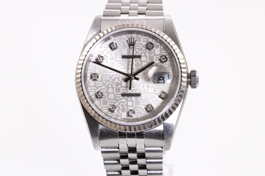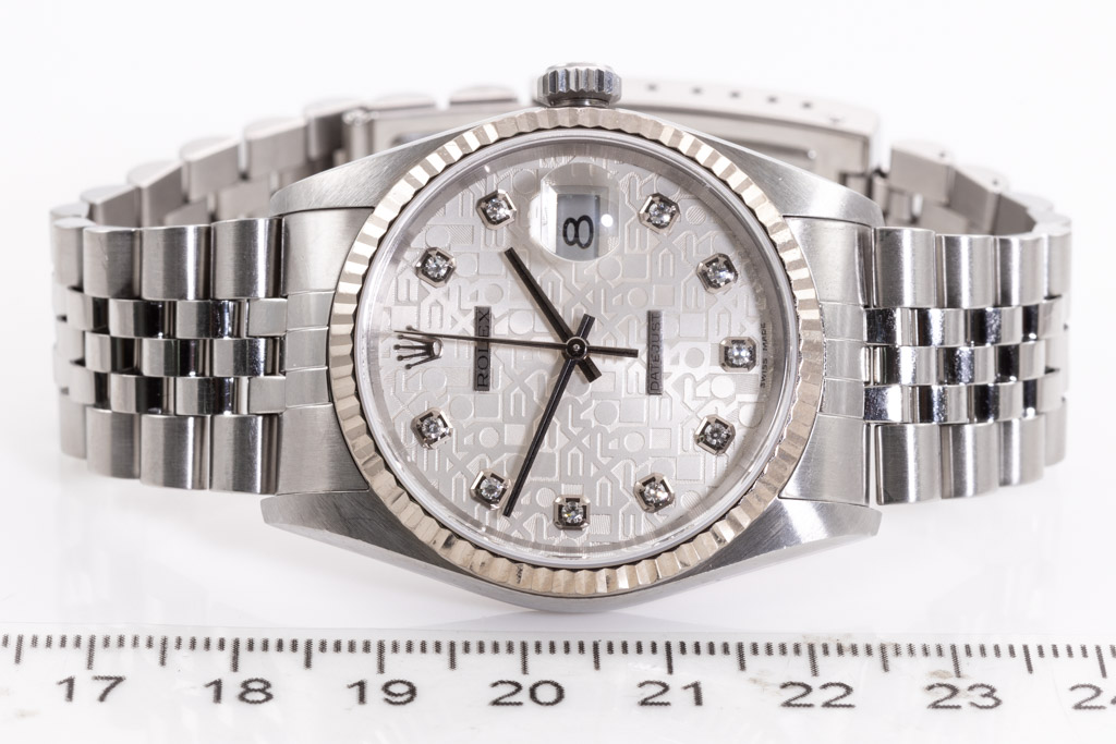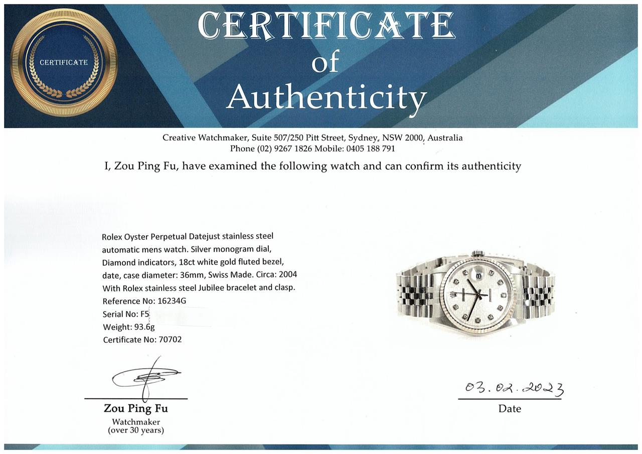Rolex Oyster Perpetual Datejust stainless steel automatic mens watch. Silver monogram dial, Diamond indicators, 18ct white gold fluted bezel, date, case diameter: 36mm, wrist size: 18.5cm, Swiss Made. Ref# 16234G, Circa: 2004. With Rolex stainless steel Jubilee bracelet and clasp. With Certificate of Authenticity, Rolex International Service card dated 04/03/2021, Rolex Guarantee Certificate and Rolex box. Balance of 2 year Rolex Service warranty applies. (Pre-owned)