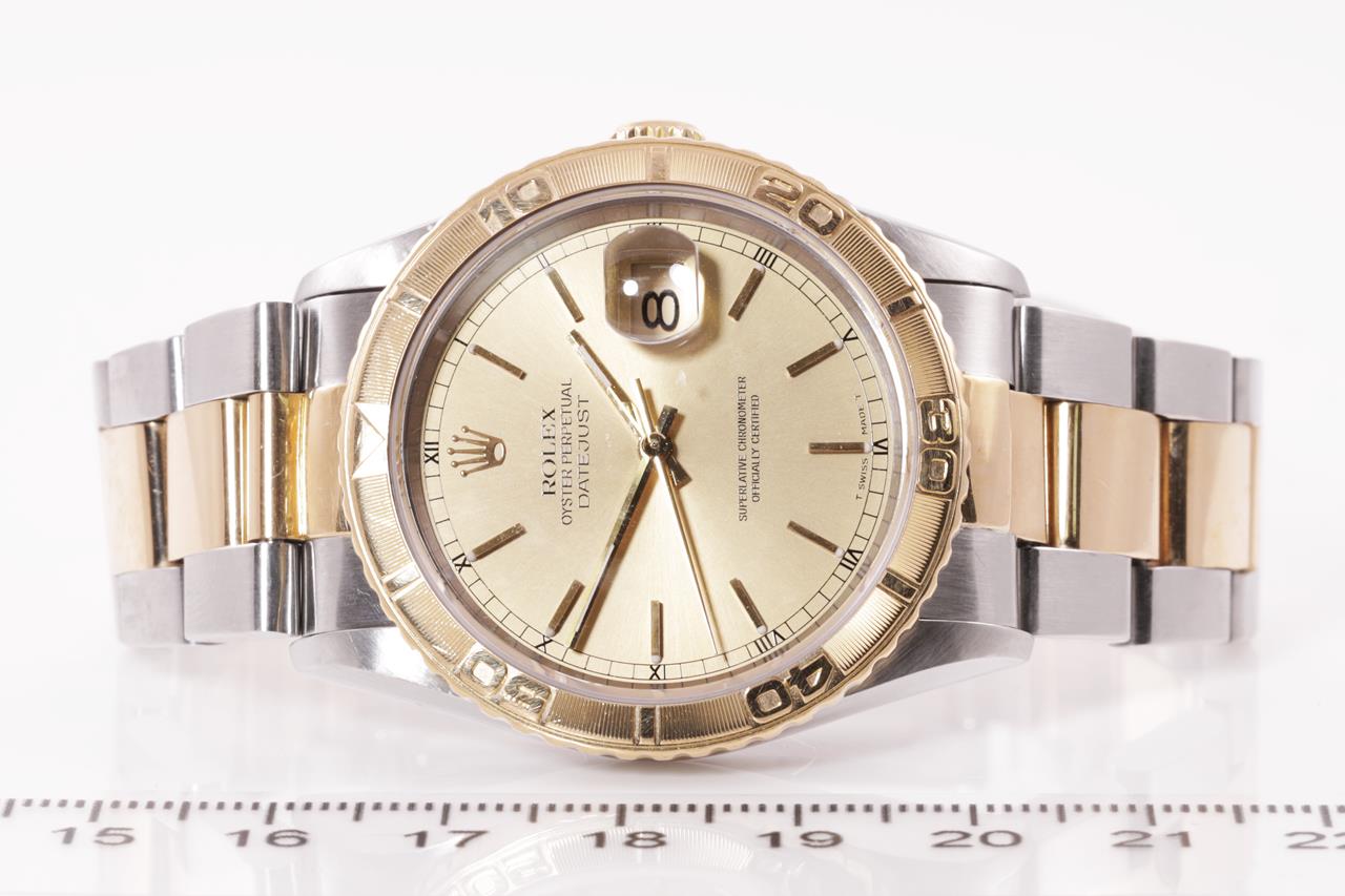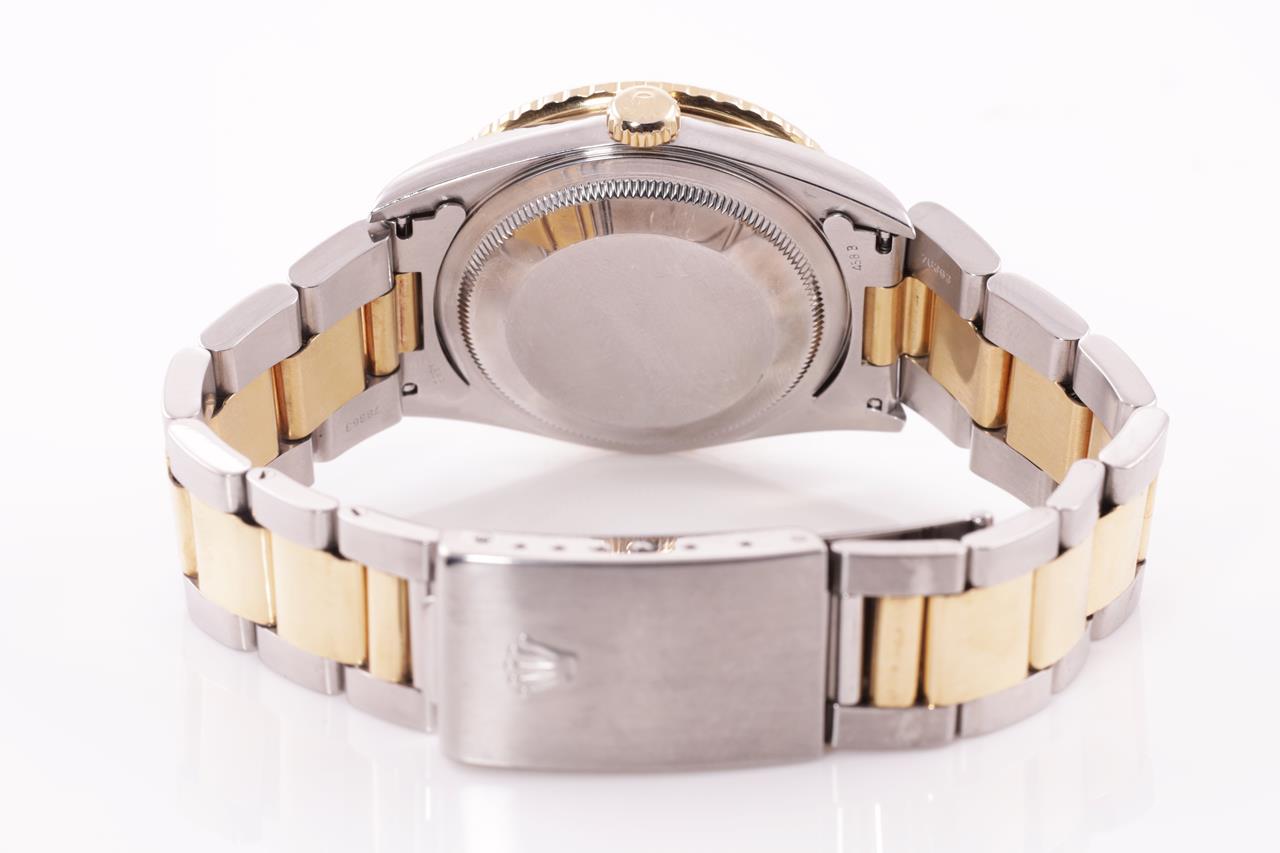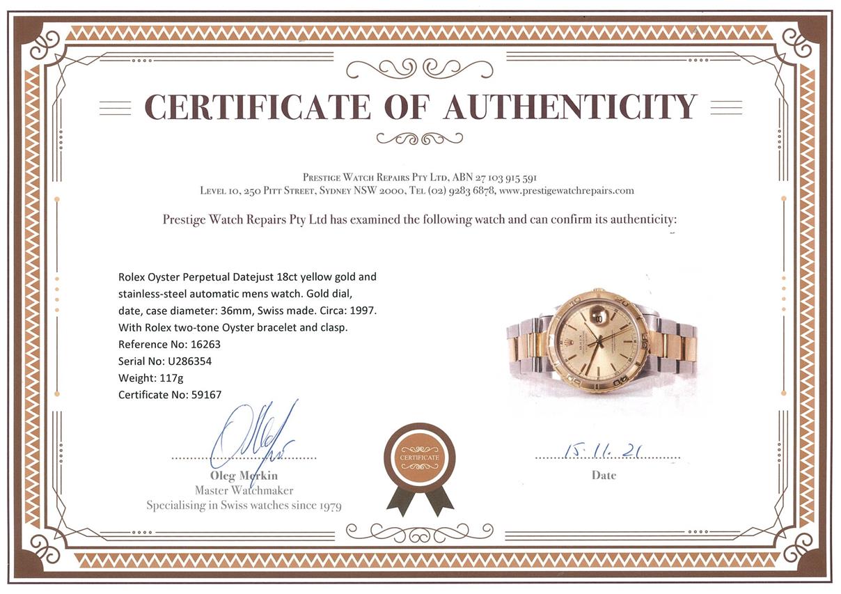 1809: Rolex Oyster Perpetual Datejust 18ct yellow gold and stainless steel automatic mens watch. Gold dial, date, wrist size: 18cm, case diameter: 36mm, Swiss made. Ref# 16263, Circa: 1997. With Rolex two-tone Oyster bracelet and clasp. With Certificate of Authenticity, Rolex guarantee certificate dated 16/11/98 and Rolex box. 3 month FSA warranty. (Pre-owned)