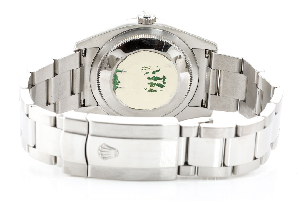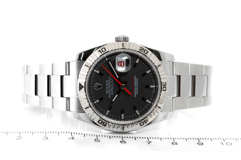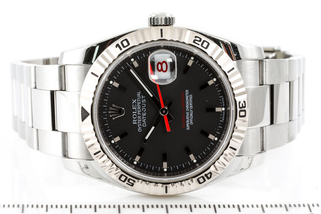 Rolex Oyster Perpetual Datejust Turn-O-Graph stainless steel and 18ct white gold mens watch. Black dial, date, case diameter: 36mm, wrist size: 18.5cm, Swiss made. Ref# 116264, Circa: 2006 or 2007. With Rolex stainless steel Oyster bracelet and clasp. With Certificate of Authenticity and Rolex box. 3 month FSA warranty. (Pre-owned)