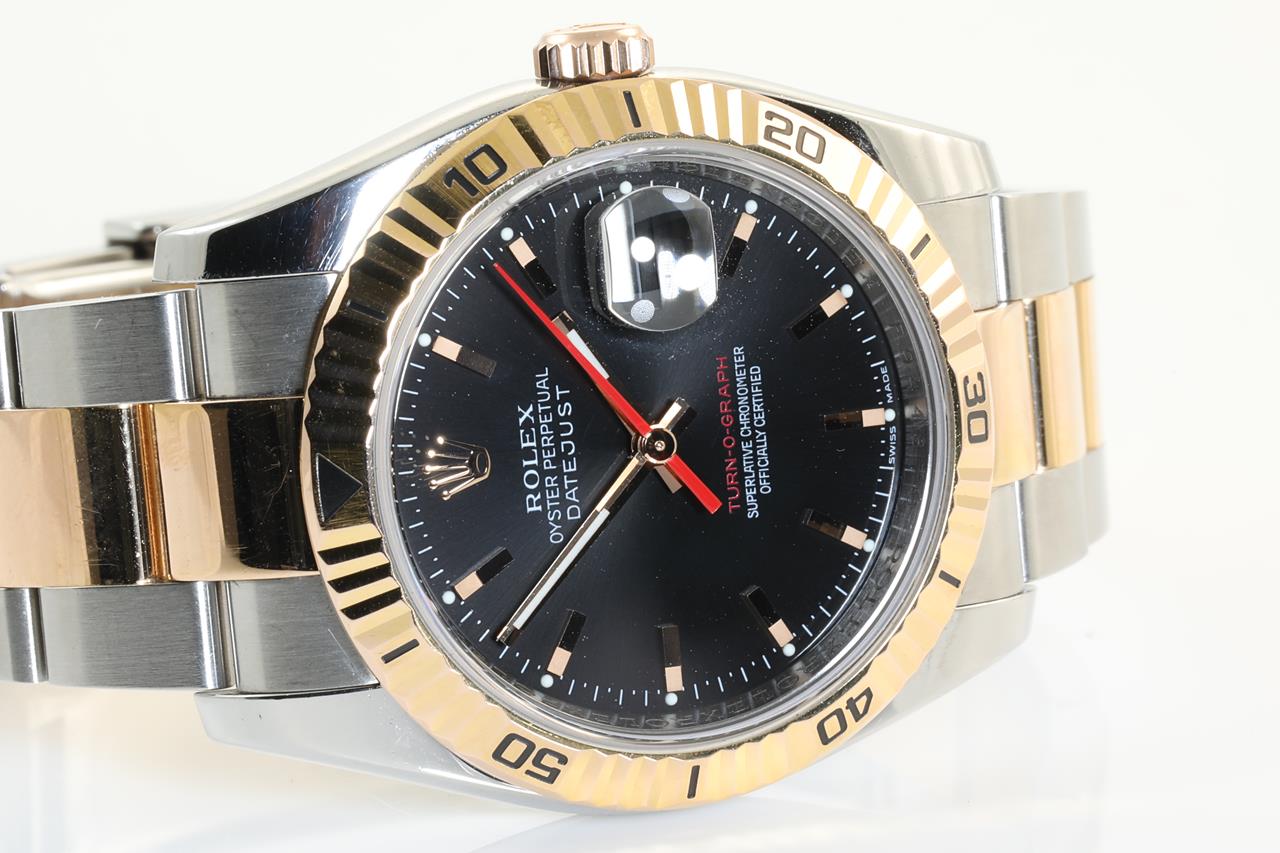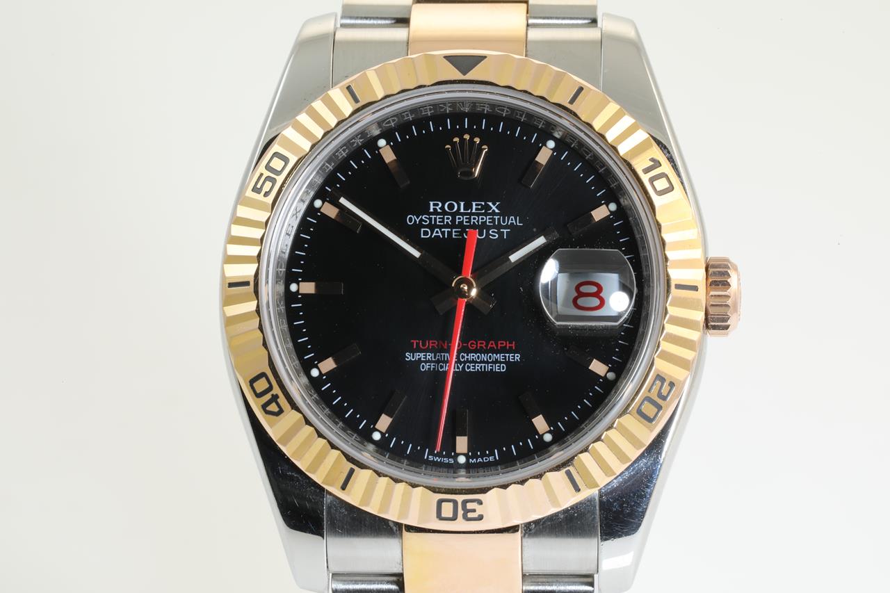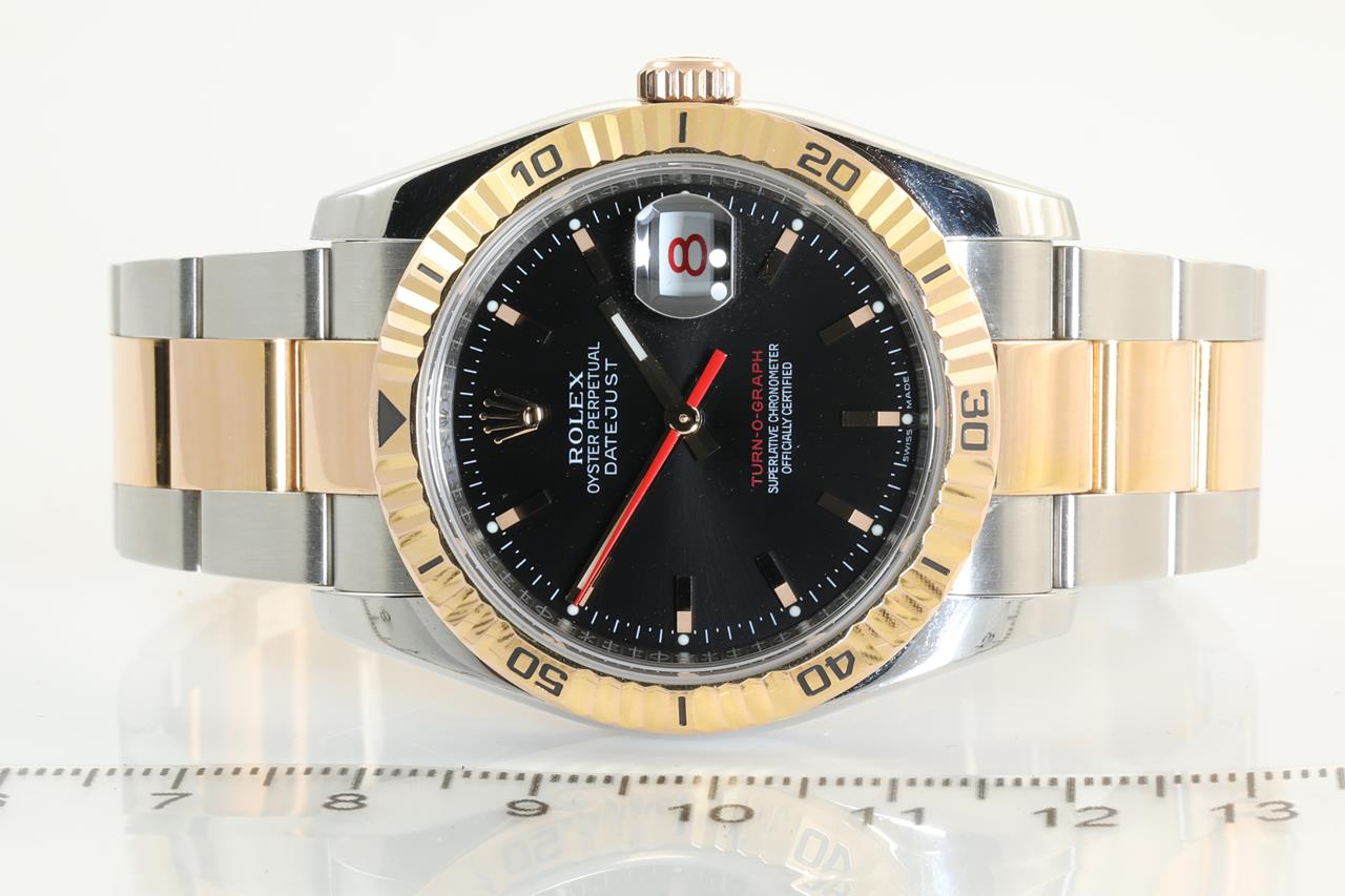 Rolex Datejust Turn-O-Graph 18ct rose gold and stainless steel automatic mens watch. Black dial, red date, 18ct rose gold fluted bezel, case diameter: 36mm, wrist size: 17cm, Ref# 116261, Swiss made. Circa: 2005. With Rolex two-tone Oyster bracelet and clasp. With Certificate of Authenticity and 3 month FSA warranty. (Pre-owned)
