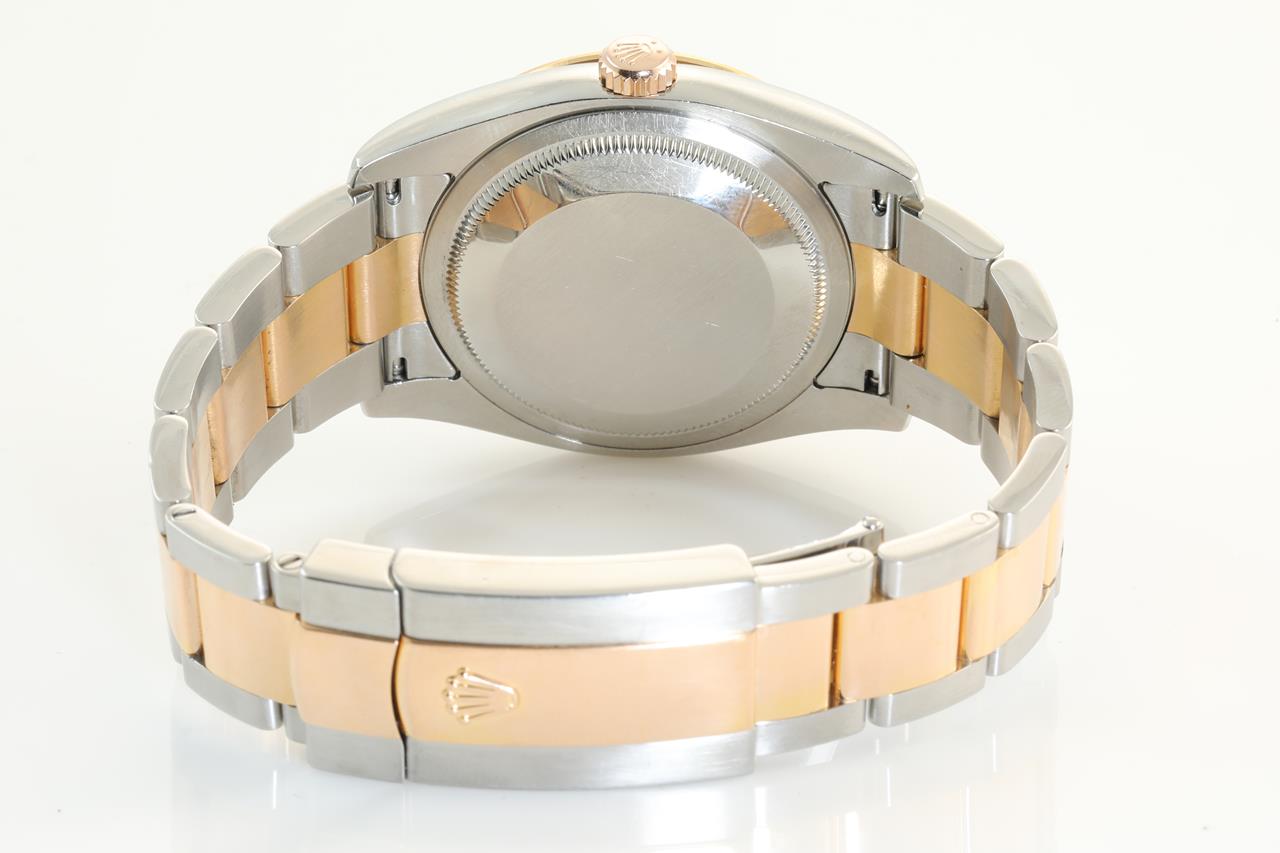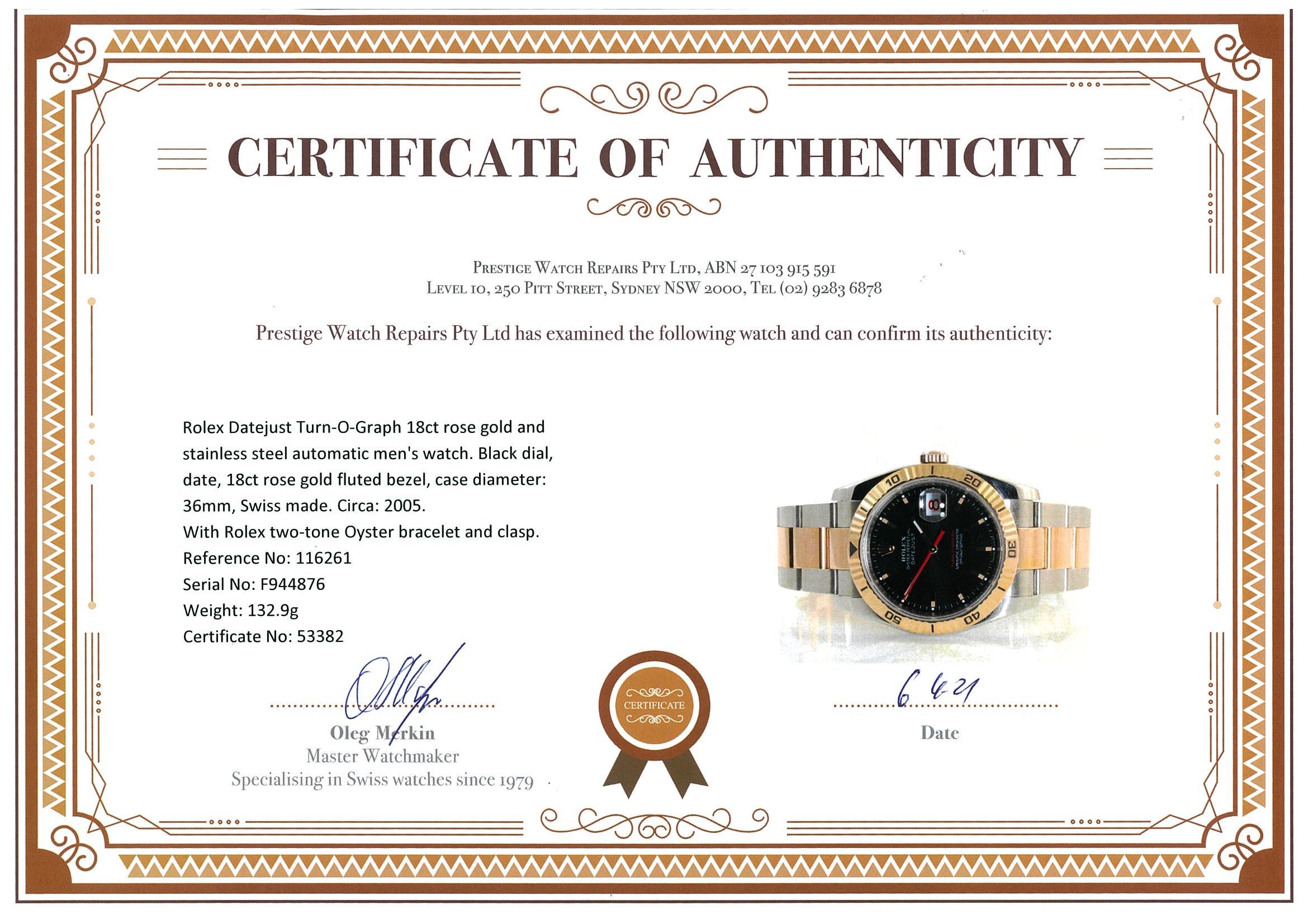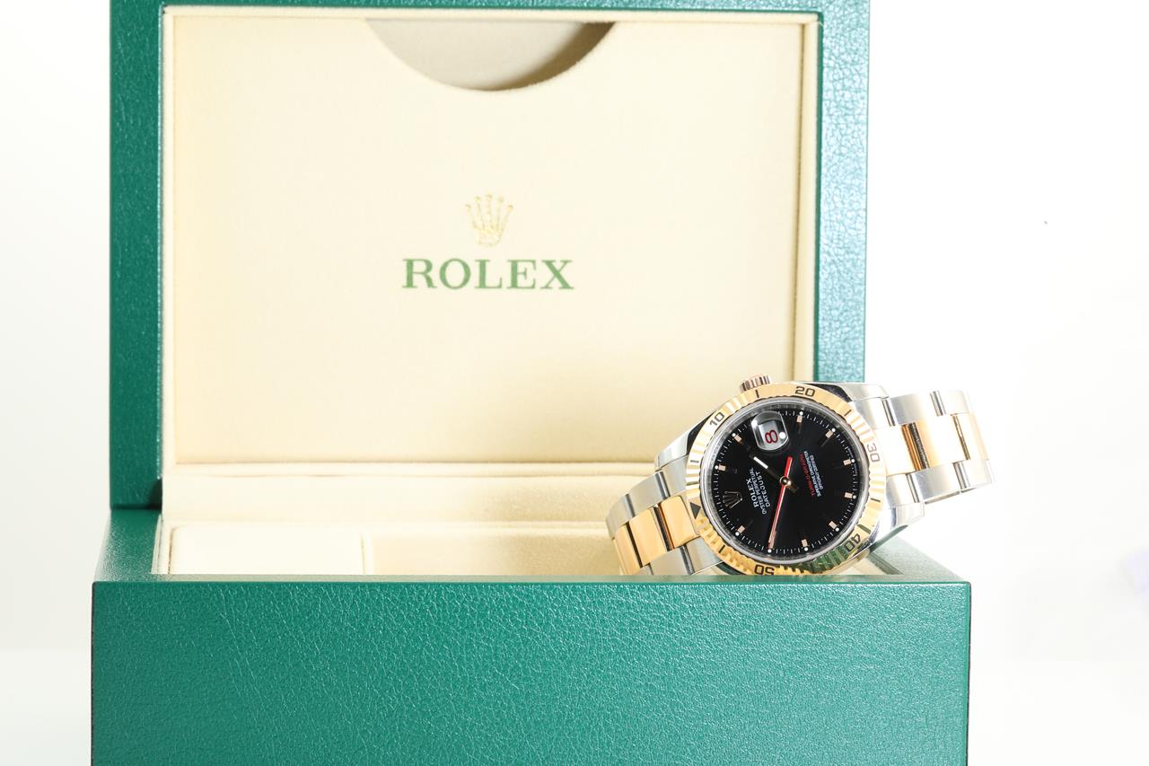 Rolex Datejust Turn-O-Graph 18ct rose gold and stainless steel automatic mens watch. Black dial, red date, 18ct rose gold fluted bezel, case diameter: 36mm, wrist size: 17cm, Ref# 116261, Swiss made. Circa: 2005. With Rolex two-tone Oyster bracelet and clasp. With Certificate of Authenticity and 3 month FSA warranty. (Pre-owned)