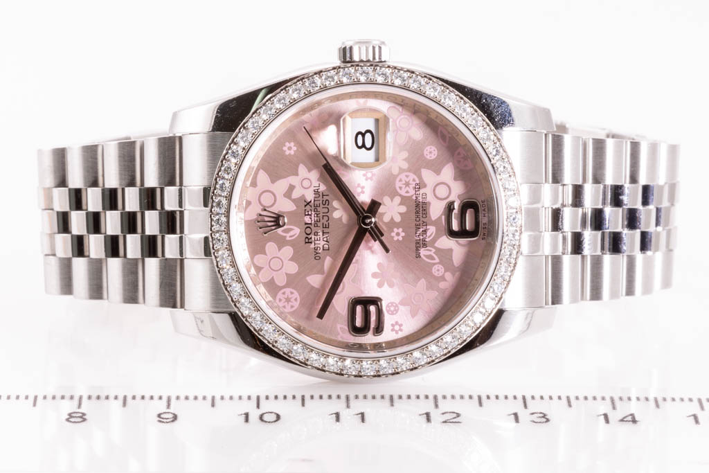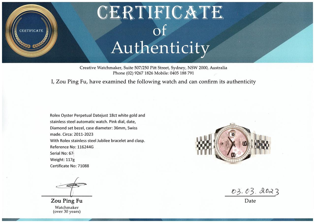 Rolex Oyster Perpetual Datejust 18ct white gold and stainless steel automatic watch. Pink floral dial, date, Diamond set bezel, case diameter: 36mm, wrist size: 18cm, Swiss made. Ref# 116244G. Circa: 2011-2023. With Rolex stainless steel Jubilee bracelet and clasp. With Certificate of Authenticity and Rolex box. 3 month FSA warranty. (Pre-owned)