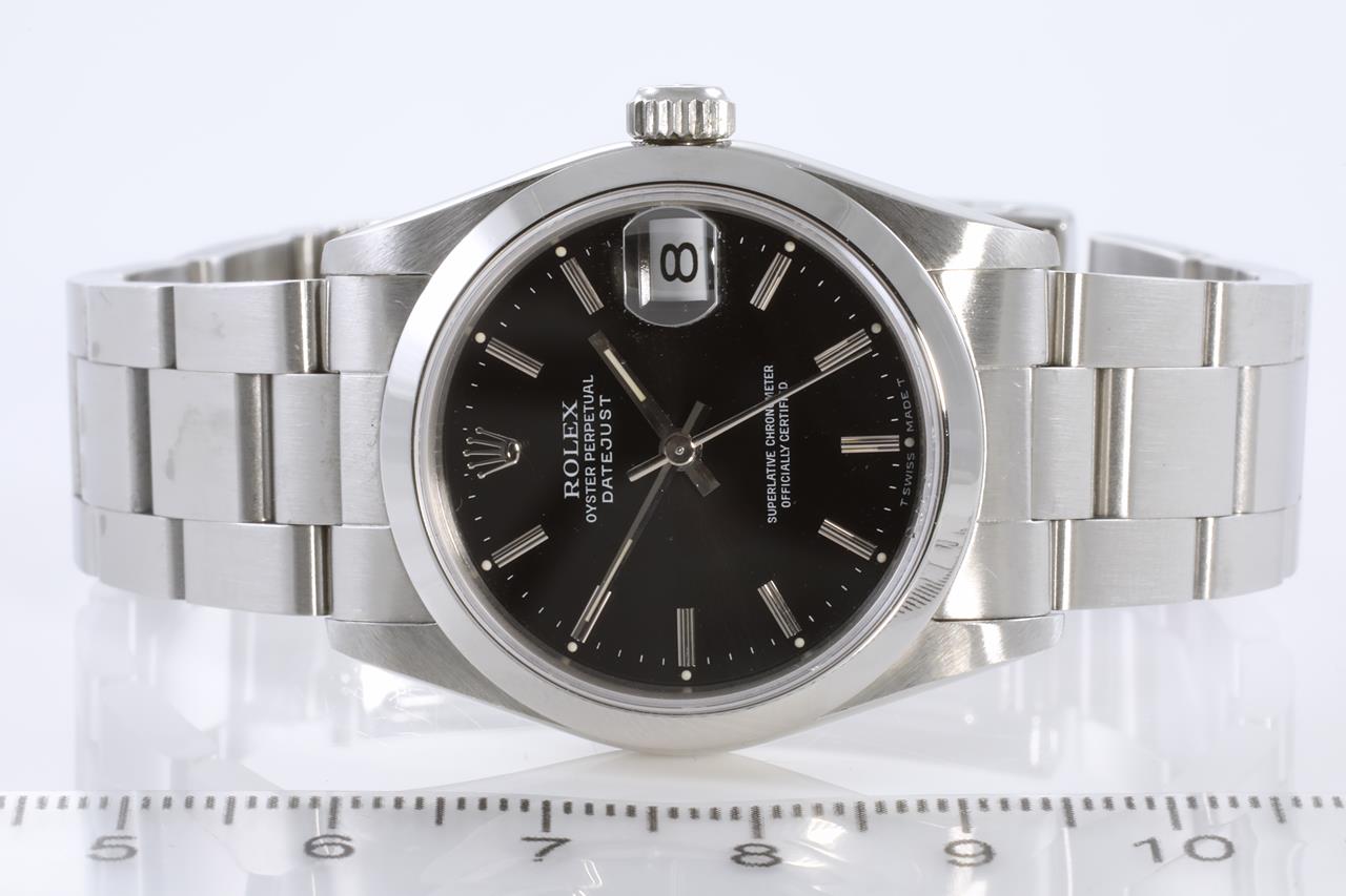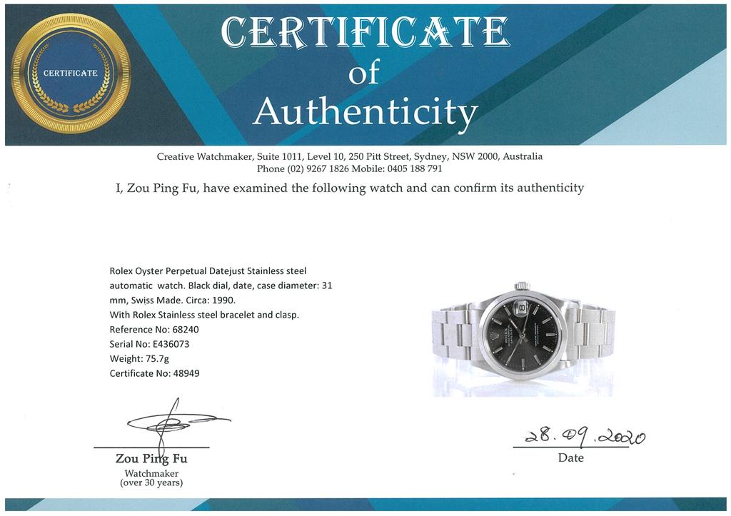 Rolex Oyster Perpetual Datejust Stainless steel automatic watch. Black dial, date, case diameter: 31 mm, wrist size: 16cm. Ref #68240, Swiss Made. Circa: 1990. With Rolex Stainless steel bracelet and clasp. With Certificate of Authenticity. With Creative Full service invoice dated 22/9/20. With 3 month FSA warranty. (Pre-owned)