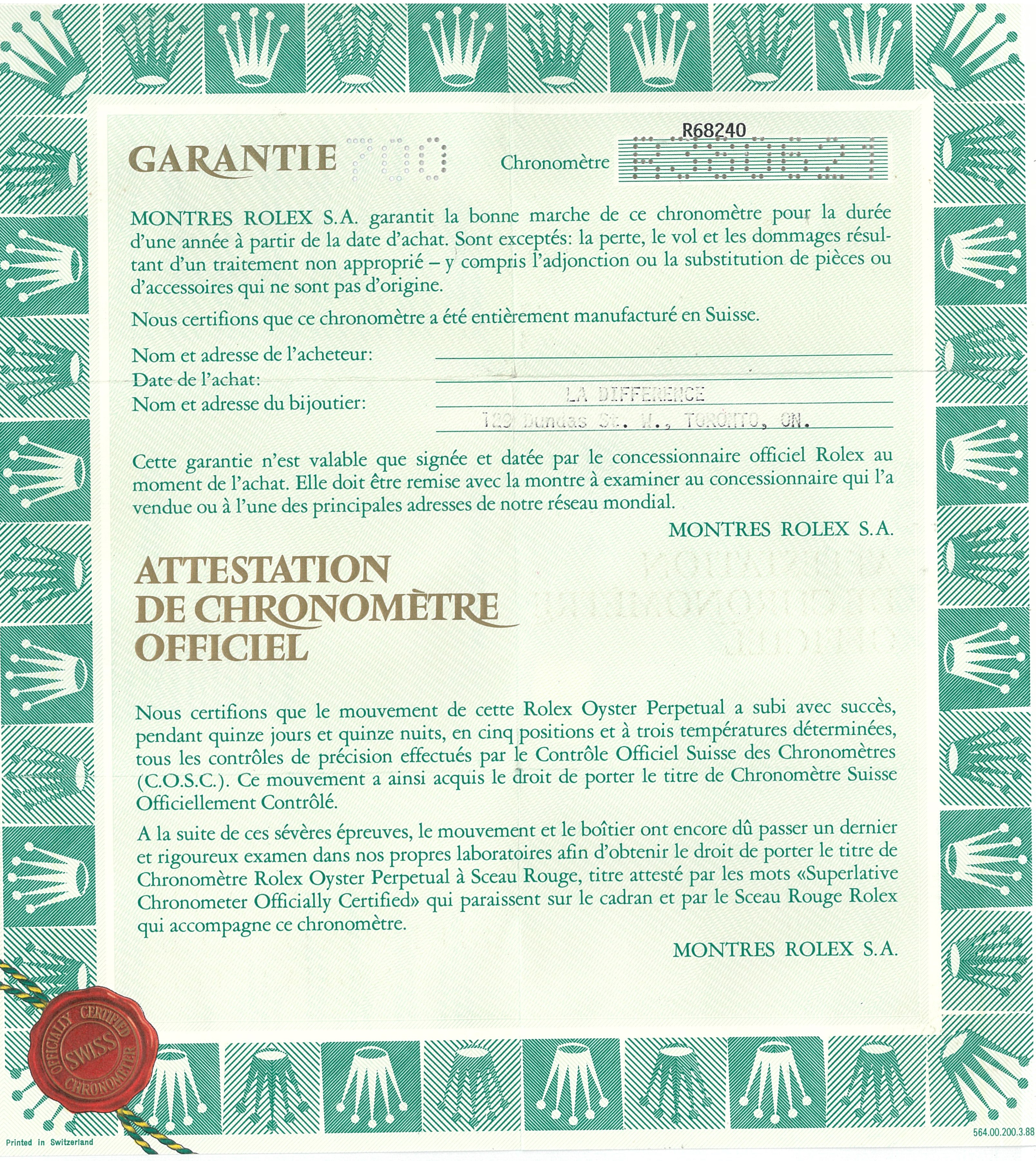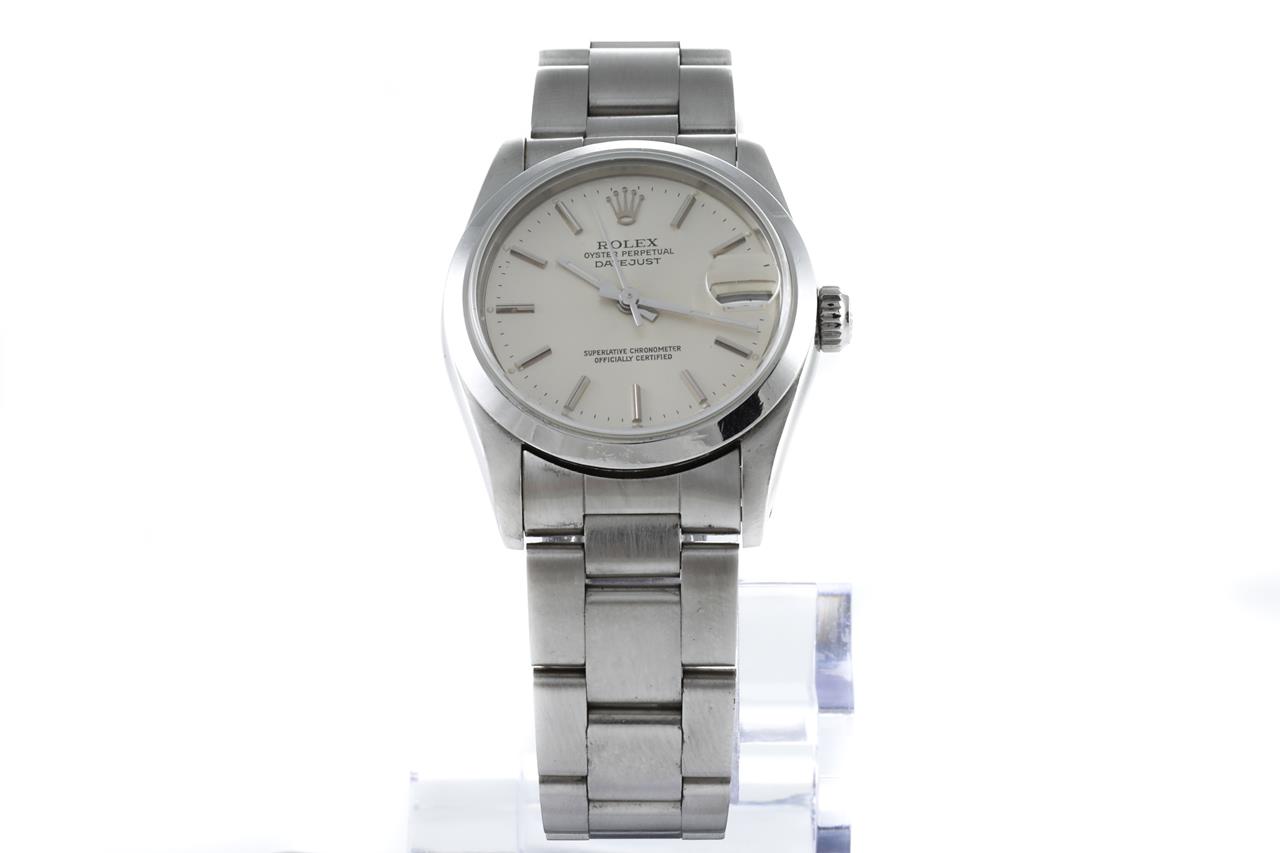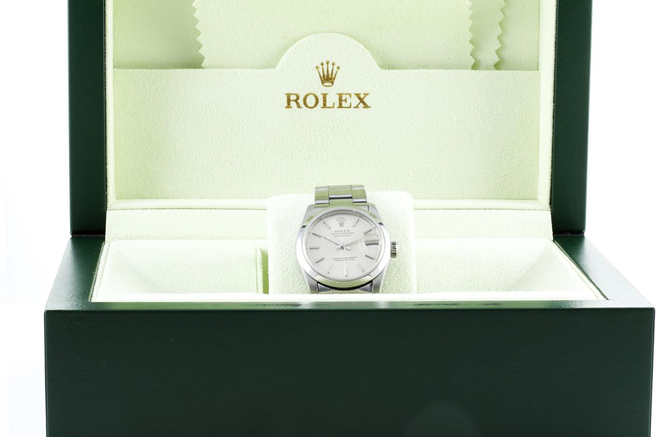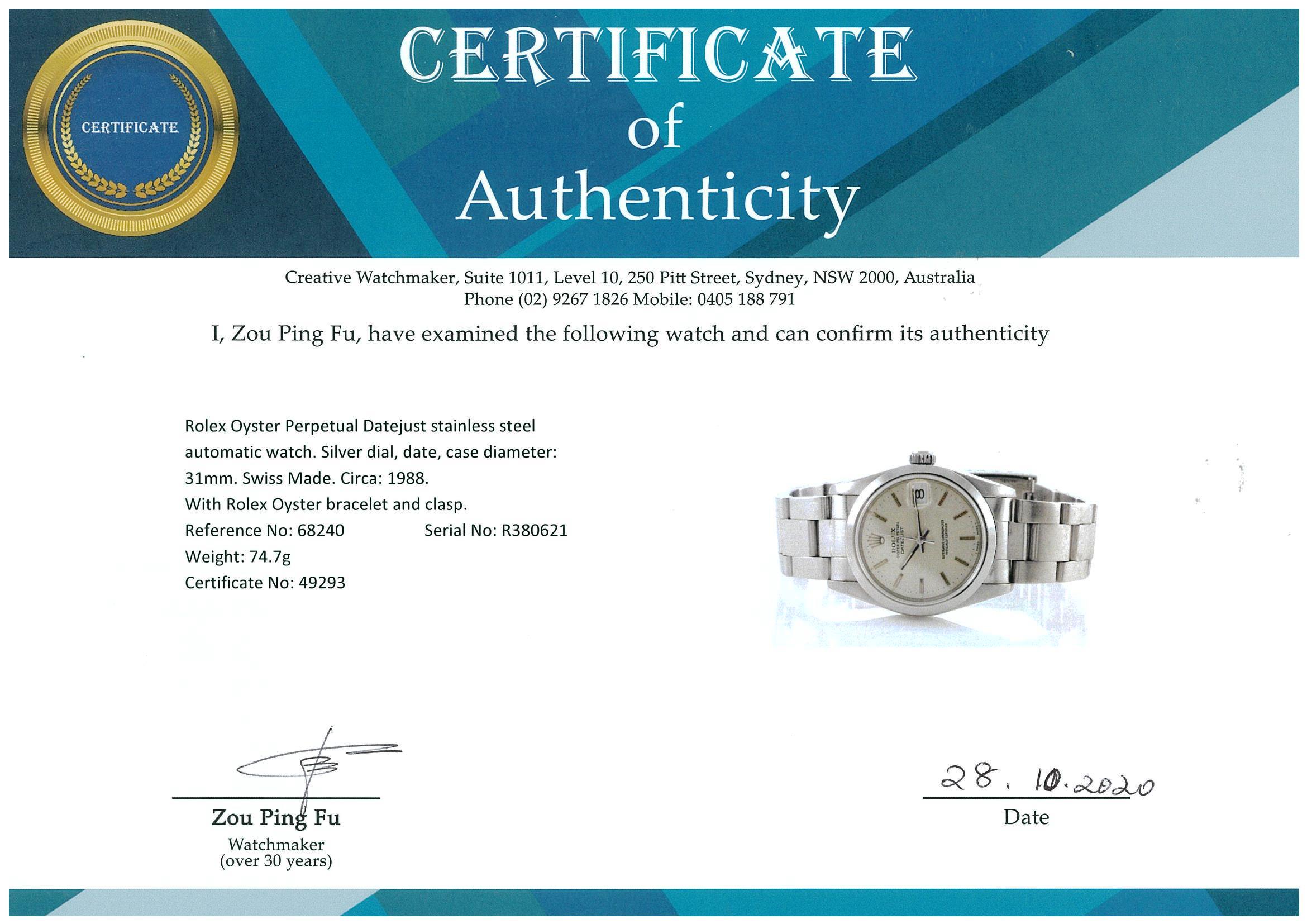 Rolex Oyster Perpetual Datejust stainless steel automatic watch. Silver dial, date, case diameter: 31mm, wrist size: 16cm. Ref #68240, Swiss Made. Circa: 1988. With Rolex Oyster bracelet and clasp. With Certificate of Authenticity, Rolex guarantee certificate & Rolex box. 6 months Creative watchmaker warranty from the date of full service. (Pre-owned)