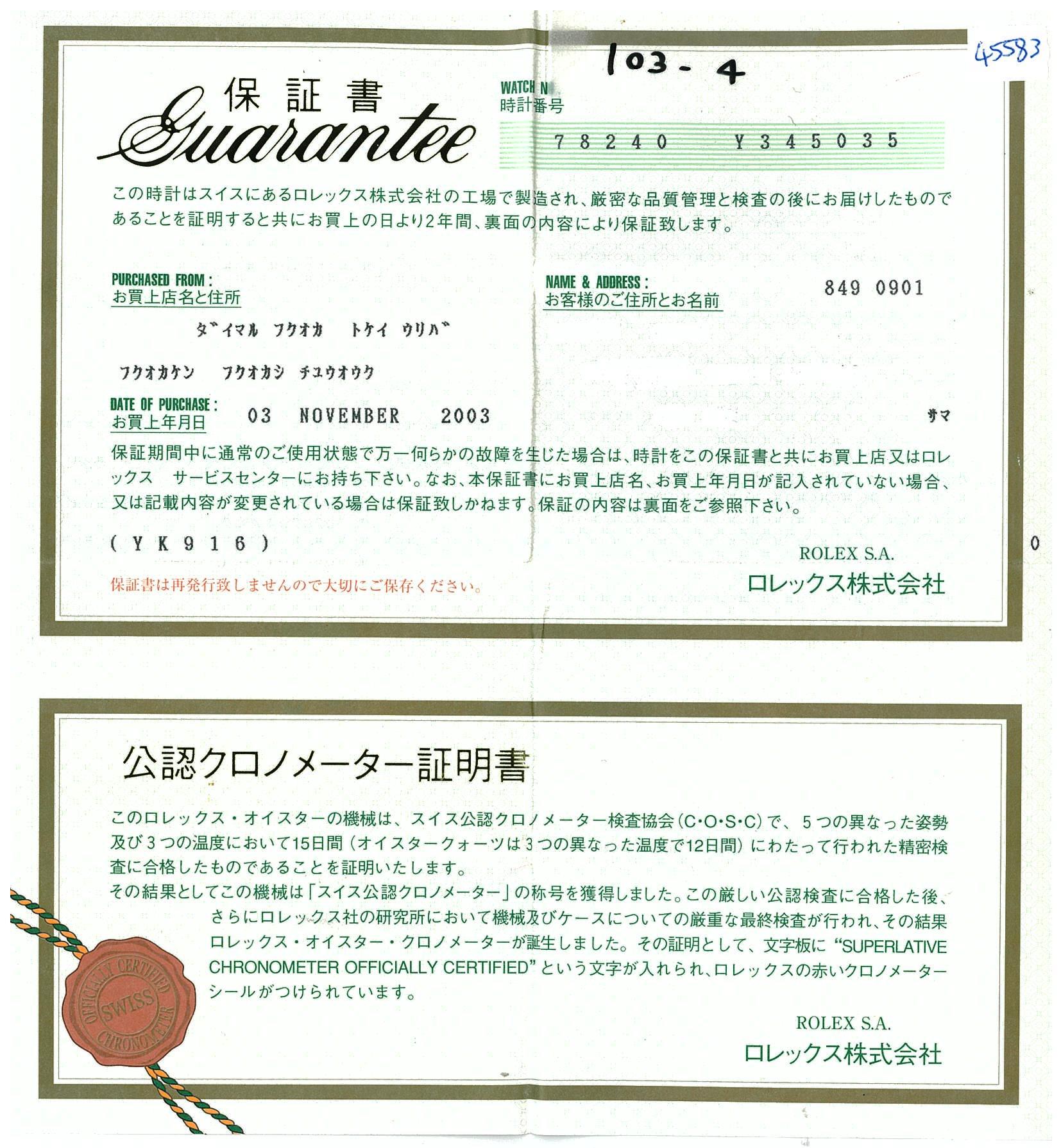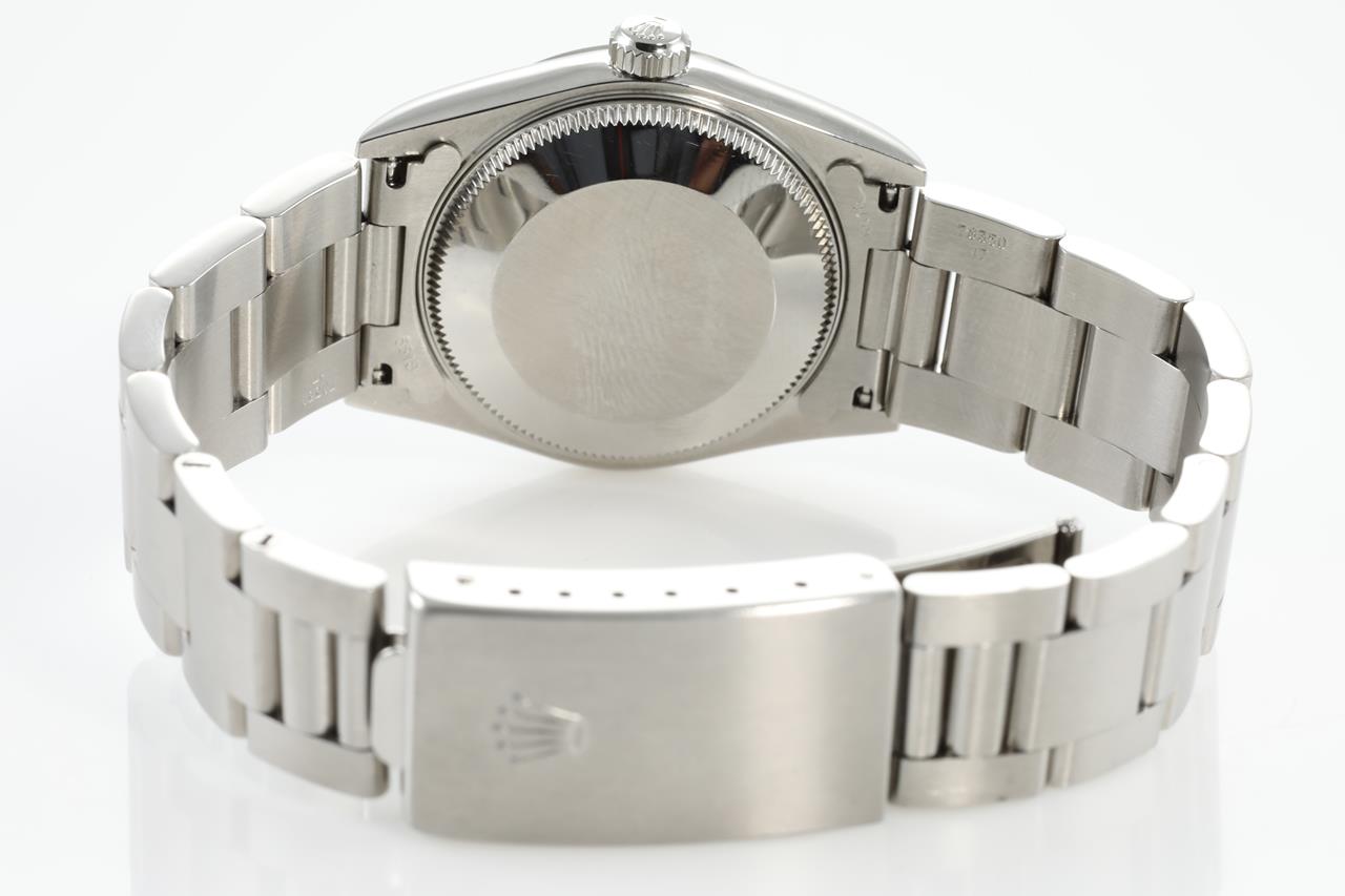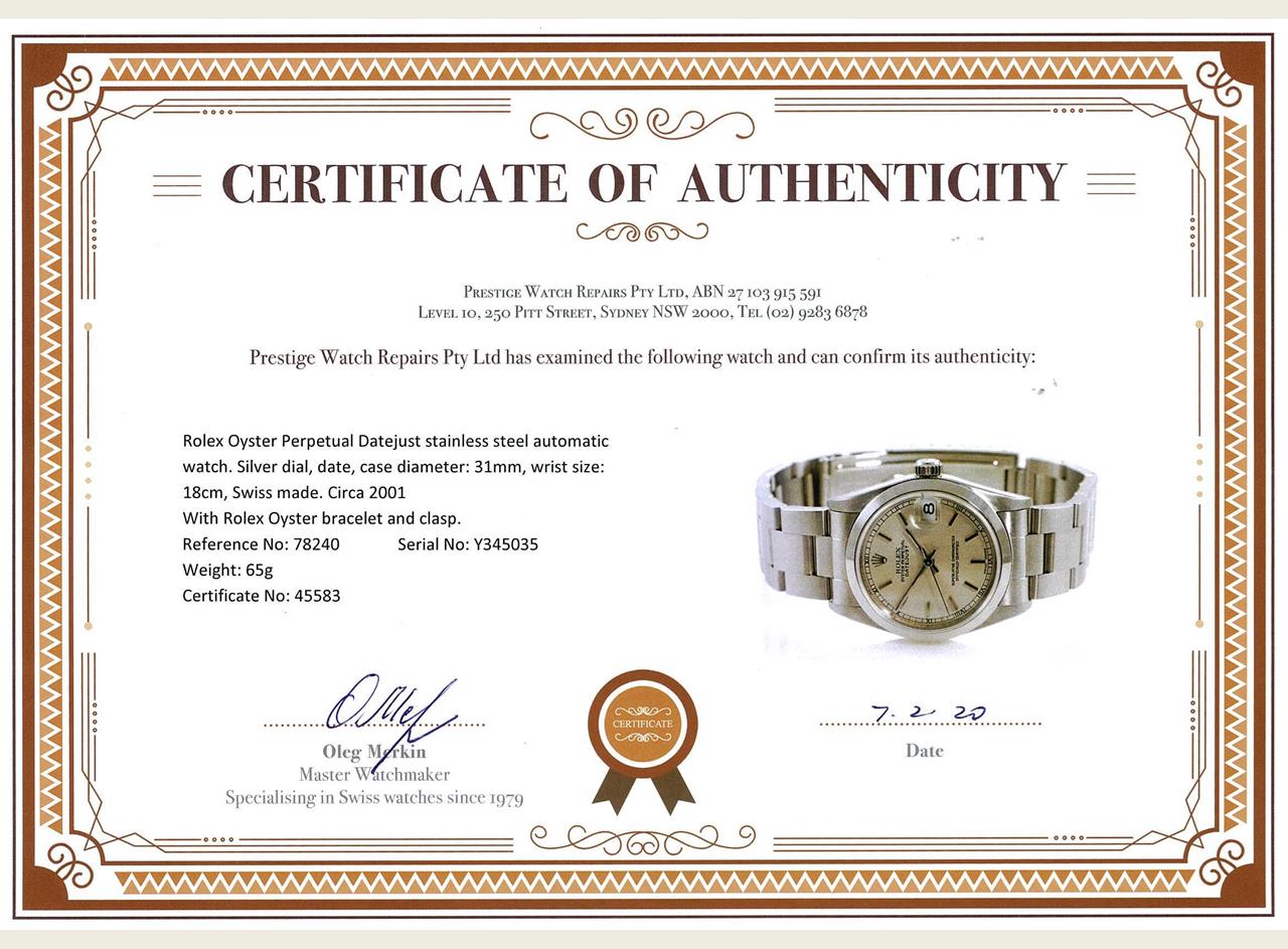 Rolex Oyster Perpetual Datejust stainless steel automatic watch. Silver dial, date, case diameter: 31mm, wrist size: 18cm, Swiss made. Ref# 78240, Circa: 2001. With Rolex Oyster bracelet and clasp. With certificate of authenticity. With Rolex guarantee certificate dated 03/11/03 & Rolex box. 3 month FSA warranty. (Pre-owned)