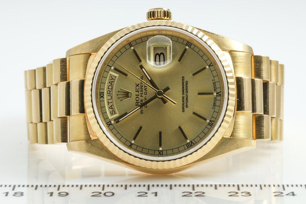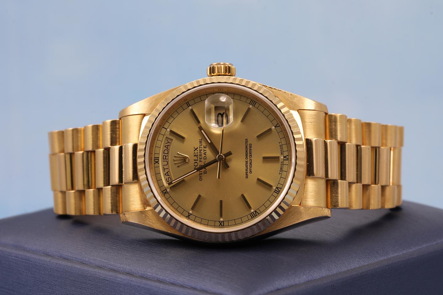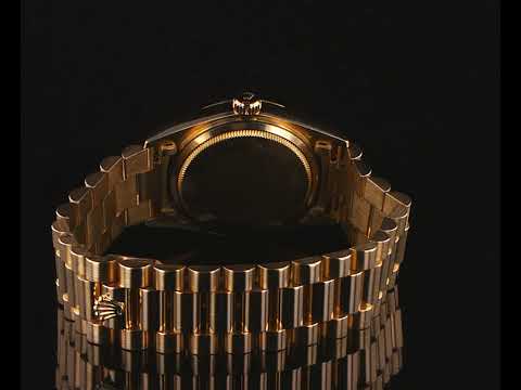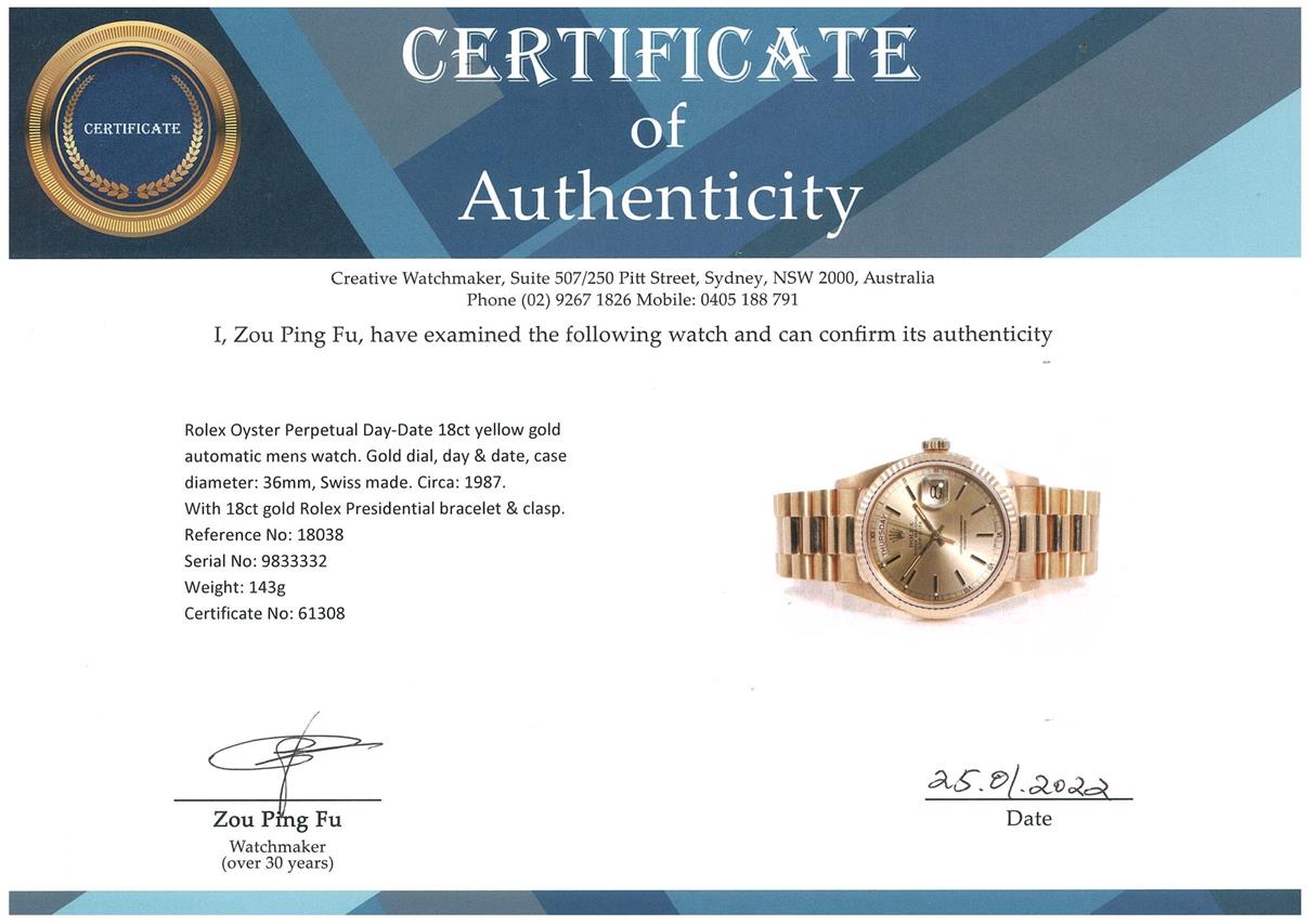 Rolex Oyster Perpetual Day-Date 18ct yellow gold automatic mens watch. Gold dial, day & date, case diameter: 36mm, wrist size: 18cm, Swiss made. Ref# 18038, Circa: 1987. With 18ct yellow gold Rolex Presidential bracelet & clasp. With Certificate of Authenticity, Rolex Guarantee Certificate dated 3/2/1988 and Rolex box. 6 month Creative Watchmaker Warranty from the date of full service. (Pre-owned)