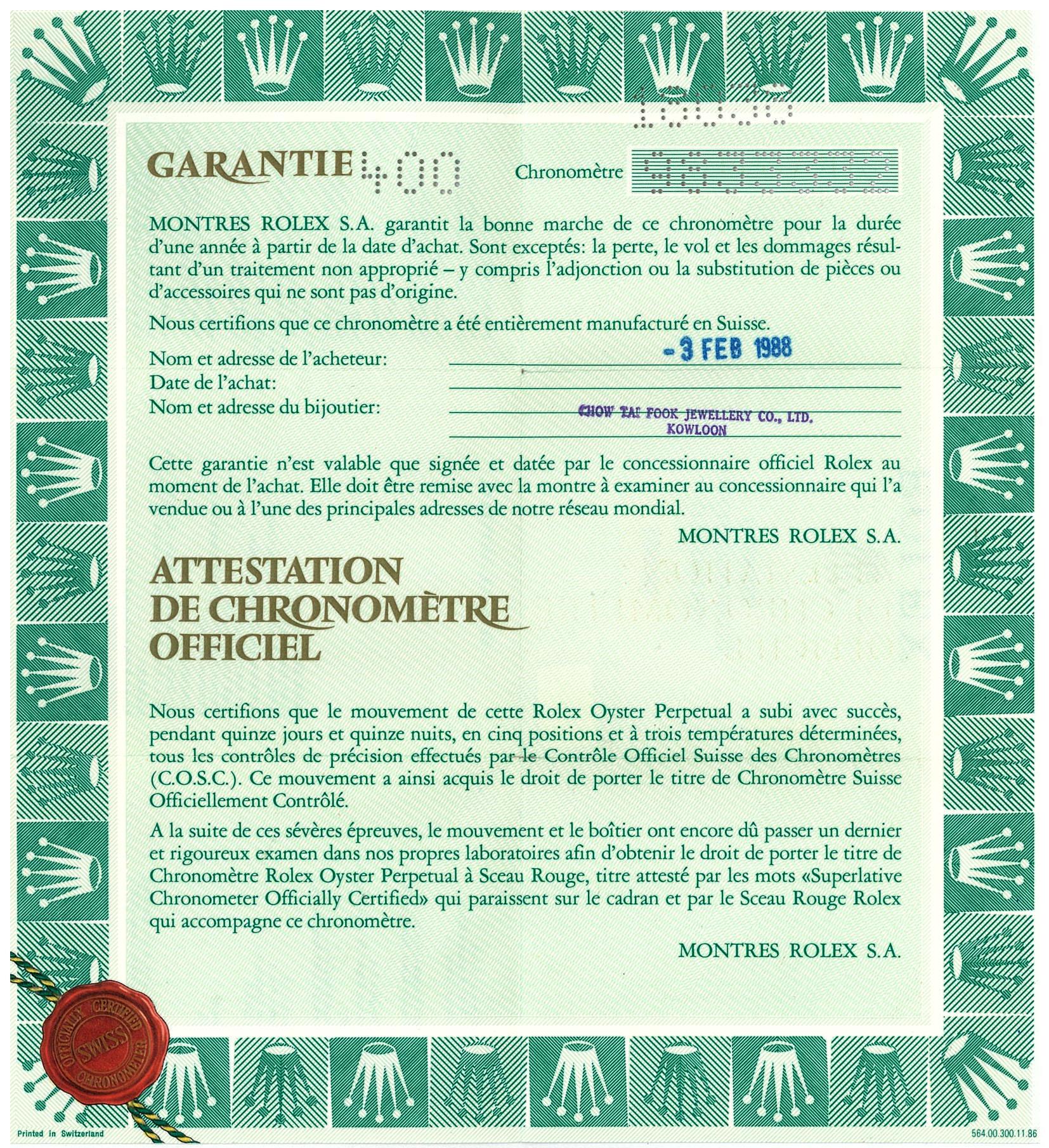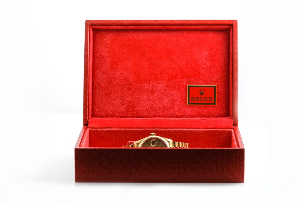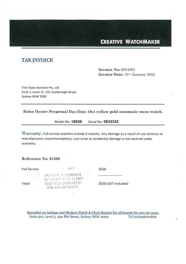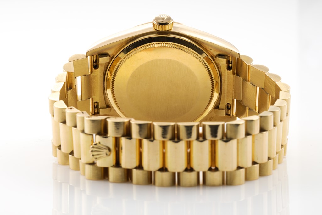 Rolex Oyster Perpetual Day-Date 18ct yellow gold automatic mens watch. Gold dial, day & date, case diameter: 36mm, wrist size: 18cm, Swiss made. Ref# 18038, Circa: 1987. With 18ct yellow gold Rolex Presidential bracelet & clasp. With Certificate of Authenticity, Rolex Guarantee Certificate dated 3/2/1988 and Rolex box. 6 month Creative Watchmaker Warranty from the date of full service. (Pre-owned)