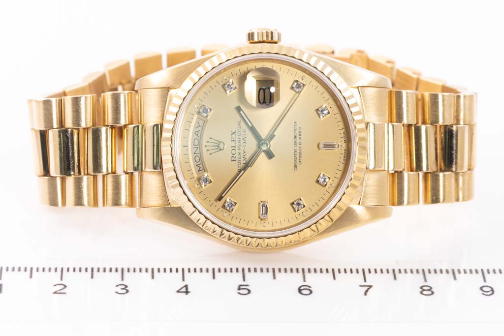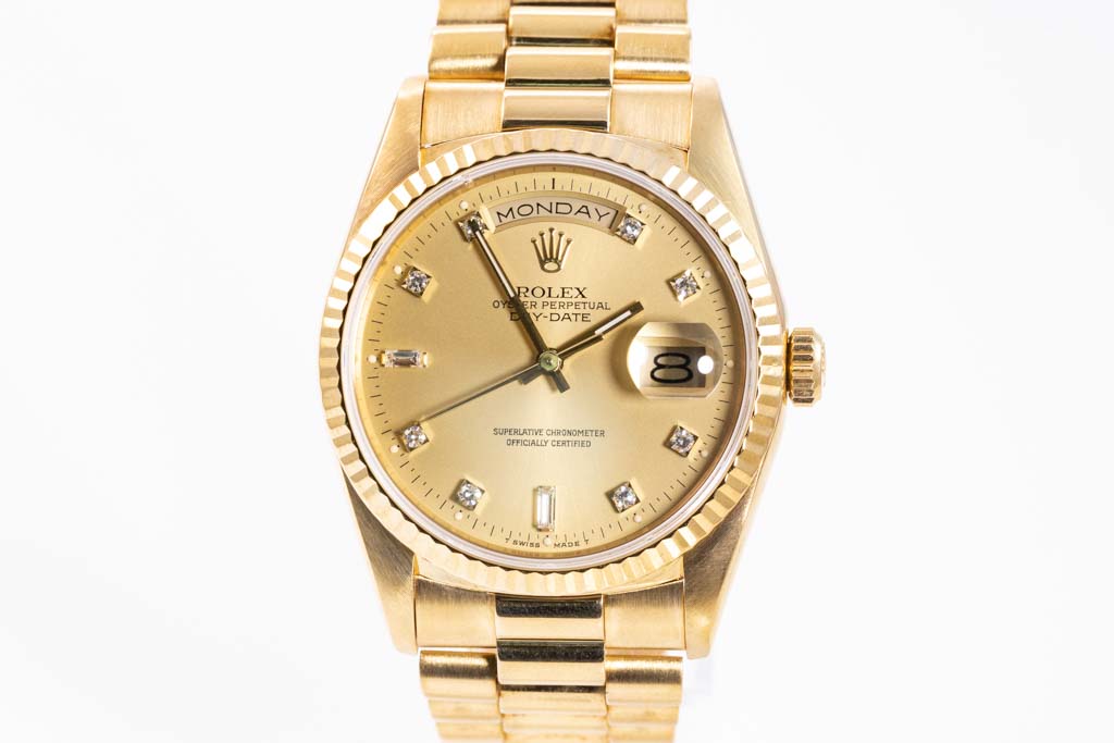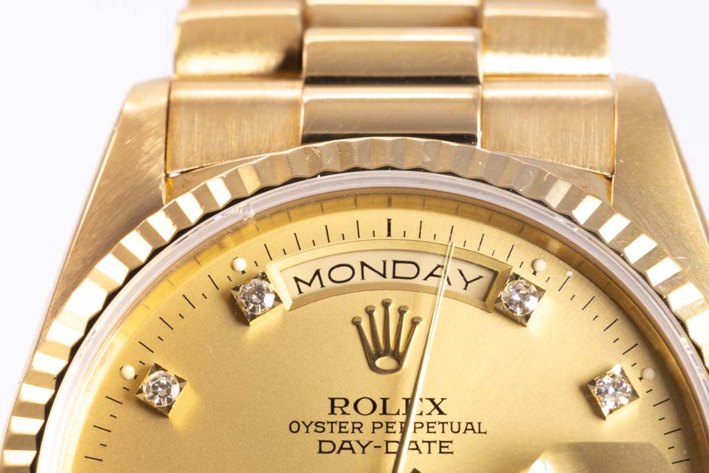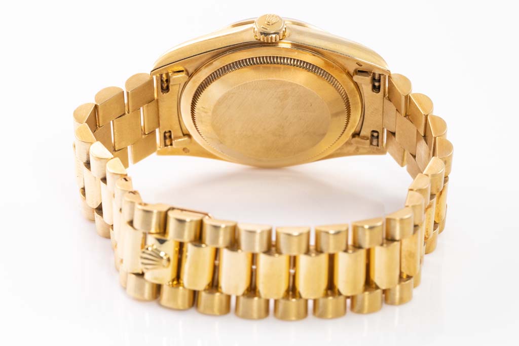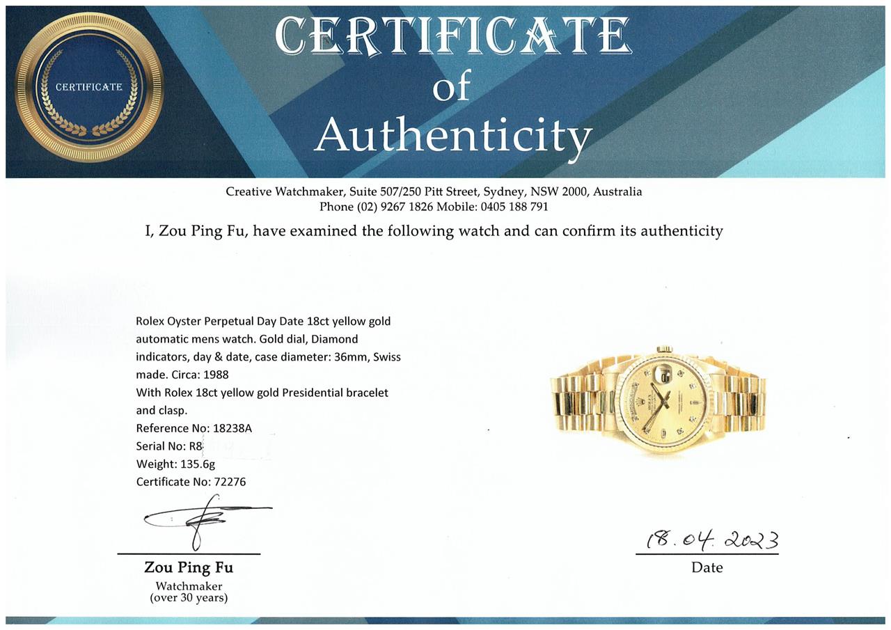 Rolex Oyster Perpetual Day Date 18ct yellow gold automatic mens watch. Gold dial, Diamond indicators, day & date, case diameter: 36mm, wrist size: 17.5cm, Swiss made. Ref# 18238A. Circa: 1988. With Rolex 18ct yellow gold Presidential bracelet and clasp. With Certificate of Authenticity and Rolex box. 6 month Creative Watchmaker warranty from the date of full service. (Pre-owned)
