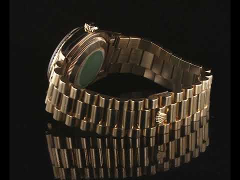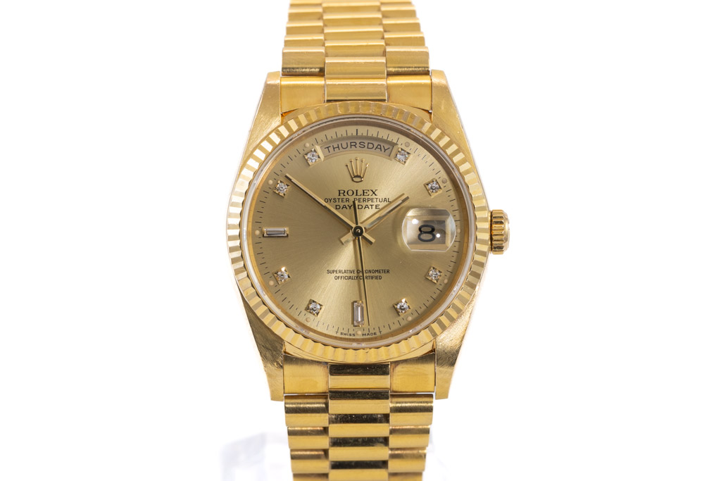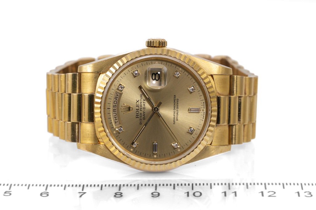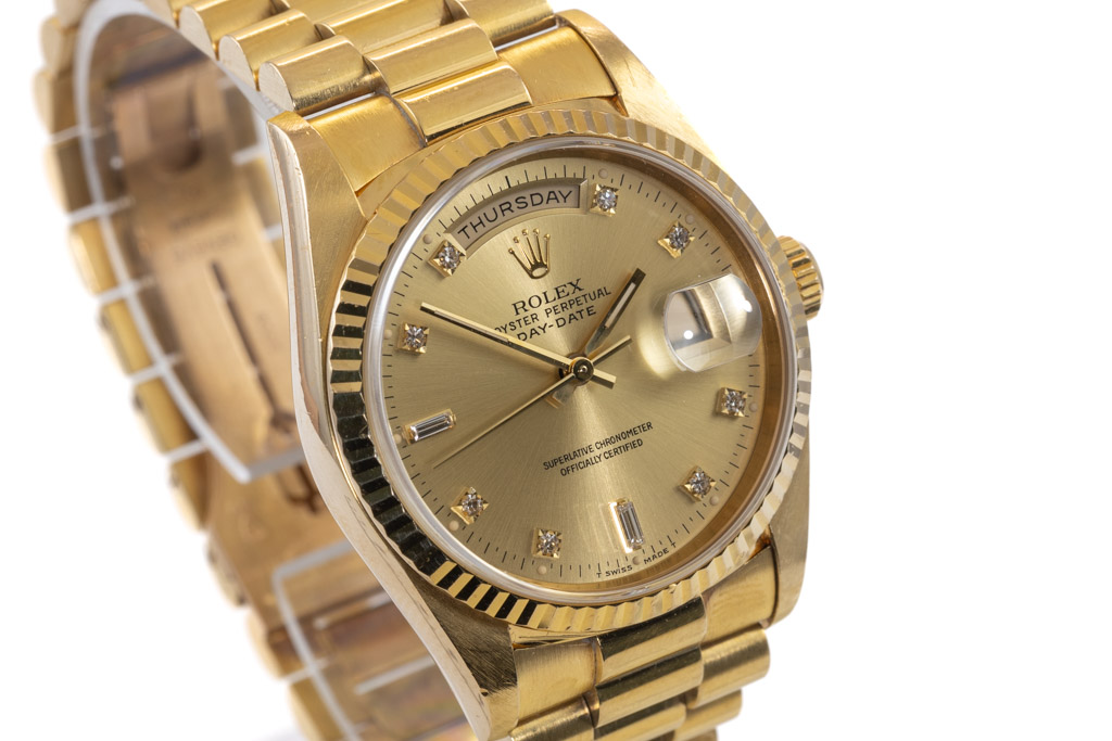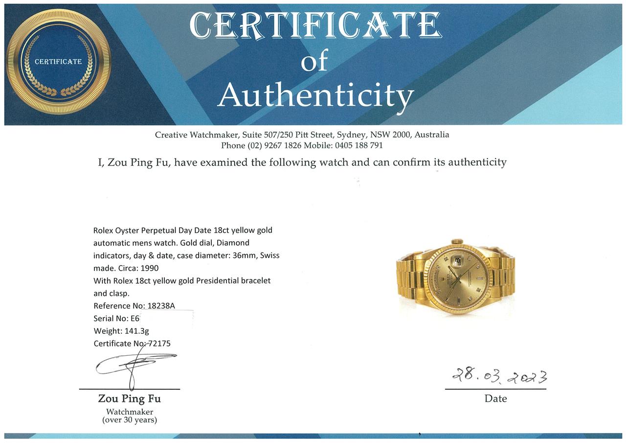 Rolex Oyster Perpetual Day Date 18ct yellow gold automatic mens watch. Gold dial, Diamond indicators, day & date, case diameter: 36mm, wrist size: 18.5cm, Swiss made. Ref# 18238A. Circa: 1990. With Rolex 18ct yellow gold Presidential bracelet and clasp. With Certificate of Authenticity and Rolex box. 3 month FSA warranty. (Pre-owned)