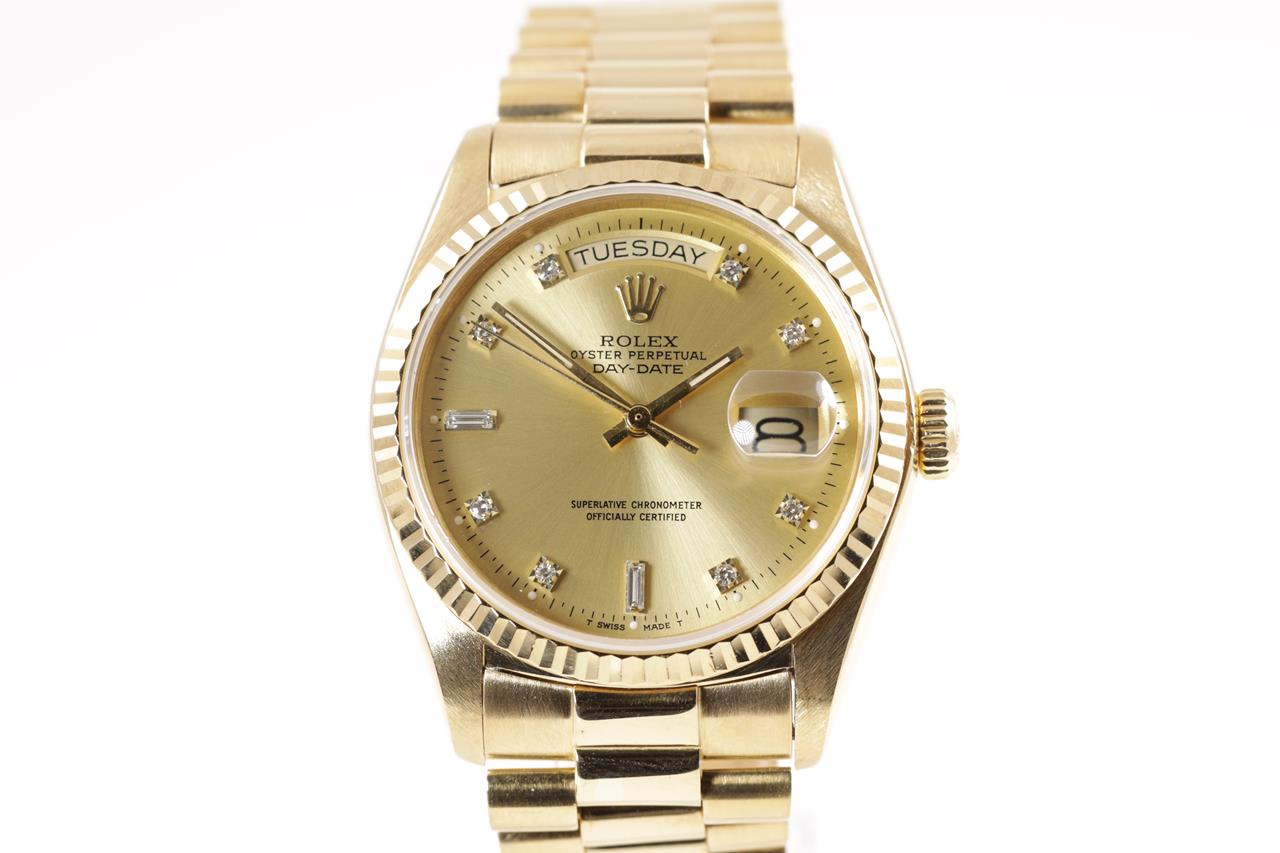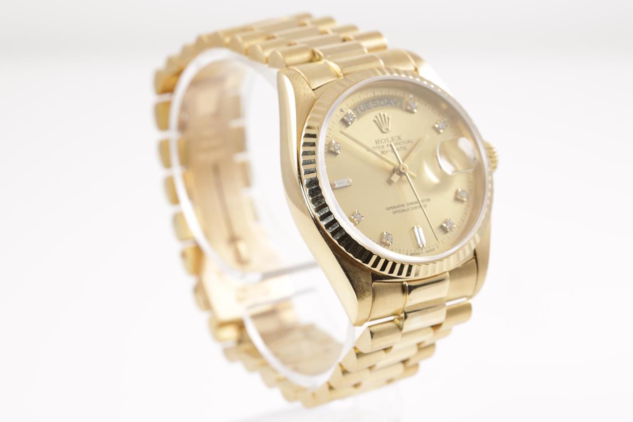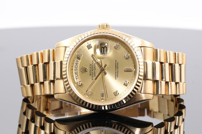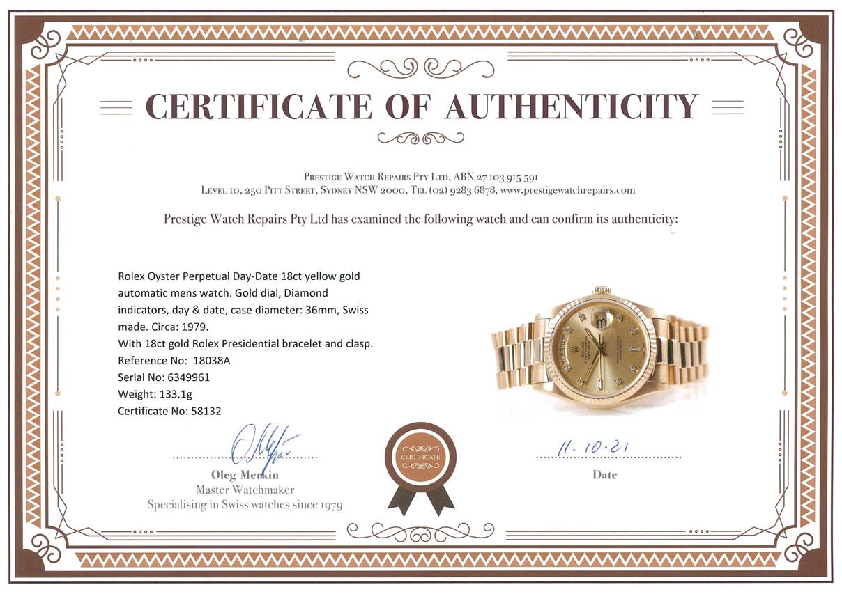 Rolex Oyster Perpetual Day-Date 18ct yellow gold automatic mens watch. Gold dial, Diamond indicators, day & date, case diameter: 36mm, wrist size: 17cm, Swiss made. Ref# 18038A. Circa: 1979. With 18ct gold Rolex Presidential bracelet and clasp. With certificate of authenticity & Rolex box. 3 month FSA warranty. (Pre-owned)