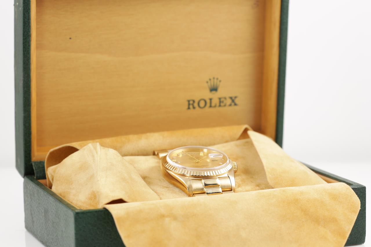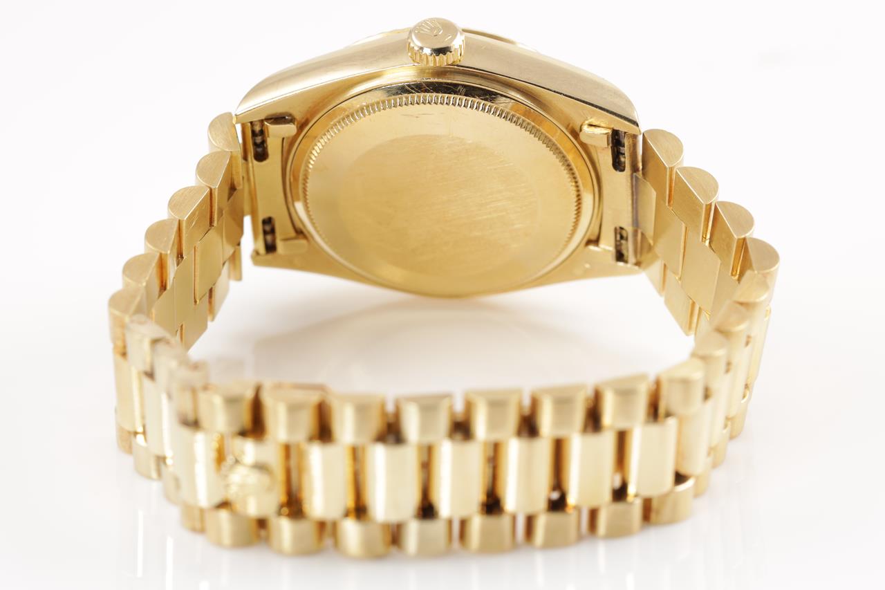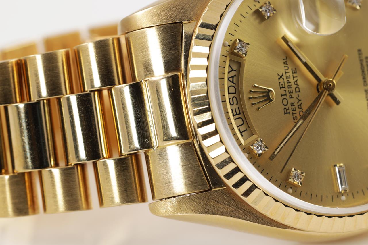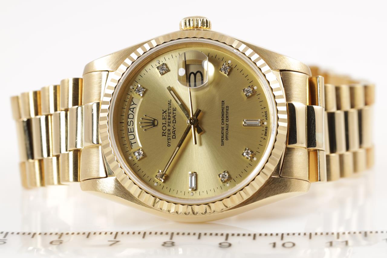 Rolex Oyster Perpetual Day-Date 18ct yellow gold automatic mens watch. Gold dial, Diamond indicators, day & date, case diameter: 36mm, wrist size: 17cm, Swiss made. Ref# 18038A. Circa: 1979. With 18ct gold Rolex Presidential bracelet and clasp. With certificate of authenticity & Rolex box. 3 month FSA warranty. (Pre-owned)