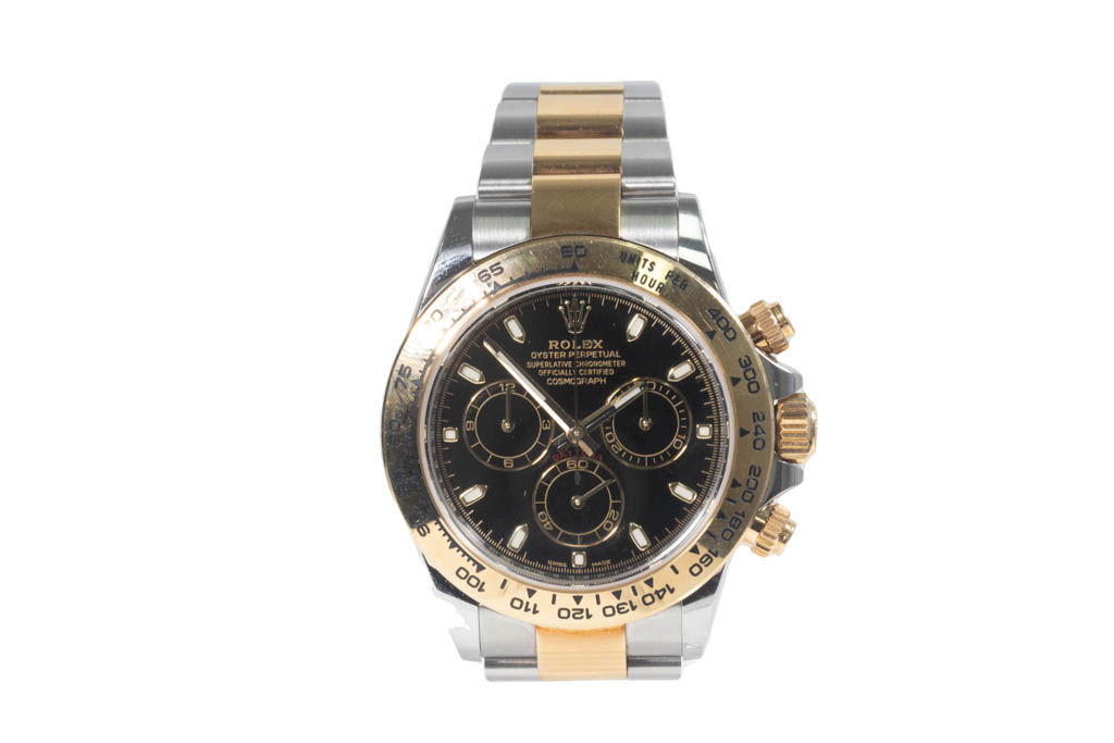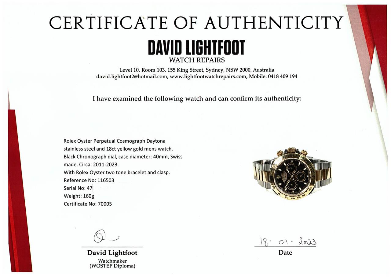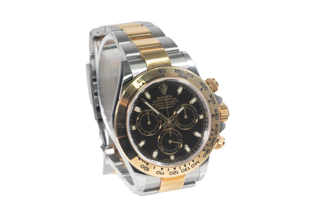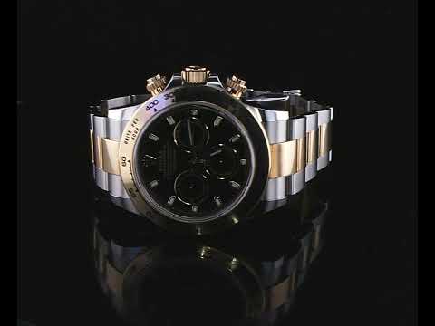 Rolex Oyster Perpetual Cosmograph Daytona stainless steel and 18ct yellow gold mens watch. Black Chronograph dial, case diameter: 40mm, wrist size: 18cm, Swiss made. Ref# 116503. Circa: 2011-2023. With Rolex Oyster two tone bracelet and clasp. With Certificate of Authenticity and Rolex box. 3 month FSA warranty. (Pre-owned)