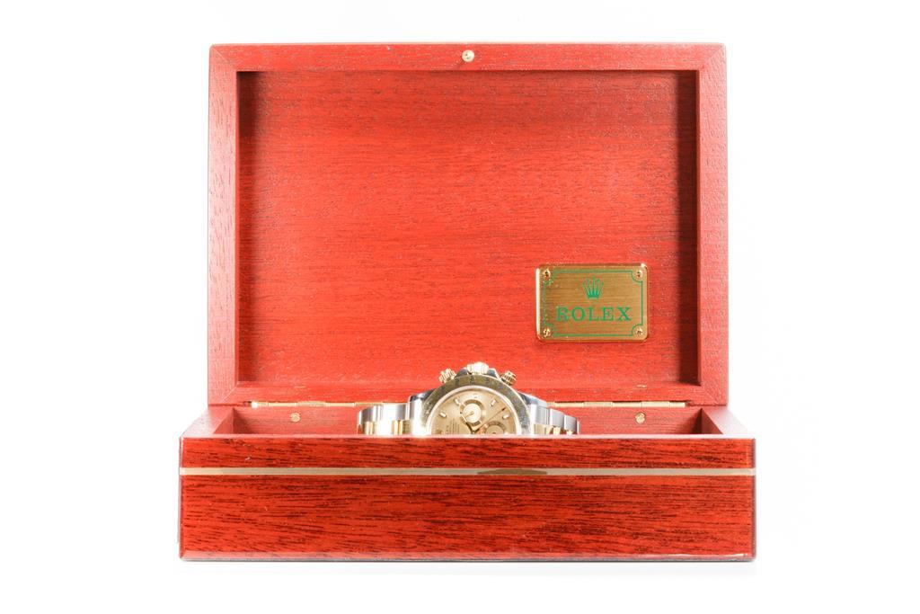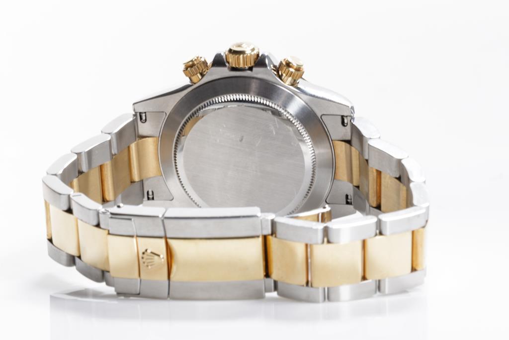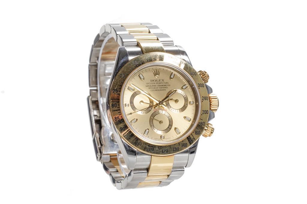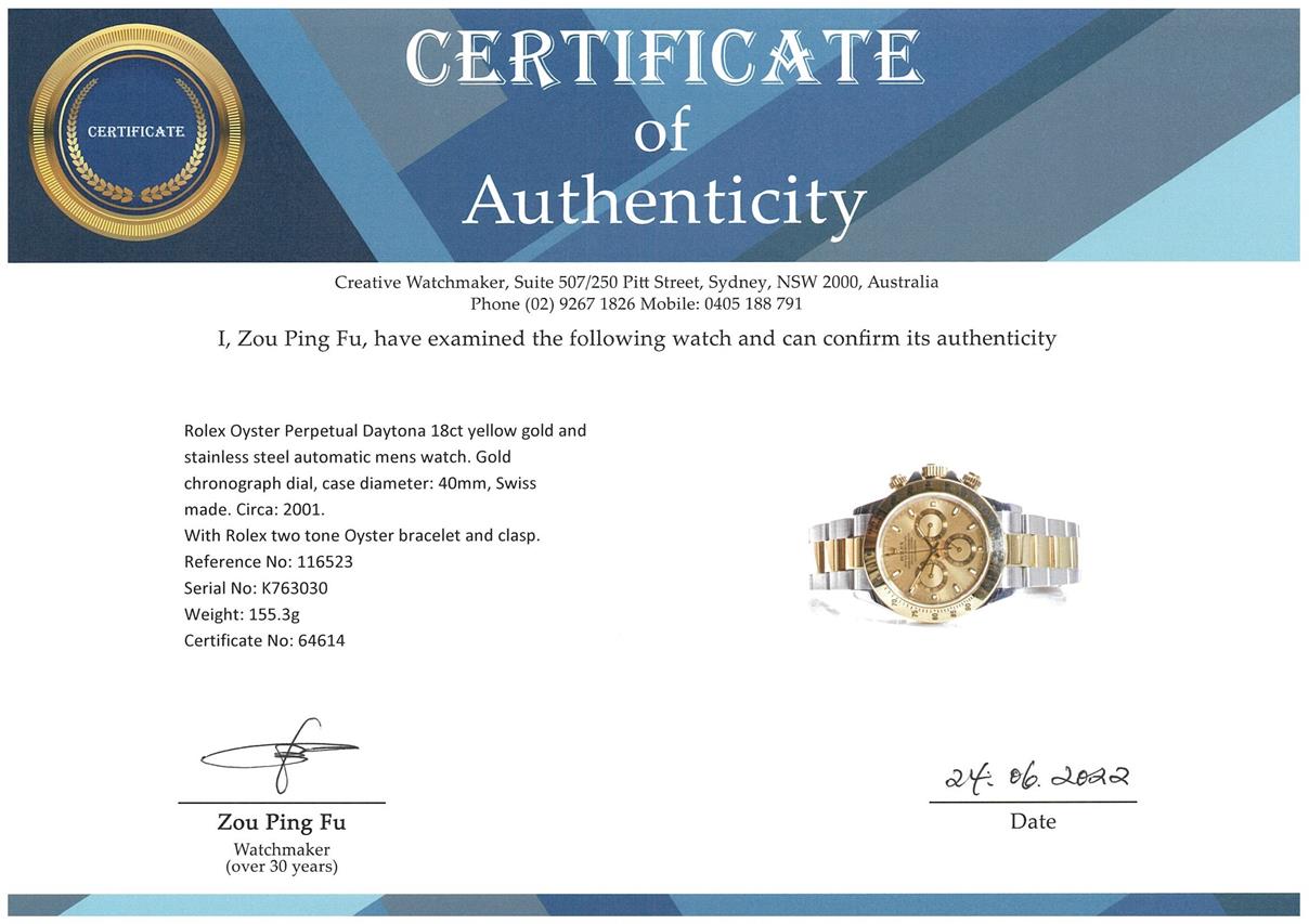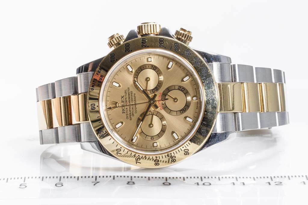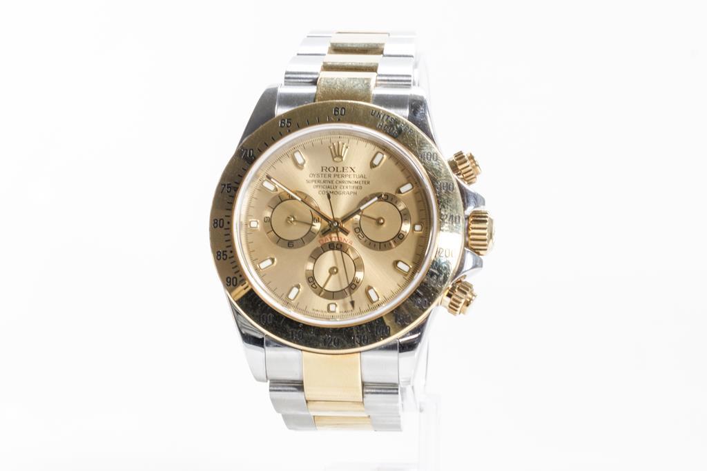 Rolex Oyster Perpetual Daytona 18ct yellow gold and stainless steel automatic mens watch. Gold chronograph dial, case diameter: 40mm, wrist size: 18cm, Swiss made. Circa: 2001. Ref# 116523. With Rolex two tone Oyster bracelet and clasp. With Certificate of Authenticity, Rolex Guarantee Certificate dated 09/2002 and Rolex box. 3 month FSA warranty. (Pre-owned)